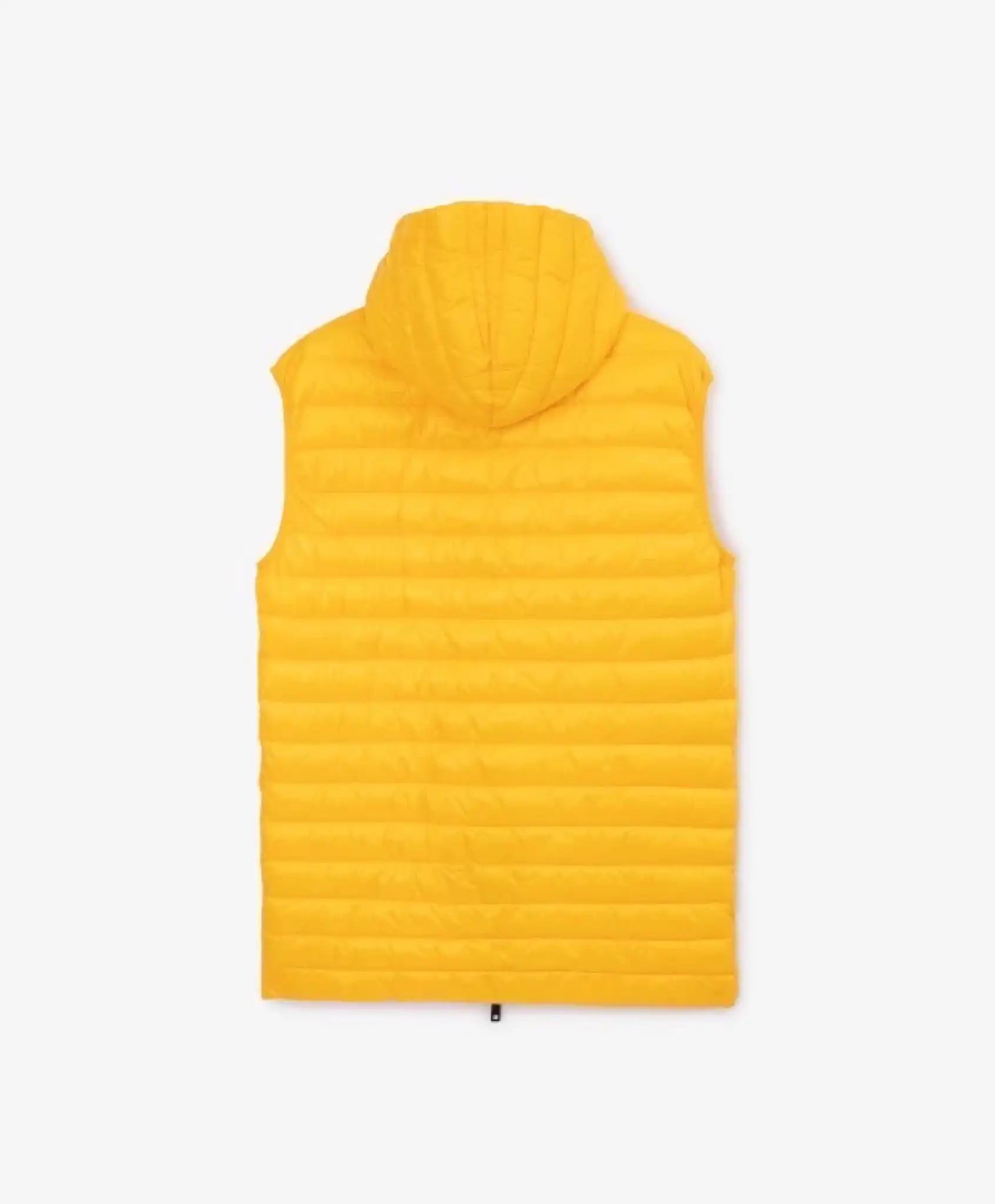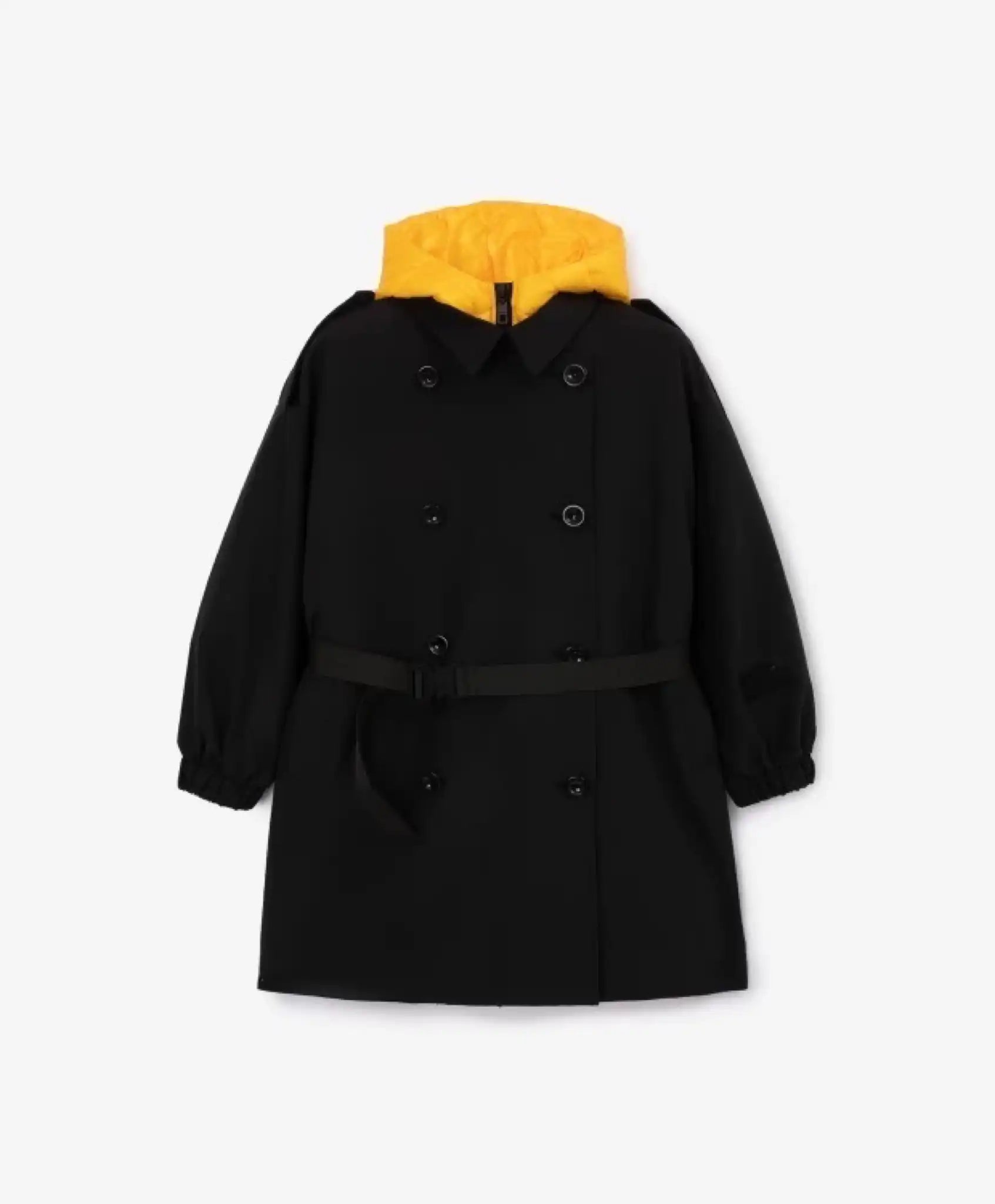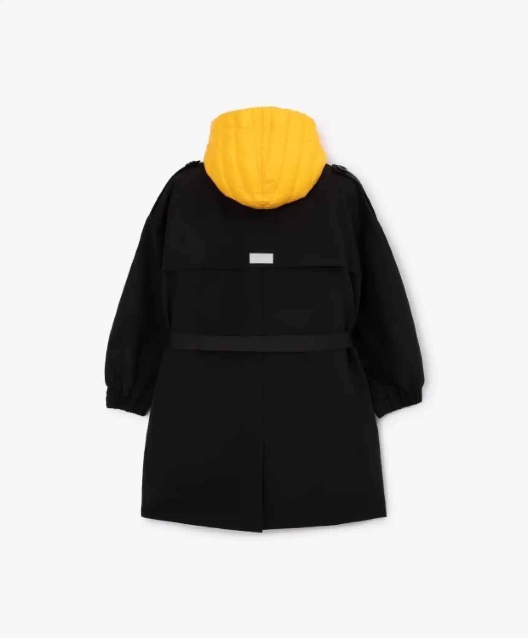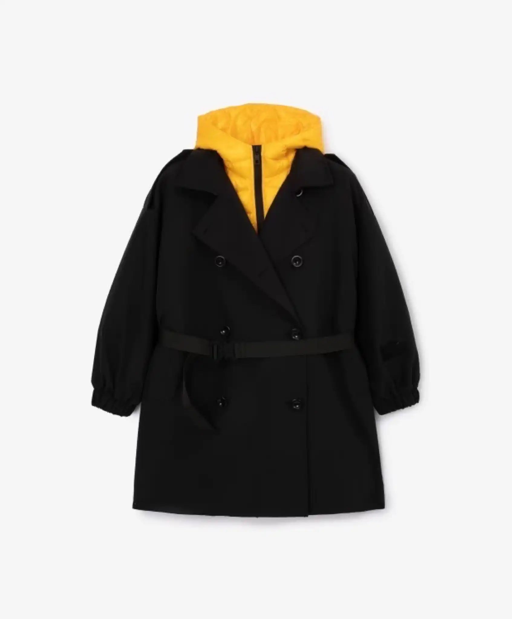 Демисезонното палто е две в едно! Жълтата ватирана изолирана жилетка с качулка, която може да се носи като самостоятелна част, служи като подложка за красив черен тренчкот, създавайки удобен и елегантен комплект! Свободната форма, падналото рамо, плътният прилепнал по тялото макинтос, двуредното закопчаване с копчета правят тренчкота модерен, съвременен, идеално вписващ се в стилния гардероб на момичето. Яркожълтата подплата добавя радост и позитивизъм към целия продукт, превръщайки палтото в акцент на пролетния образ. Палтото има широк плетен колан, закопчан с метална катарама.