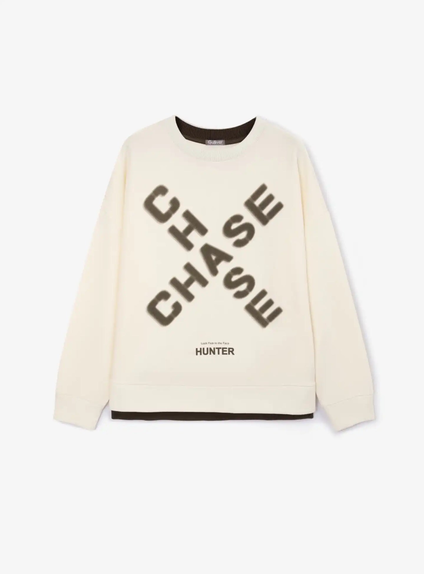 Млечният суитчър с обемна форма и паднало рамо е идеален компонент на пролетно-летния гардероб за всеки ден. Подчертаната линия на гърба, прорезите в страничните шевове правят момчешкия силует спокоен и непринуден. Интересната декорация със стилна лепенка и принт с едър шрифт, илюстриращ тенденцията за глич ефект (глич: разместване, неяснота, размазване на изображението), придава на модела ярки индивидуални черти. Контрастният принт се поддържа от вътрешната част на врата и реброто в задната част на дрехата.