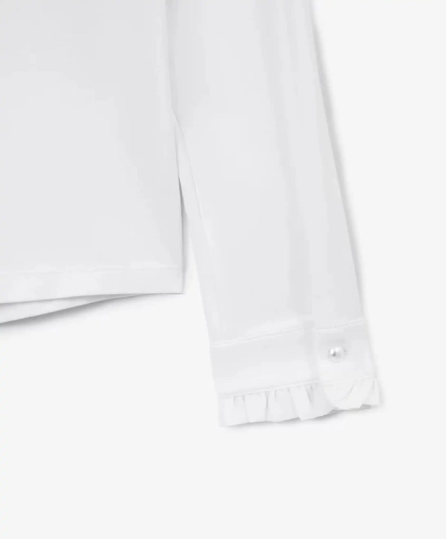 Бяла трикотажна блуза с полуоблечен силует - чудесна алтернатива на текстилната блуза или риза. Много мека, еластична, приятна на допир, блузата добре запазва формата си, лесна е за употреба и поддръжка. Декорацията на блузата е деликатно дантелено жабо. В комбинация с дантела на яката и перлени копчета, жабото изглежда много официално, придавайки на блузата елегантност и изисканост.