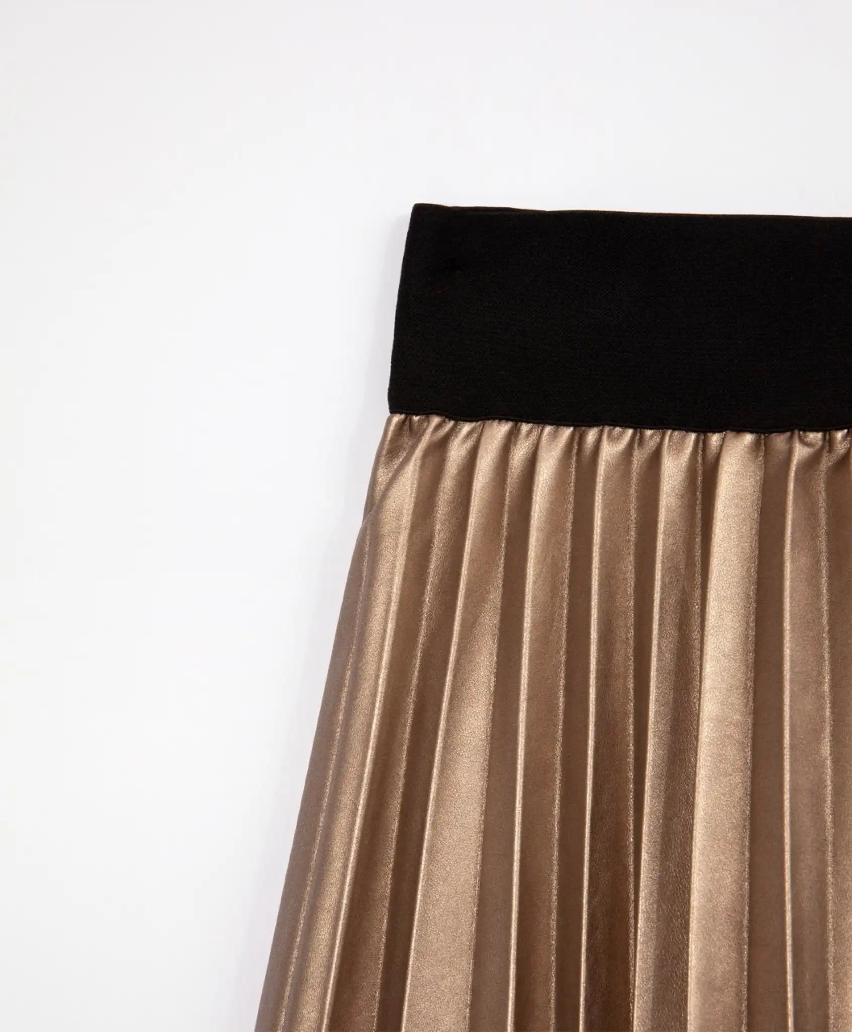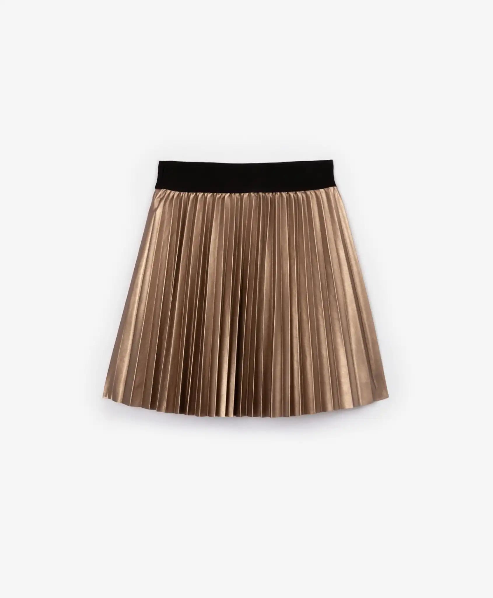 Плисираната пола винаги изглежда стилно, елегантно, изискано! Изработена от мека златиста изкуствена кожа с изразителна гланцова текстура, полата ще внесе в образа на момичето свежест и новост. Коланът от широка еластична лента осигурява мекота и удобство при употреба. Шелковистата подплата създава комфортно плъзгане на изделието при движение.