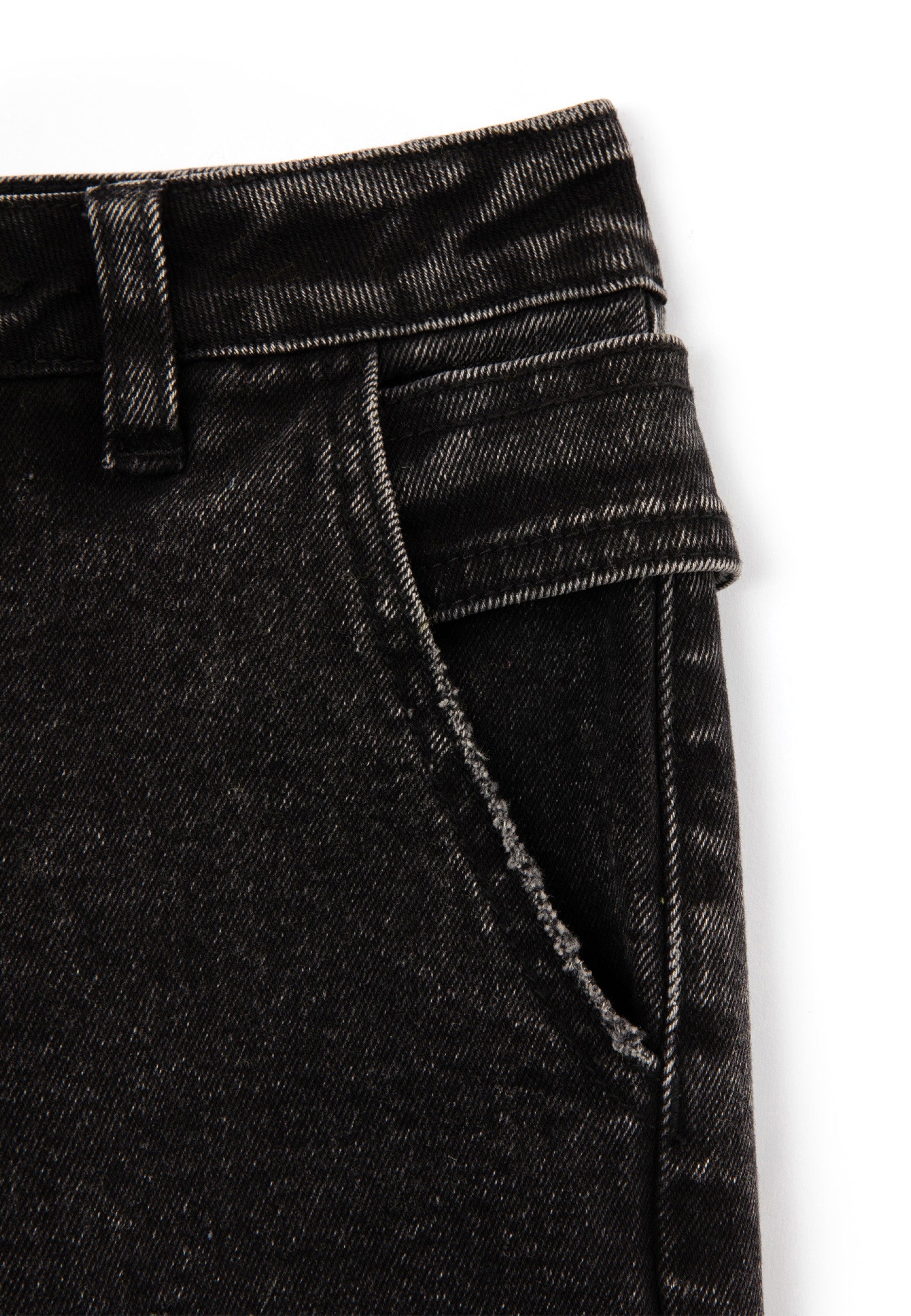 Черни дънки с висока талия и силует „Mom-fit“ – прекрасно допълнение към всяка есенна визия. Изработени са от плътен деним с високо съдържание на памук. Благодарение на еластана, дънките са еластични и прилягат отлично на всяка фигура. Имат пет джоба и две декоративни гайки, преминаващи от задните джобове към страничните. Този детайл прави модела интересен и оригинален.