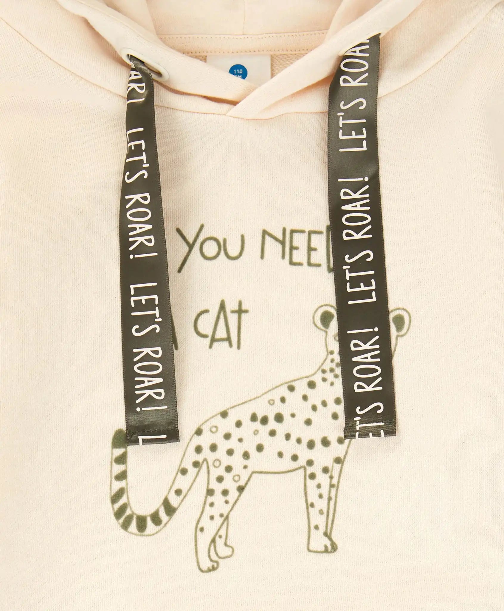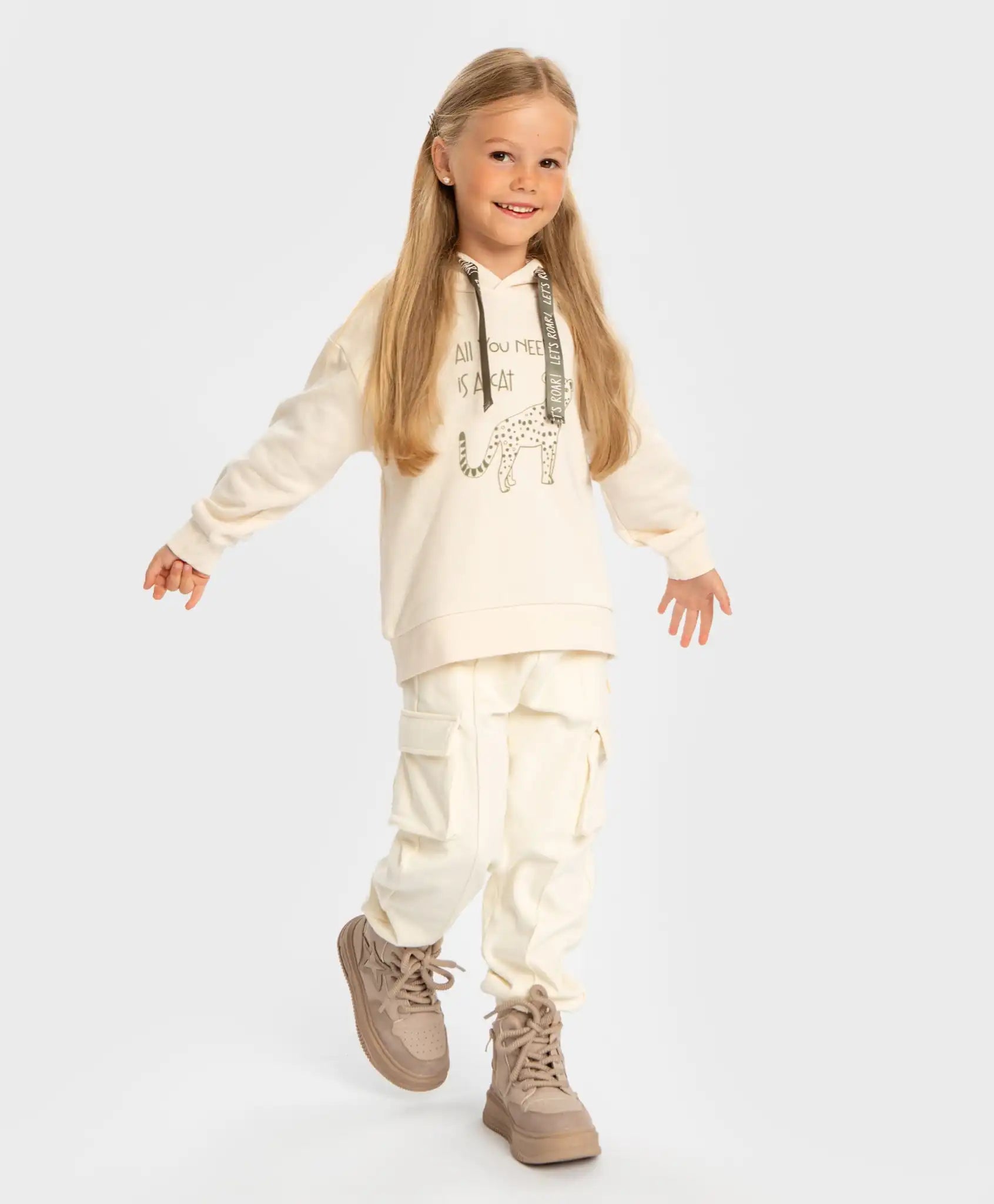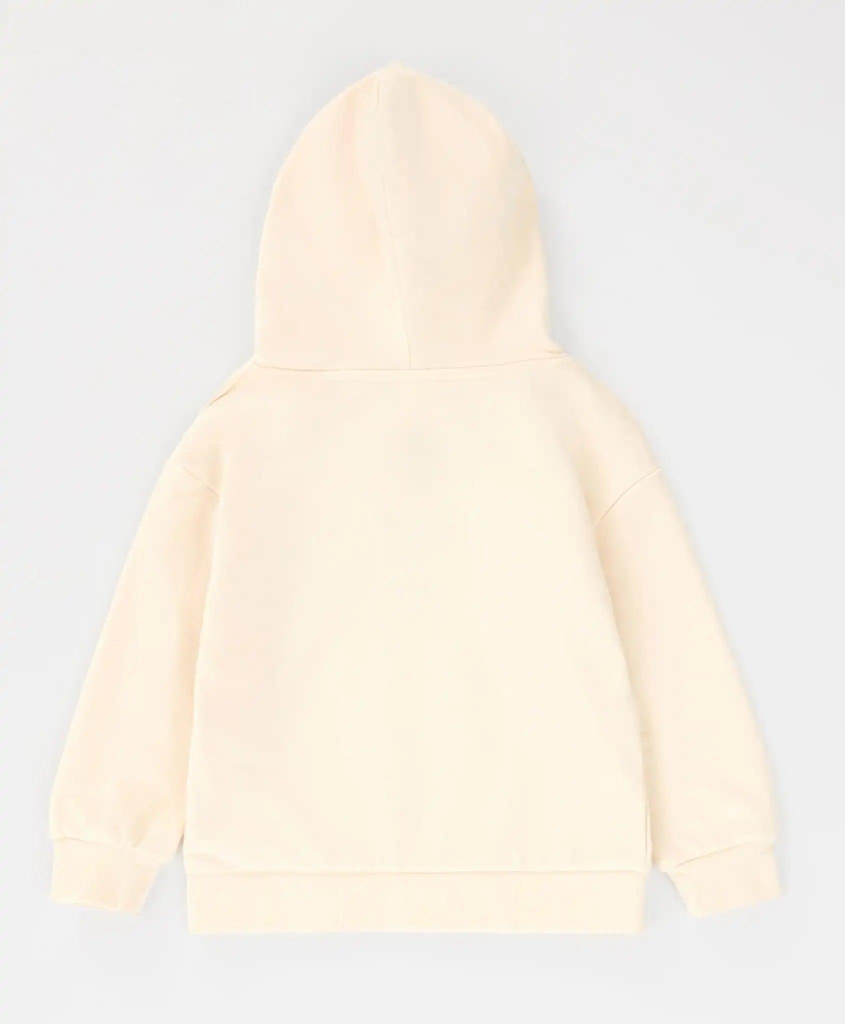 Суичър с качулка и принт за момиче в млечен цвят. Трикотажният суичър Button Blue е изработен от футерно трико без вата. Той е гладък, мек и приятен на допир. Маншетите и долната част на изделието са оформени с еластична рипсена тъкан. Едноцветният дизайн позволява комбинация с дрехи в различни нюанси. Качулката е с подплата от кулирна тъкан и сатенена връзка с принт, която предпазва главата от лошо време. Моделът е по-интересен благодарение на мек флок принт с животински мотиви. Спуснатите рамене и оверсайз кройката позволяват на децата с всякакво телосложение да се чувстват удобно в този модел. Следвайте указанията за грижа, посочени на пришития етикет.