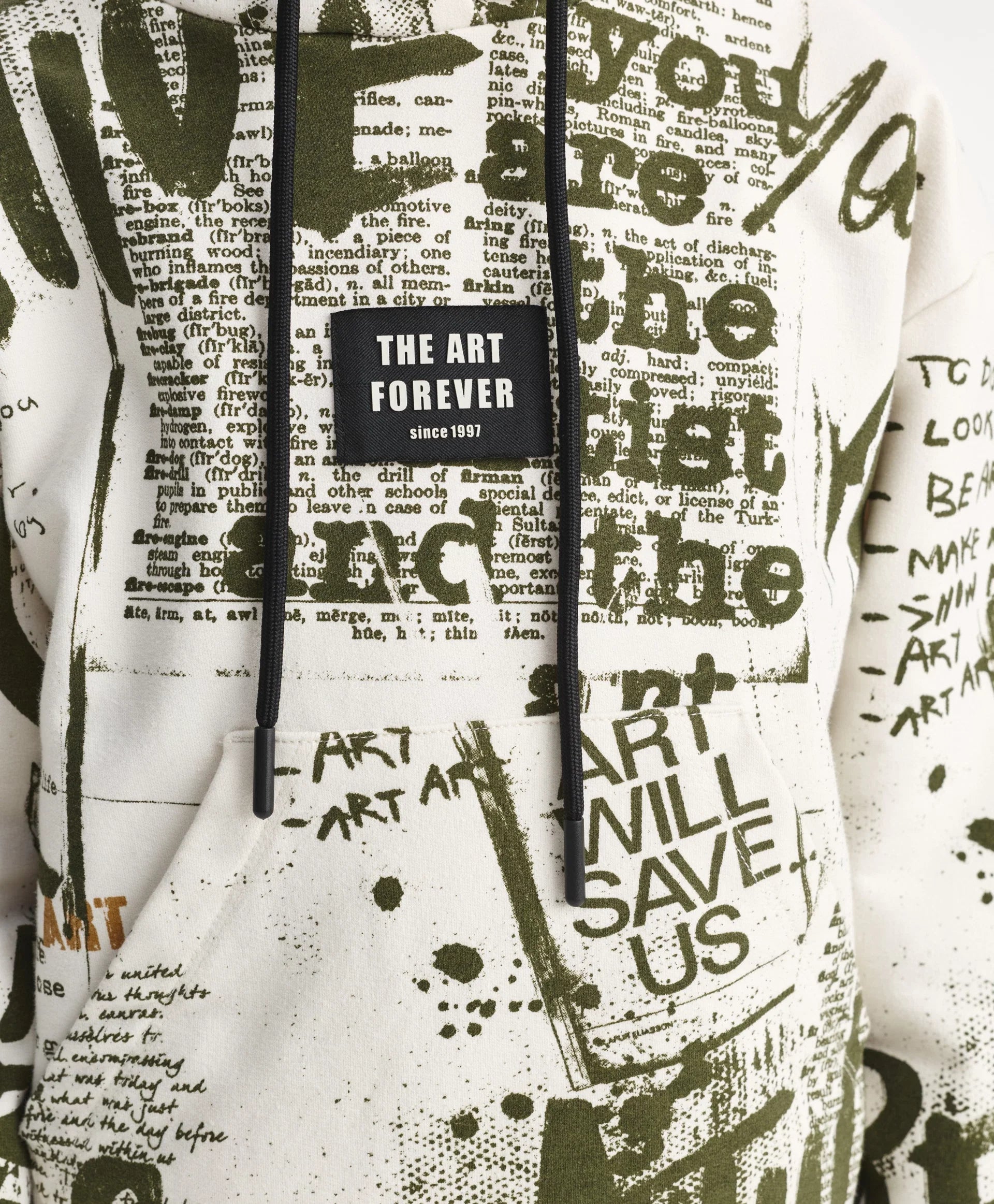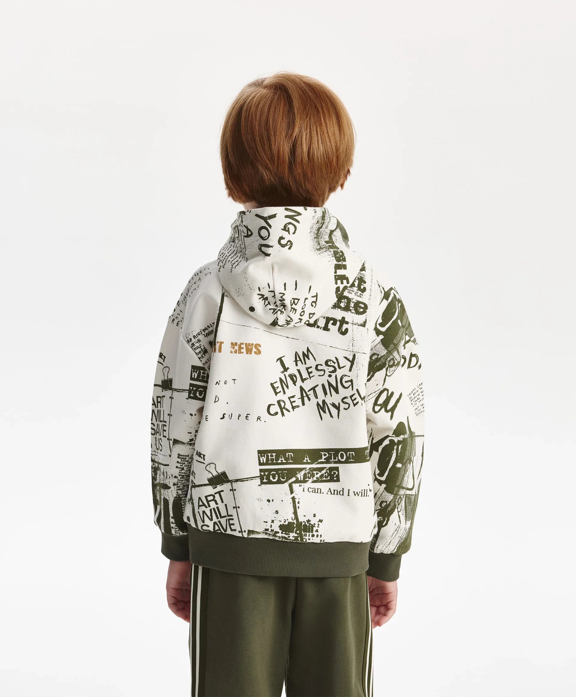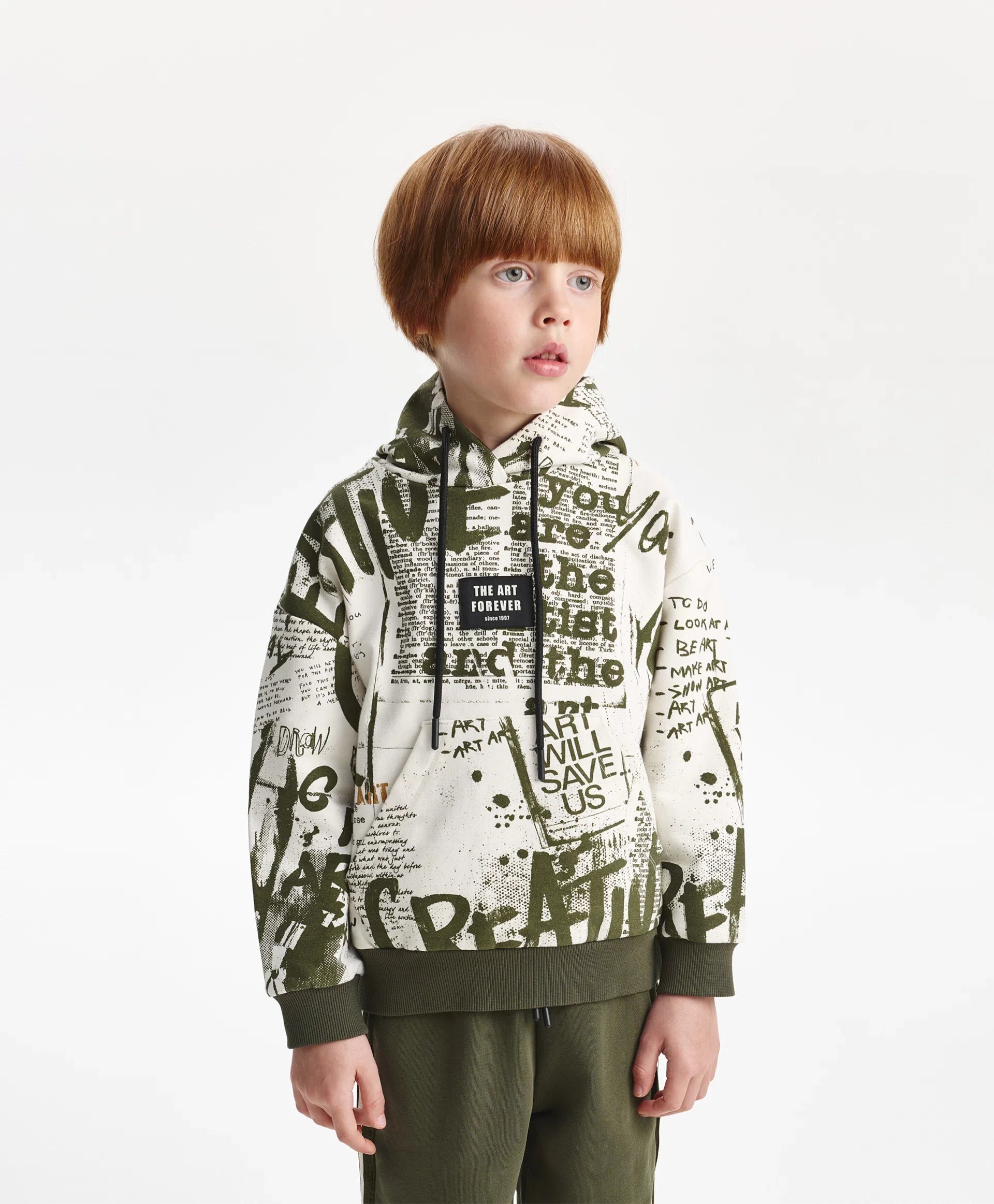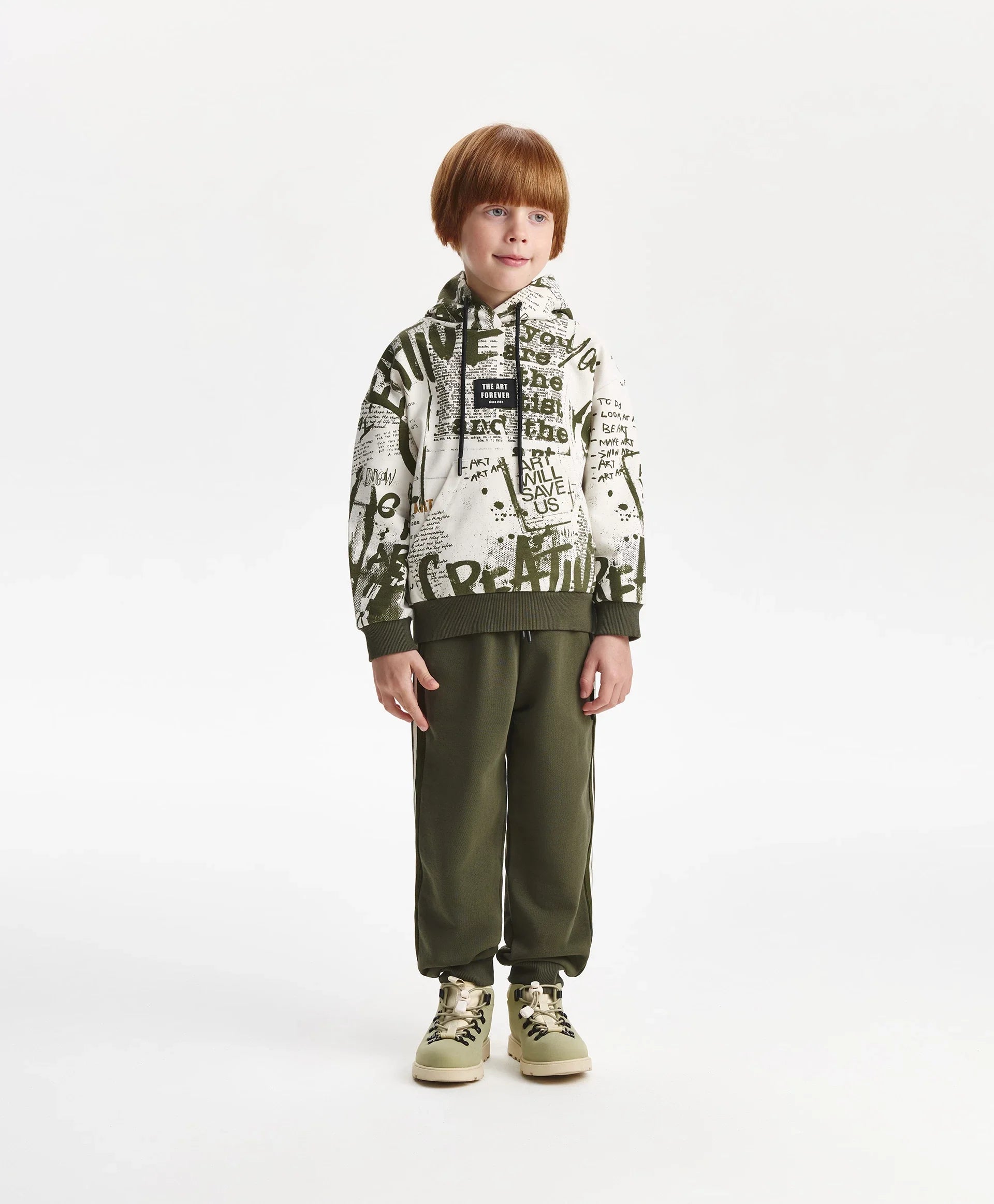 Худи с модерен динамичен шрифтов рисунък, нанесен на ръка размахано и дръзко, ще придаде на визията на момчето уникален характер, ще я направи енергична, стилна, практична и запомняща се. Худи със спусната линия на раменете, изработено от мек памучен френч-тeри с хавлиена вътрешност. Класическите детайли — качулка, кенгуру джоб, рипсени маншети и долен кант — са допълнени от оригинална нашивка, през която могат да се прекарат връзки за акцент.
