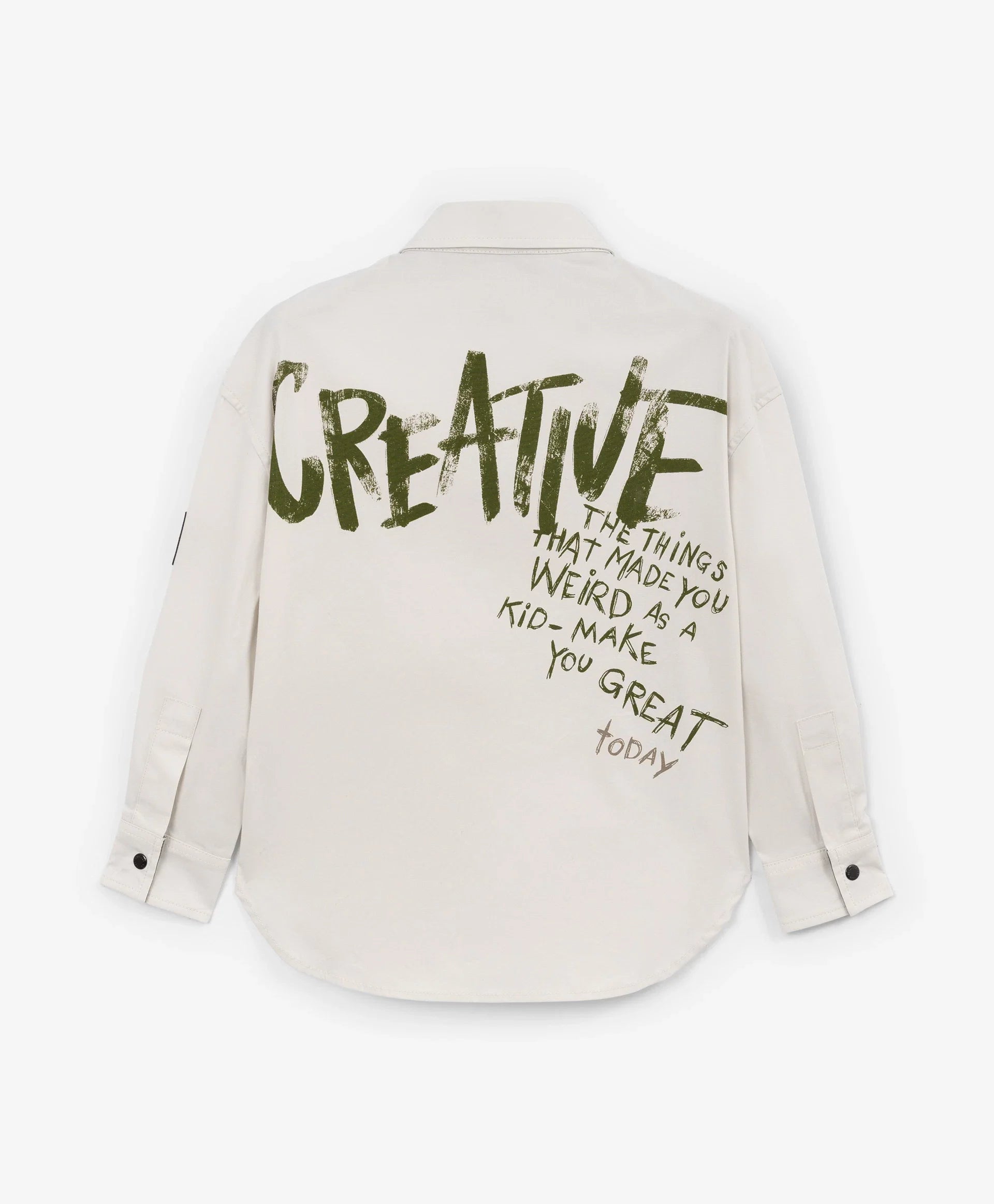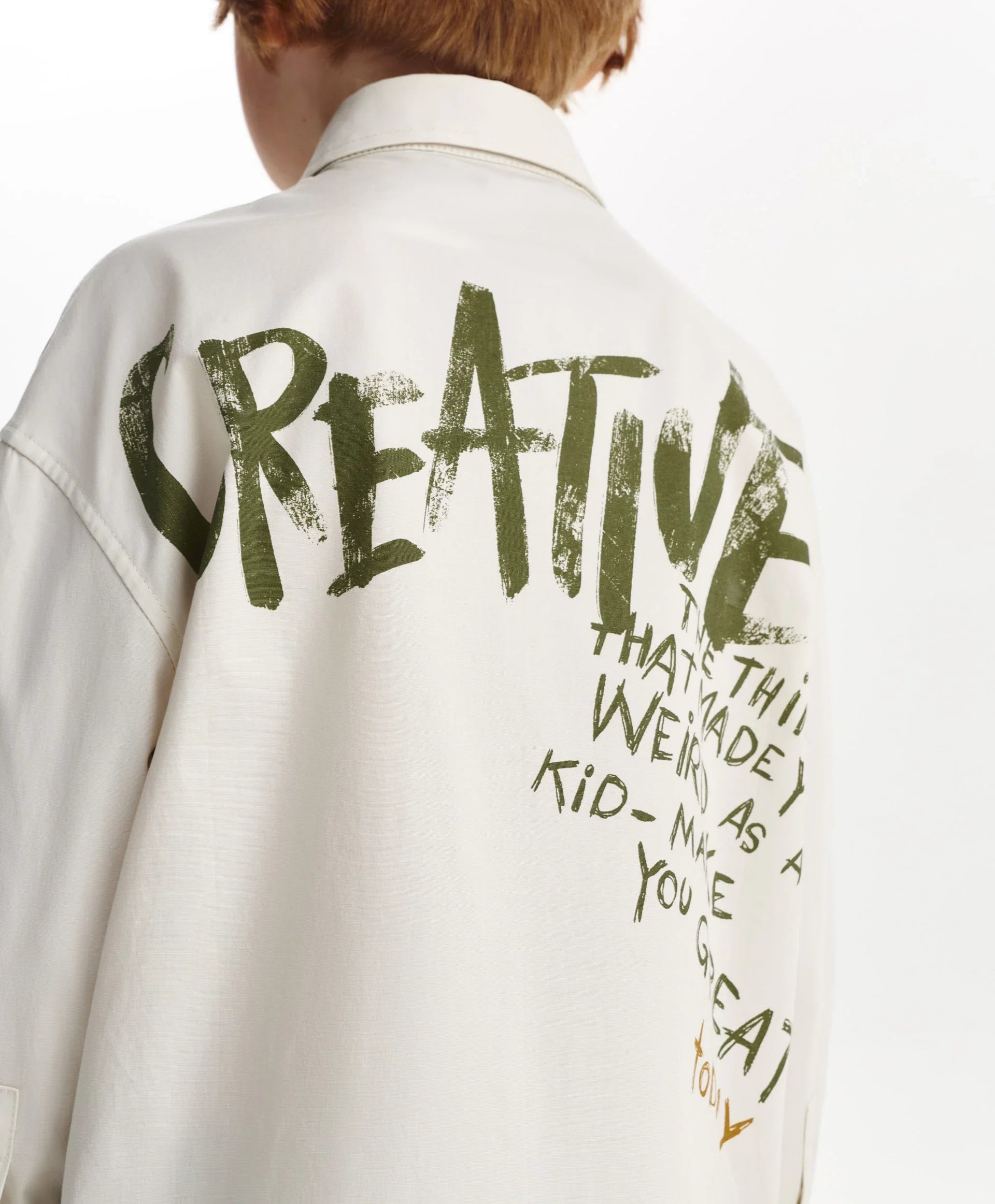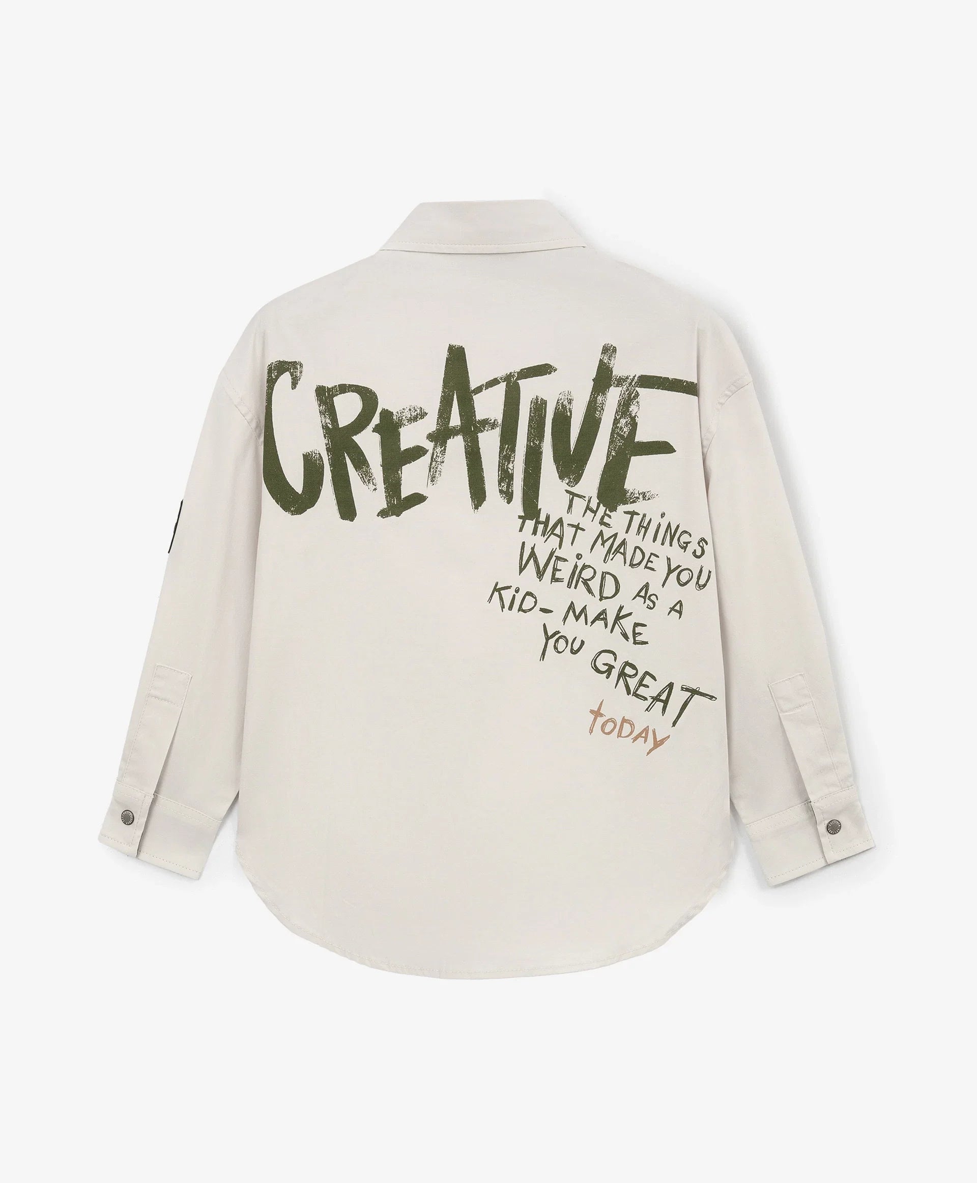 Сивата риза с прав силует и оригинален принт е ярък елемент за създаване на стилни есенни визии. С удължен гръб, изработена от мек устойчив памучен текстил. Шрифтовият рисунък, нанесен размахано и дръзко, придава уникалност и я прави енергична, стилна и идеална за модерни многопластови комплекти. Закопчава се с копчета тик-так.