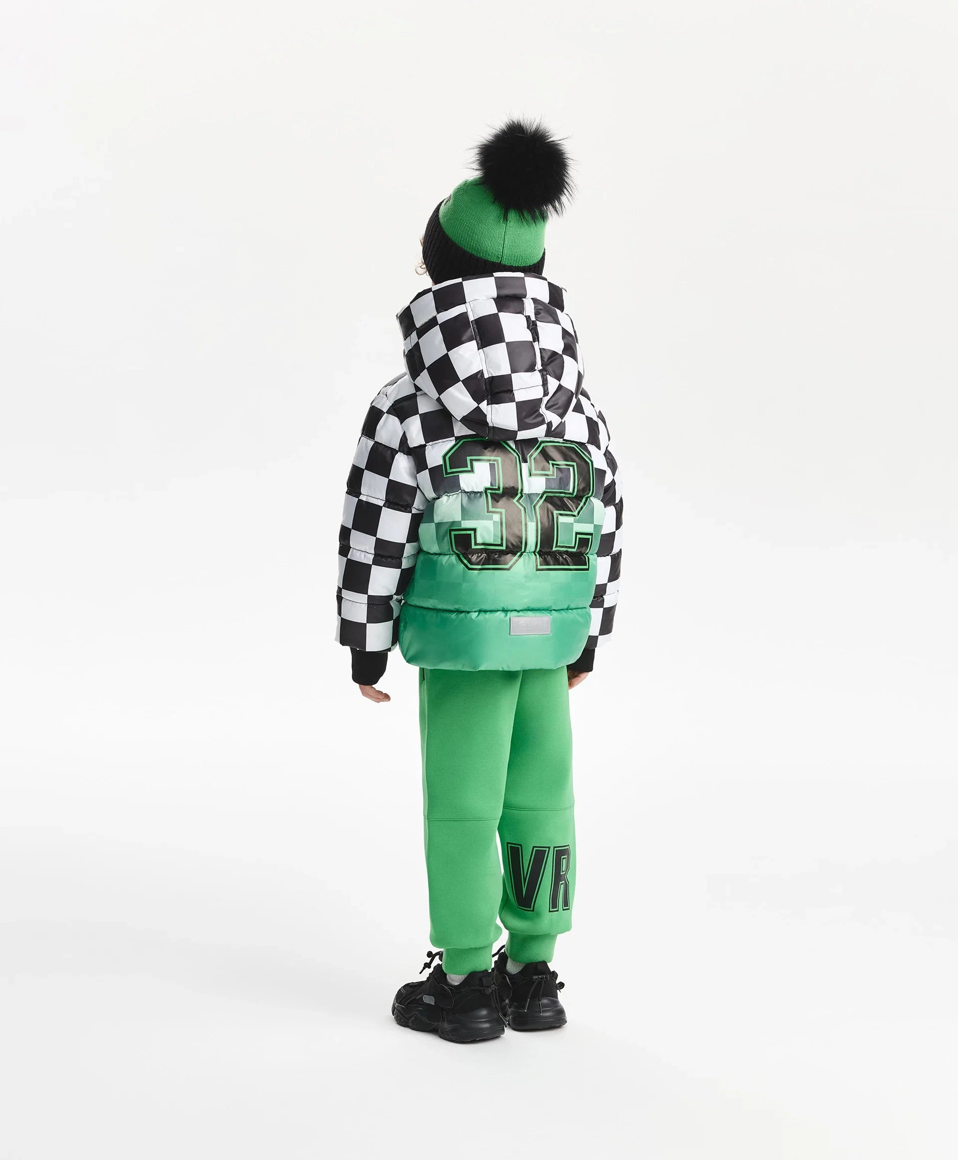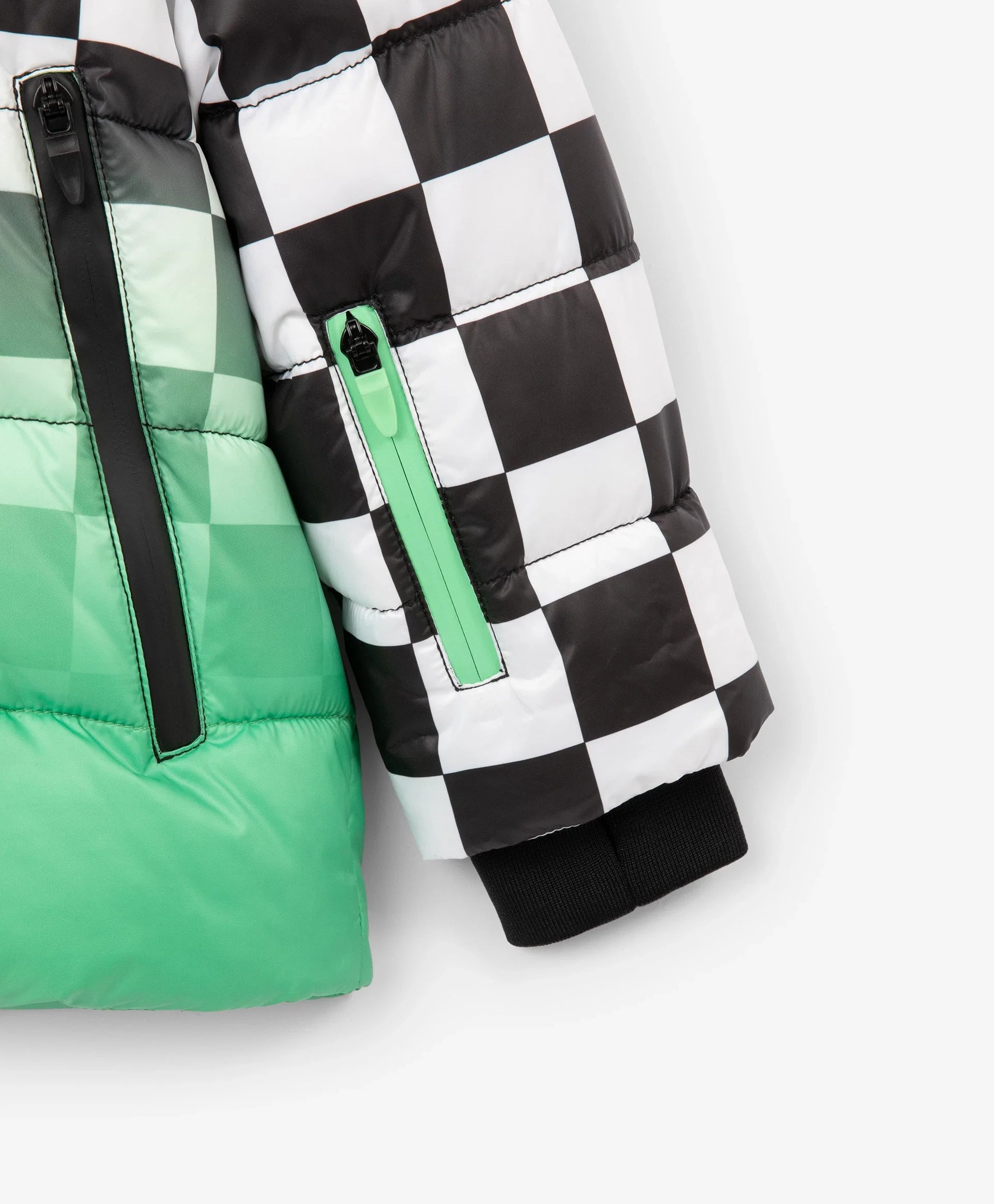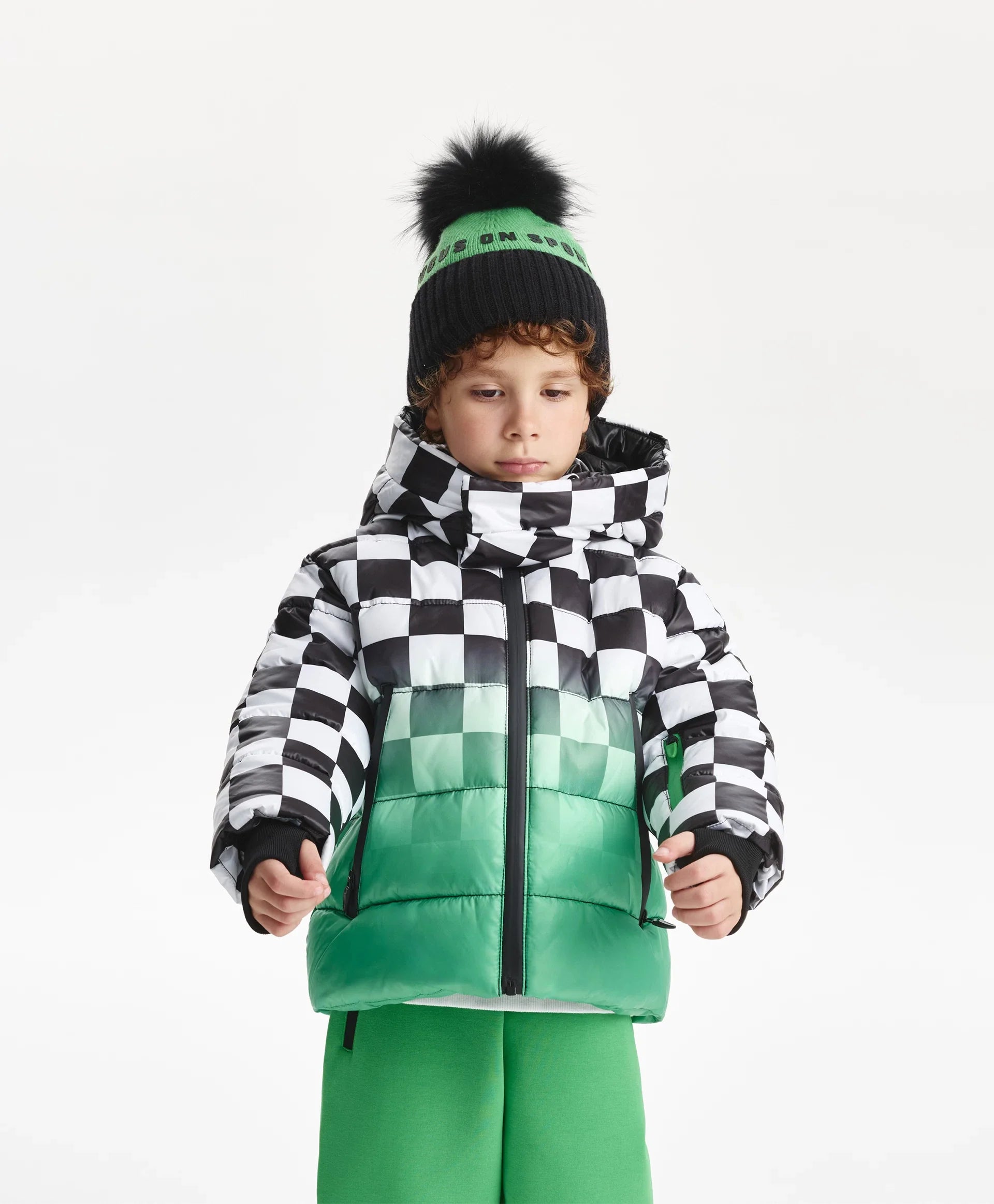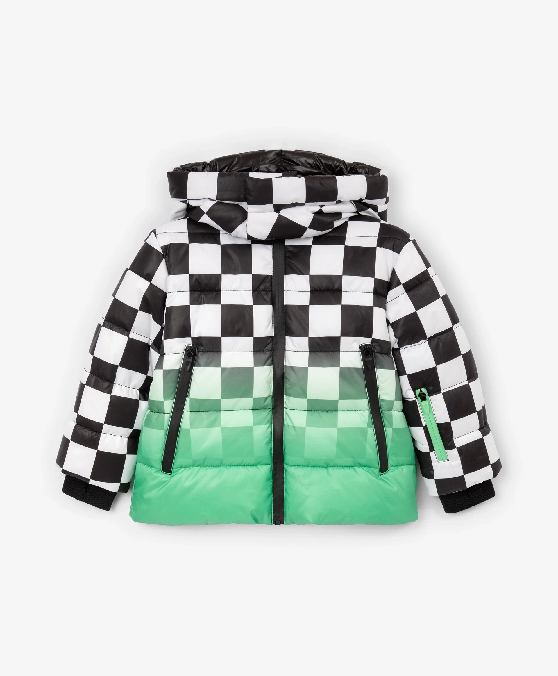 Демисезонното яке с ярък принт е най-добрият избор за хладния сезон! То изглежда свежо, динамично и убедително, повдига настроението и създава специално настроение, което мотивира за движение. Стяганото яке със синтетичен пух е изработено от лъскава влагоустойчива промазка с тънка подплата. Дизайнът е изграден върху уникална комбинация от черно-бяло шахматно каре и градиентен цветови преход, допълнени от едноцветни черни детайли. Якето разполага с редица функционални елементи за комфорт навън: дълбок качул с вътрешни връзки, ляти влагоустойчиви ципове на централното закопчаване и джобовете, джоб на ръкава за ски-пас. Големият принт с цифра подсилва енергичния характер, а светлоотразителната нашивка осигурява безопасността на момчето в тъмната част на деня.