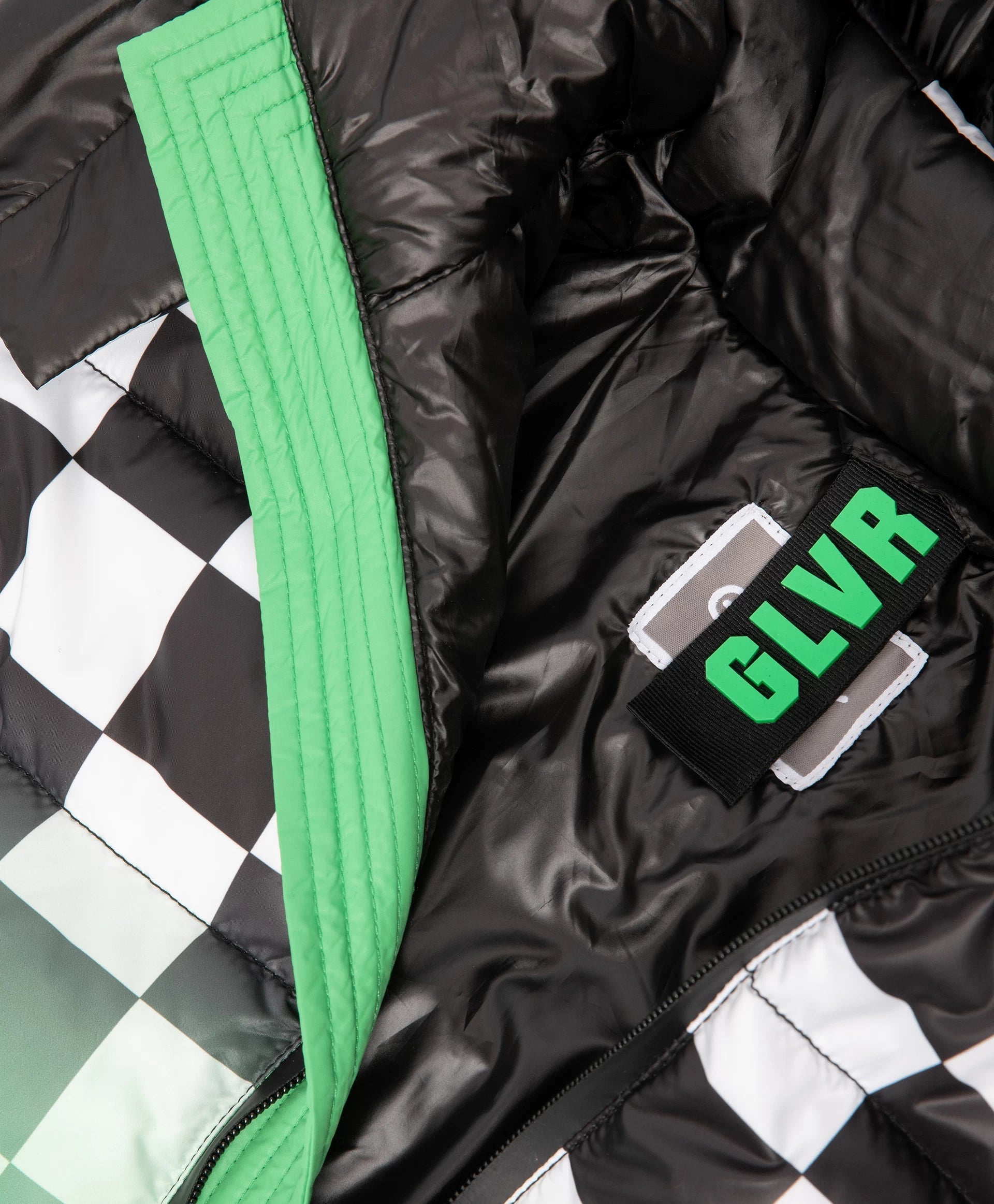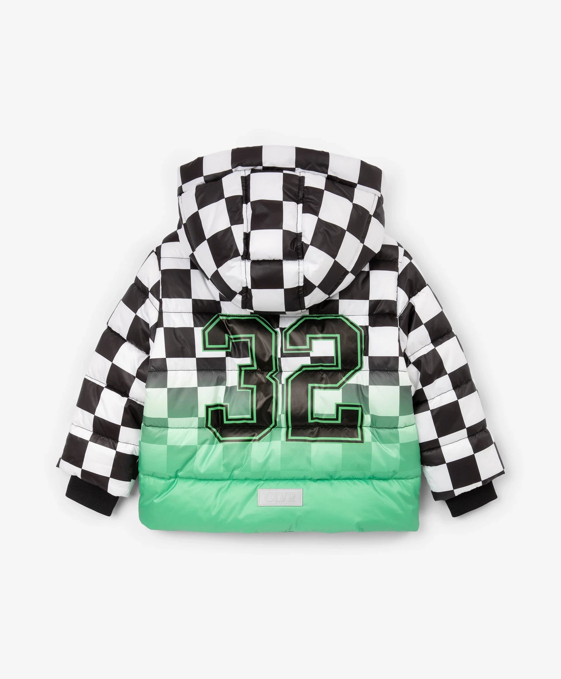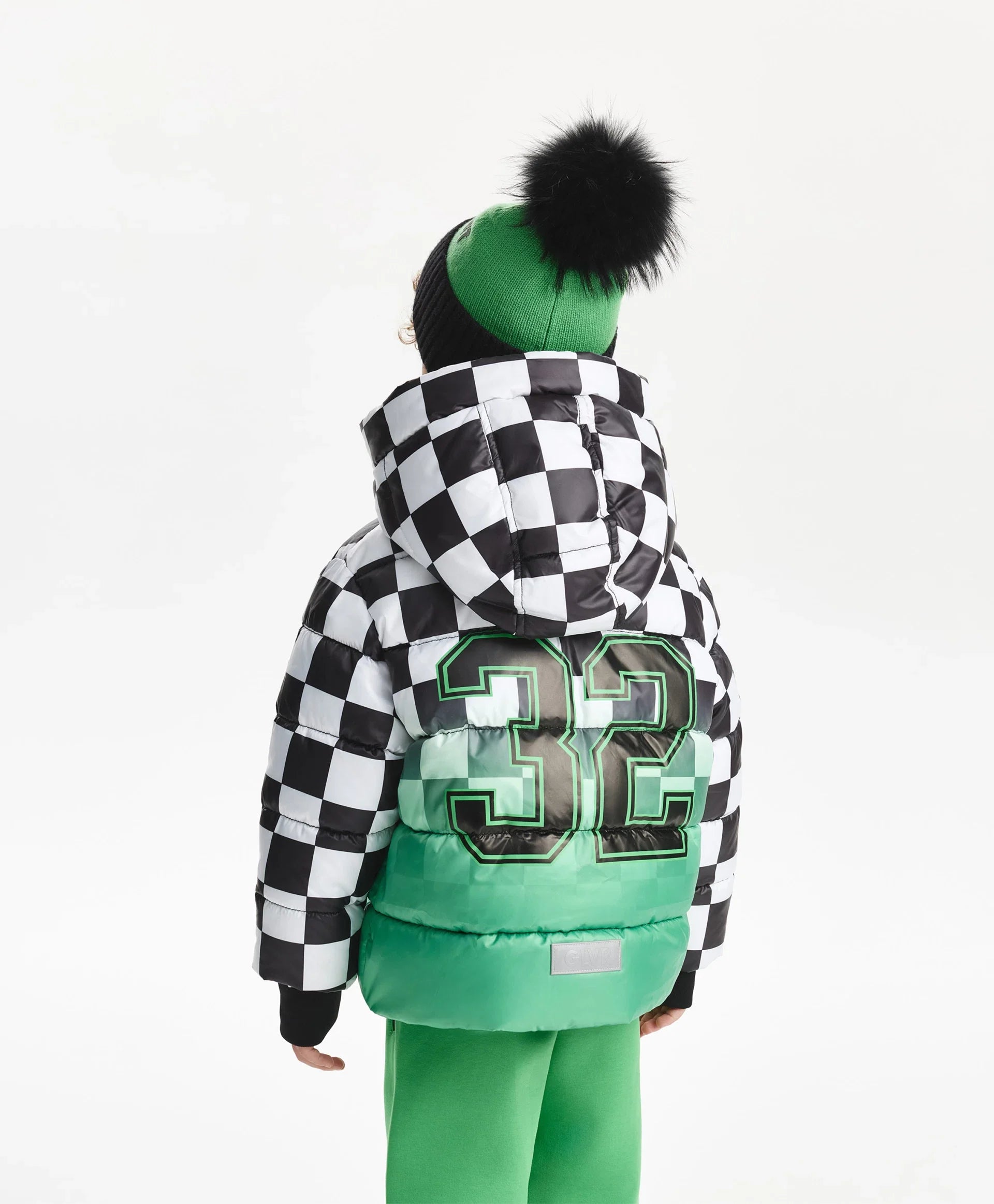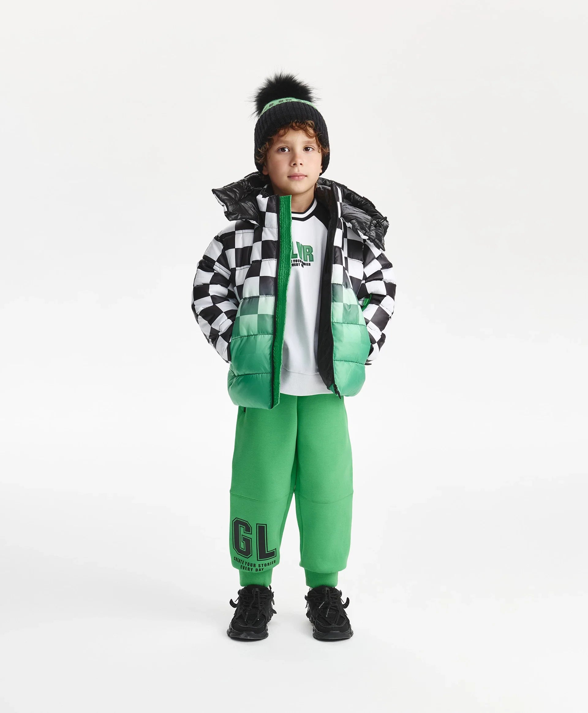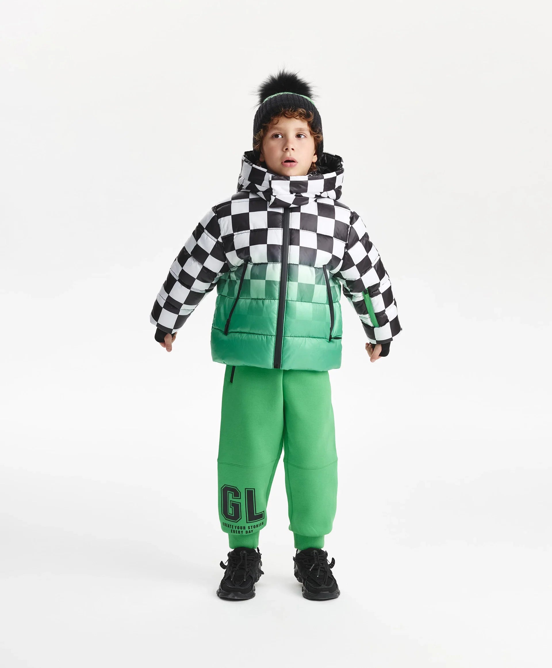 Демисезонното яке с ярък принт е най-добрият избор за хладния сезон! То изглежда свежо, динамично и убедително, повдига настроението и създава специално настроение, което мотивира за движение. Стяганото яке със синтетичен пух е изработено от лъскава влагоустойчива промазка с тънка подплата. Дизайнът е изграден върху уникална комбинация от черно-бяло шахматно каре и градиентен цветови преход, допълнени от едноцветни черни детайли. Якето разполага с редица функционални елементи за комфорт навън: дълбок качул с вътрешни връзки, ляти влагоустойчиви ципове на централното закопчаване и джобовете, джоб на ръкава за ски-пас. Големият принт с цифра подсилва енергичния характер, а светлоотразителната нашивка осигурява безопасността на момчето в тъмната част на деня.