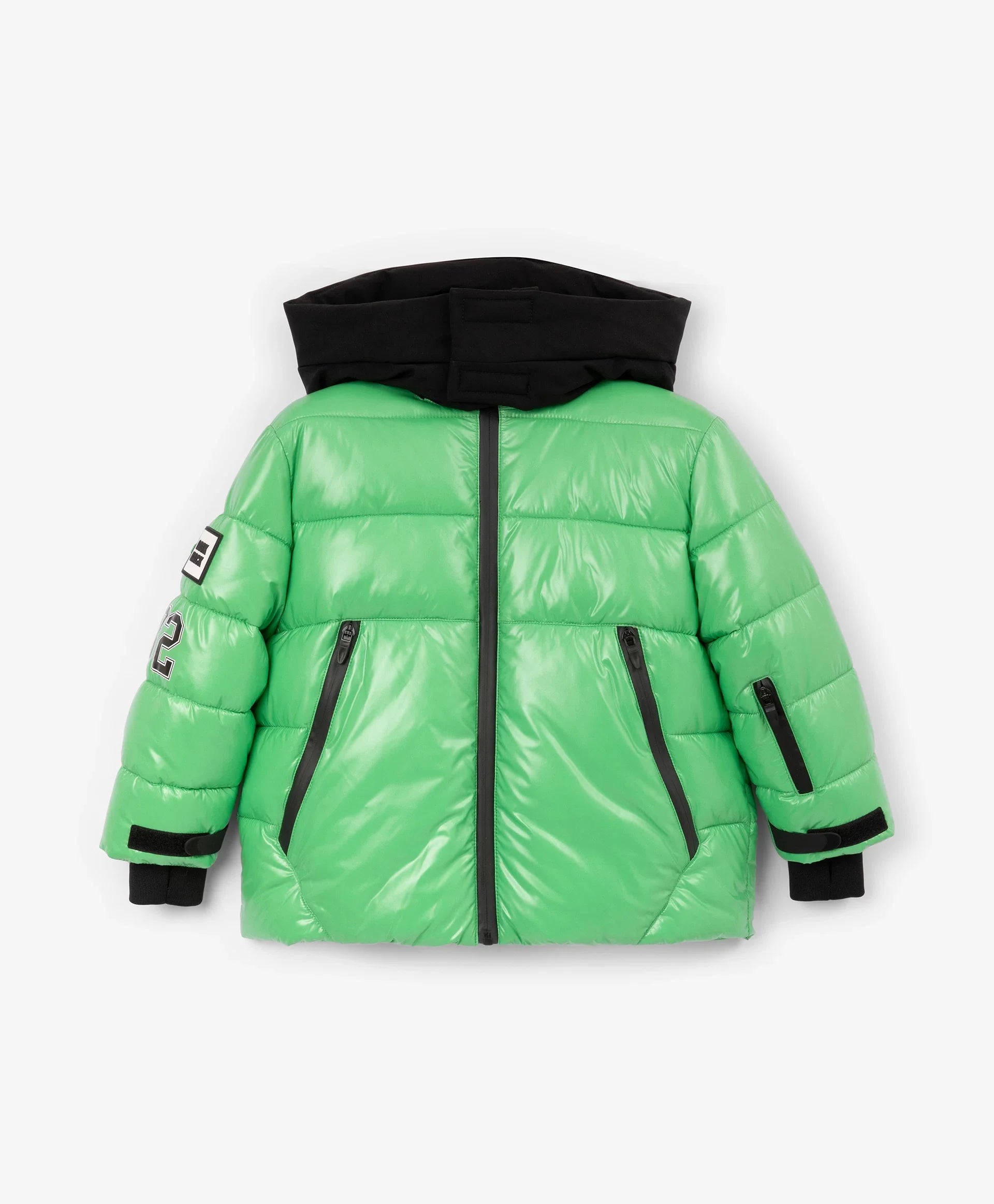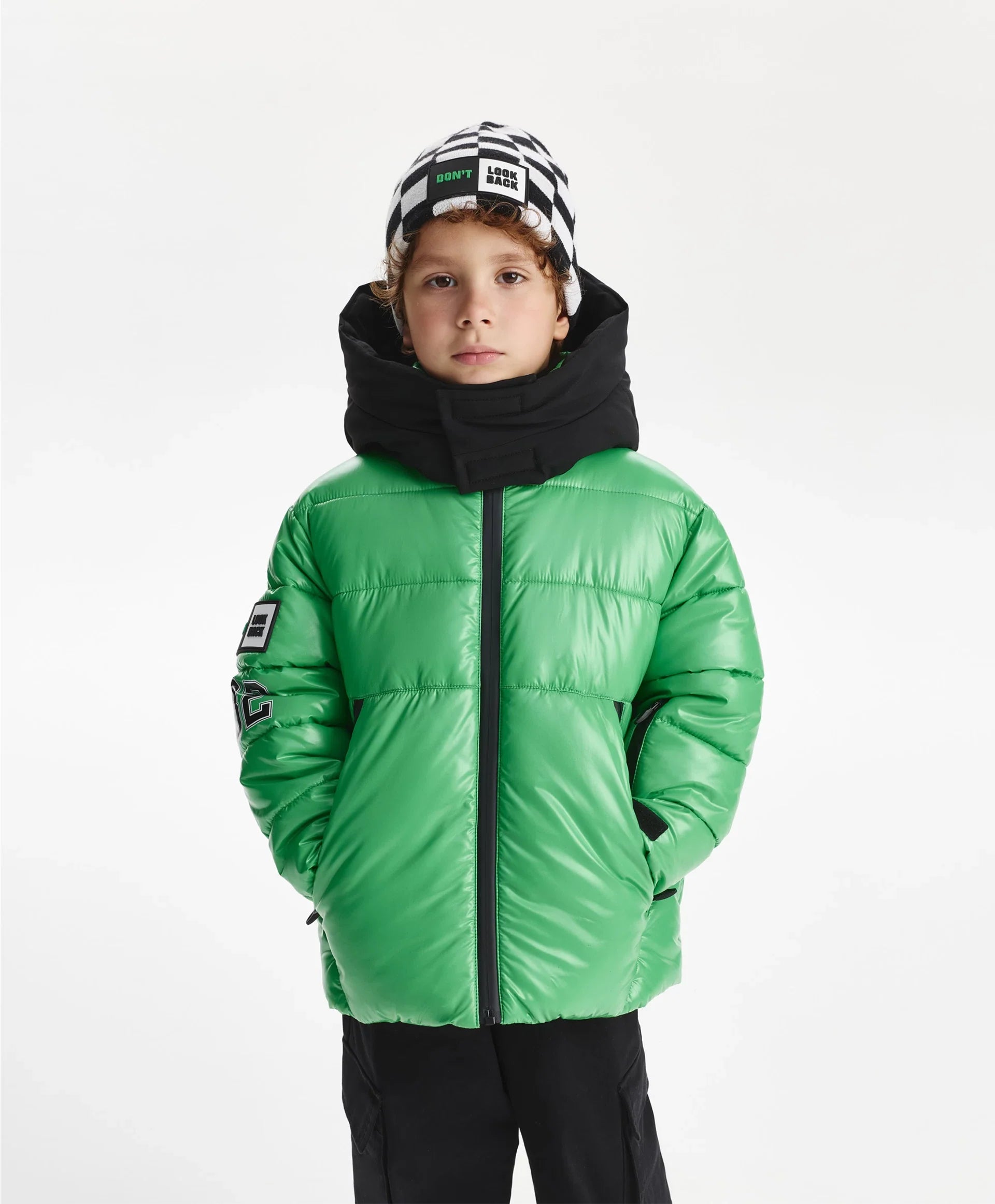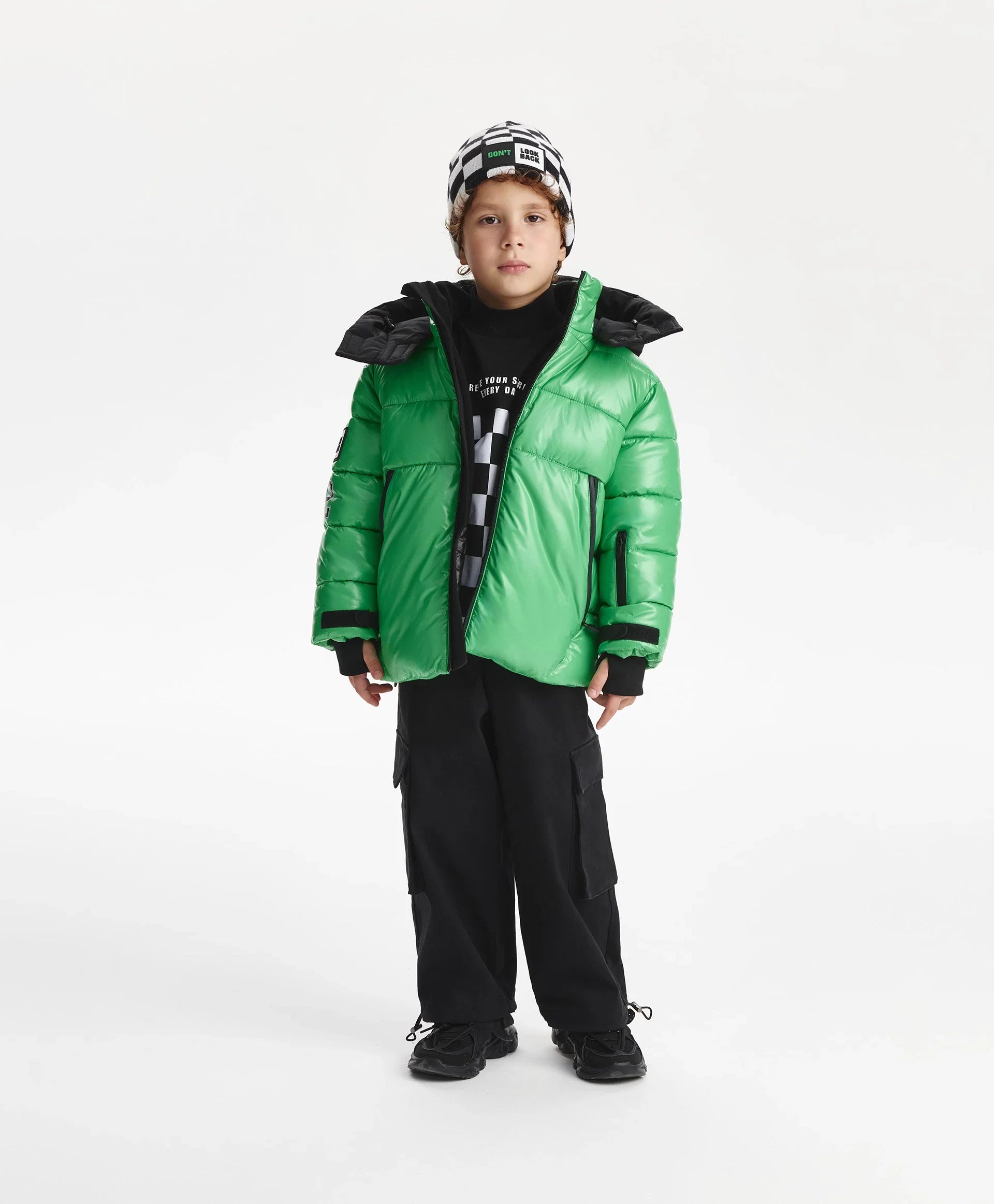 Стяганото зимно яке в наситено зелено е ярък акцент в зимната визия! Якето със синтетичен пух е изработено от влагоустойчива промазка с модерен мокър блясък и мека поларена подплата, което го прави практично и издръжливо дори при сурови зимни условия. Дизайнът е вдъхновен от спортния стил: колорблок ефекти, комбинации от текстури, контрастни детайли и аксесоари превръщат класическата кройка в интересен, модерен модел, който мотивира към движение! Допълнителни функционални елементи: дълбок качул с вътрешни връзки и висока яка с велкро, рипсени маншети с отвори за палци, велкро ленти на ръкавите, вътрешна връзка по долния край, ляти влагоустойчиви ципове на централното закопчаване и джобовете. Якето има вътрешни презрамки, които позволяват носене на гърба като раница. На ръкавите са разположени шрифтов принт и минималистична гумена нашивка, както и джоб с цип за ски-пас. Светлоотразителната нашивка на гърба осигурява безопасност в тъмното.