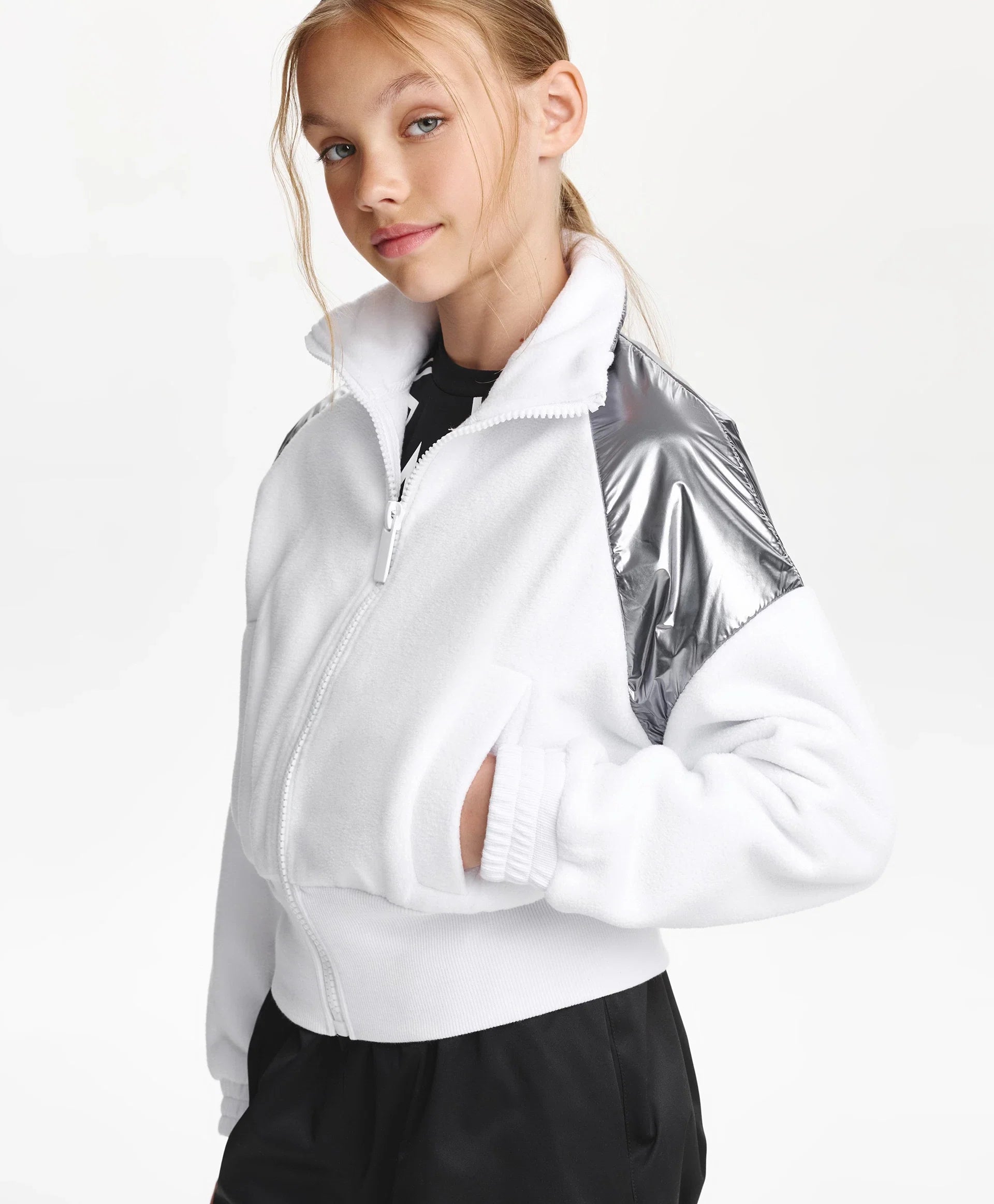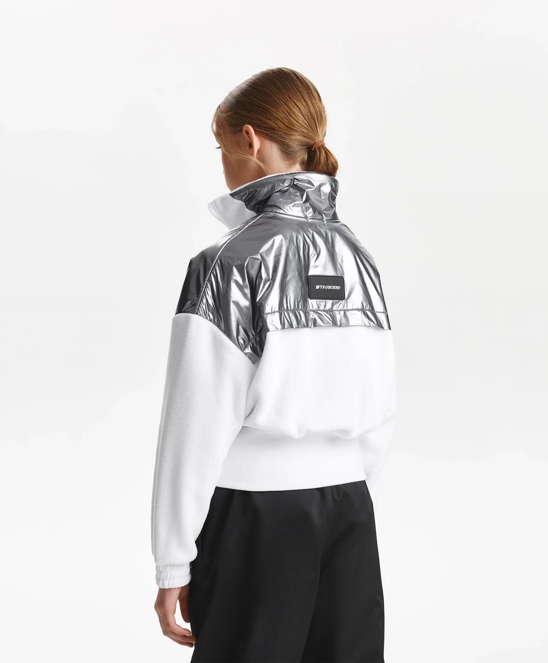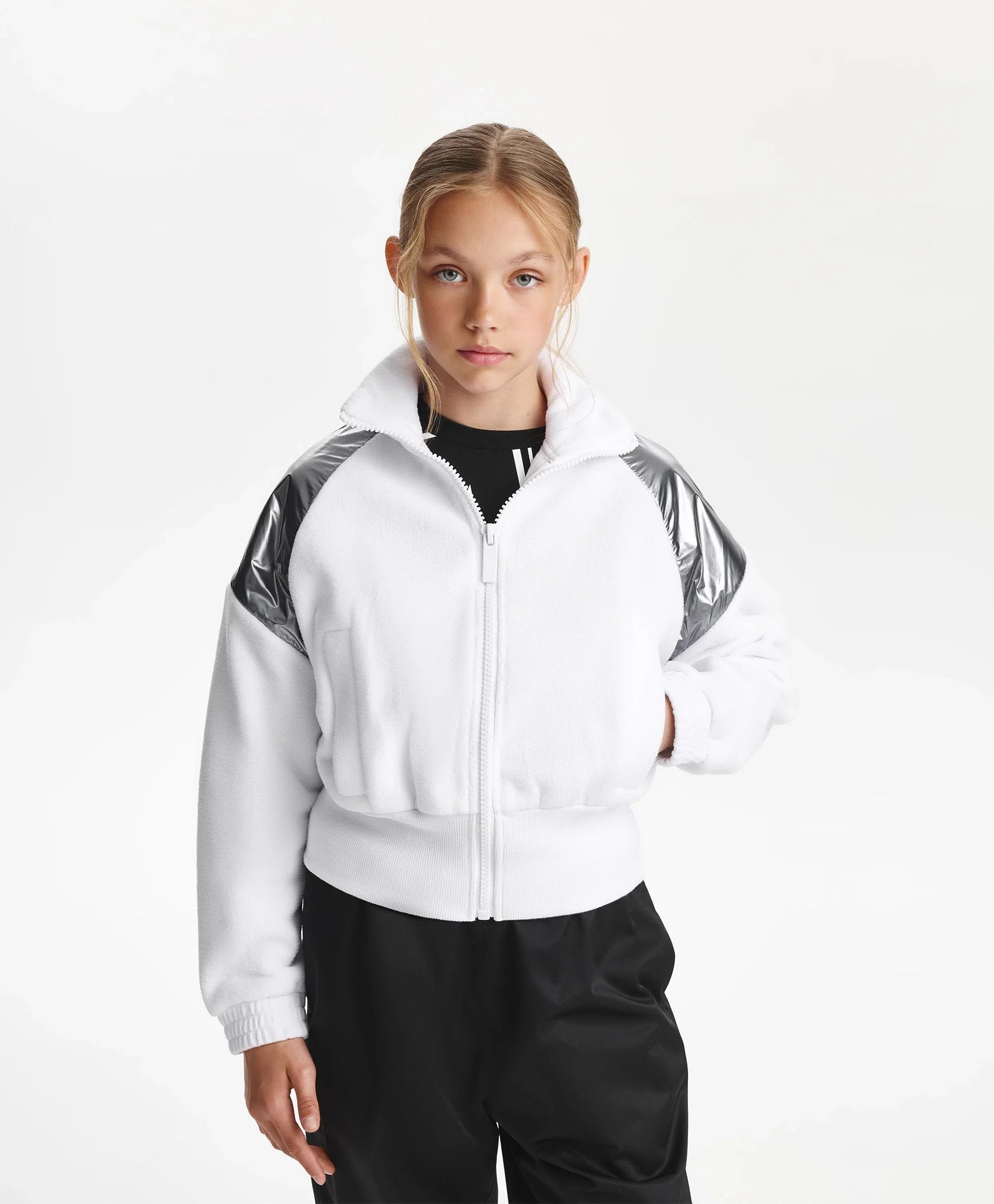 Бяло разкопчаващо се суитшърт яке от полар – ключът към оригинална визия в спортен стил! Вдъхновено от естетиката на футуризма, якето съчетава игра на текстури – мек уютен полар и лъскава сребриста промазка. Широкият рипсен колан и високата яка придават на модела острота и динамика. Листовидните джобове осигуряват удобство при носене. На гърба е разположена гумена нашивка с шрифтови елементи. Якето се закопчава с цип.