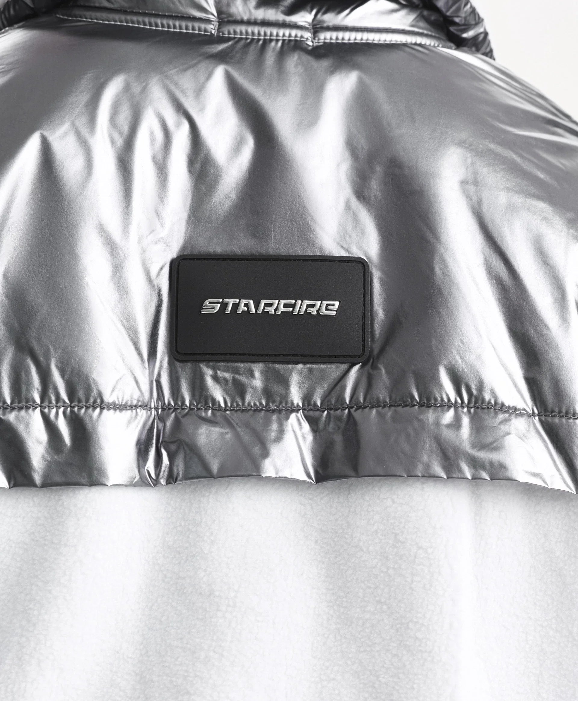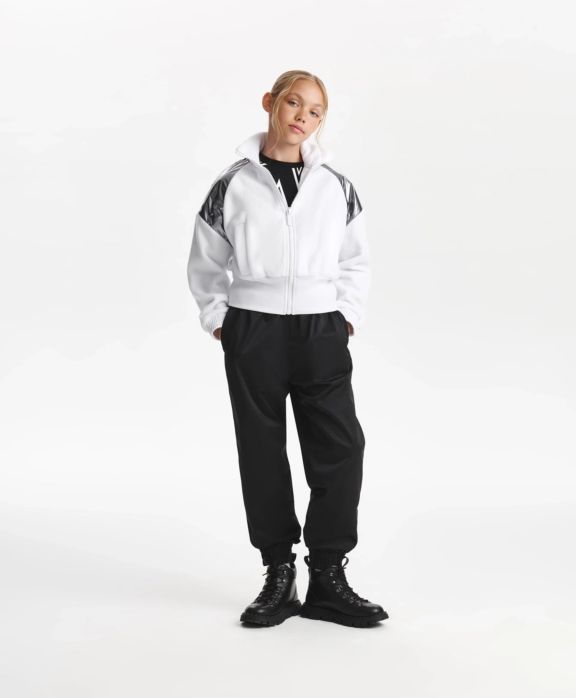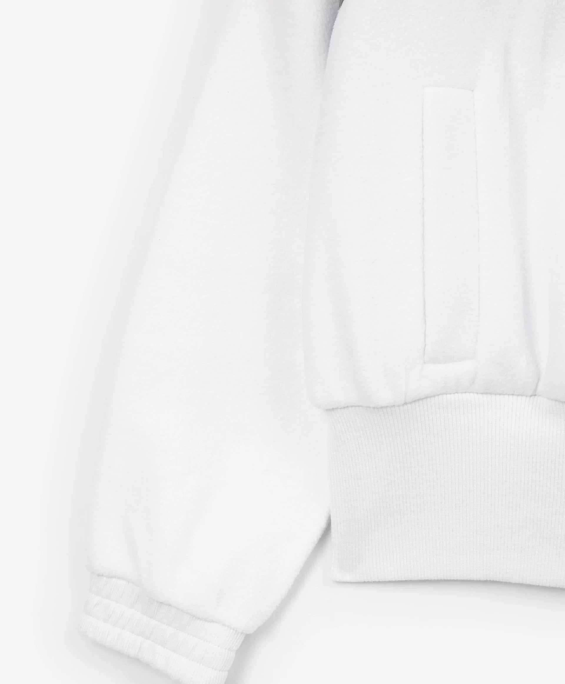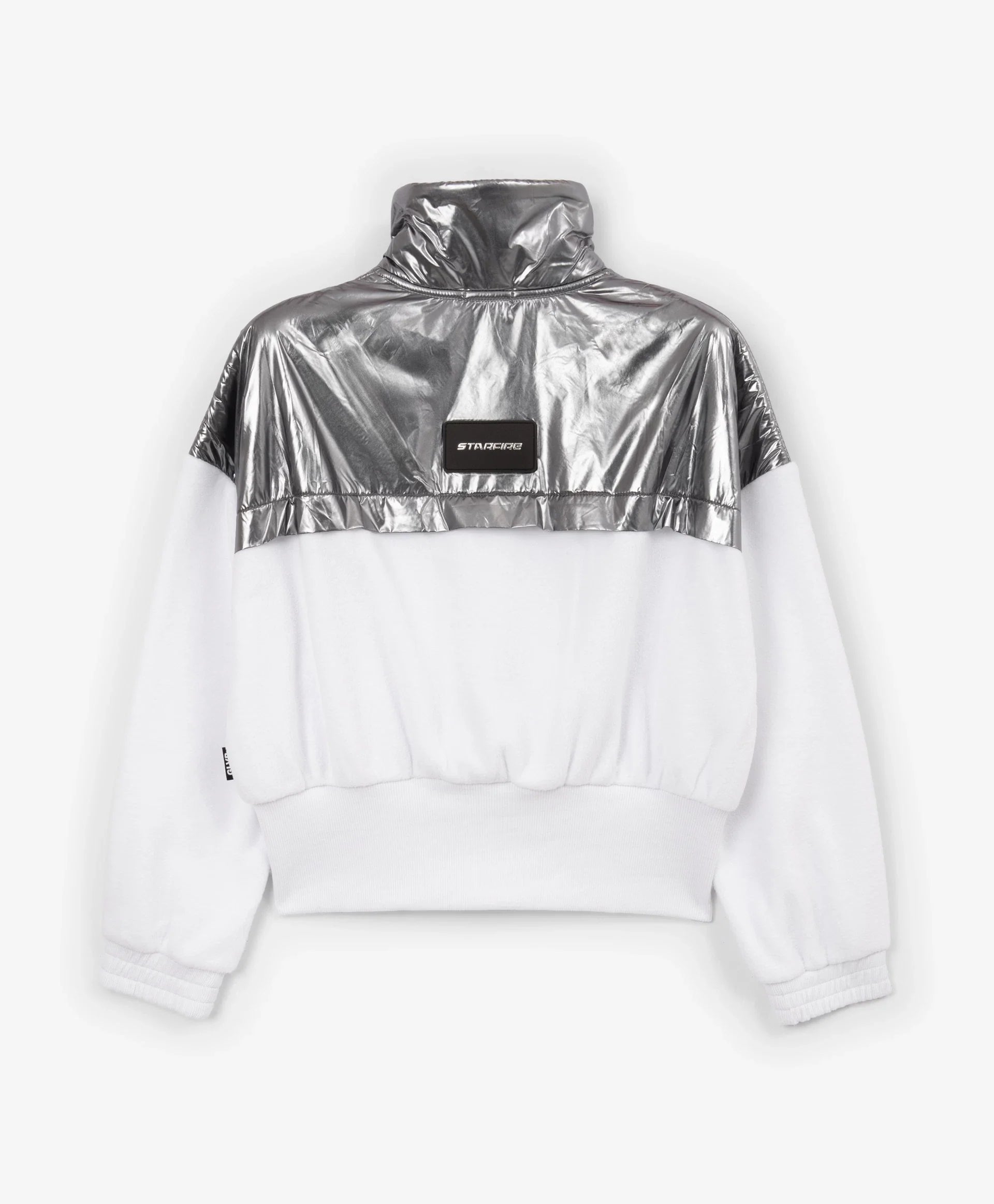 Бяло разкопчаващо се суитшърт яке от полар – ключът към оригинална визия в спортен стил! Вдъхновено от естетиката на футуризма, якето съчетава игра на текстури – мек уютен полар и лъскава сребриста промазка. Широкият рипсен колан и високата яка придават на модела острота и динамика. Листовидните джобове осигуряват удобство при носене. На гърба е разположена гумена нашивка с шрифтови елементи. Якето се закопчава с цип.