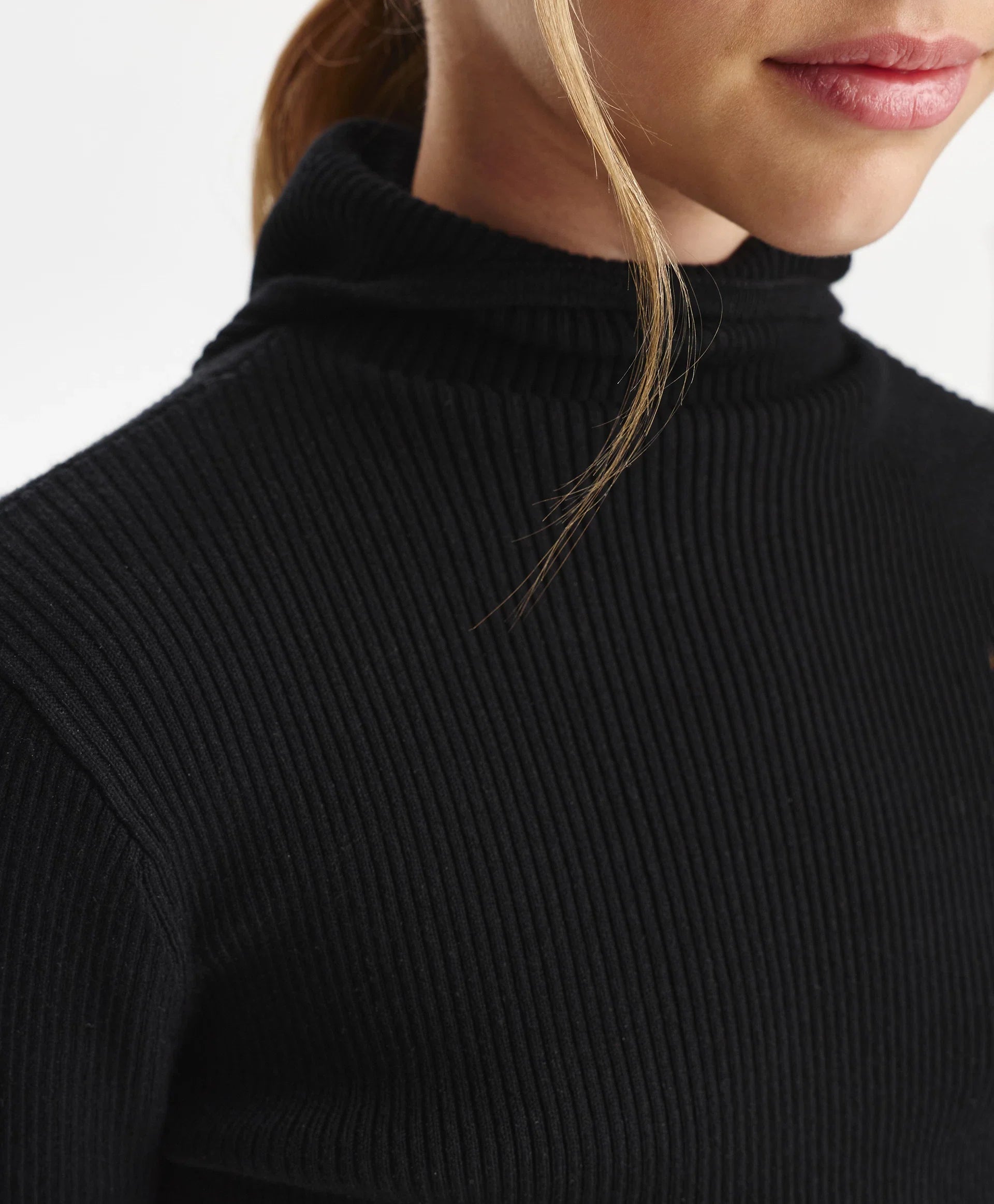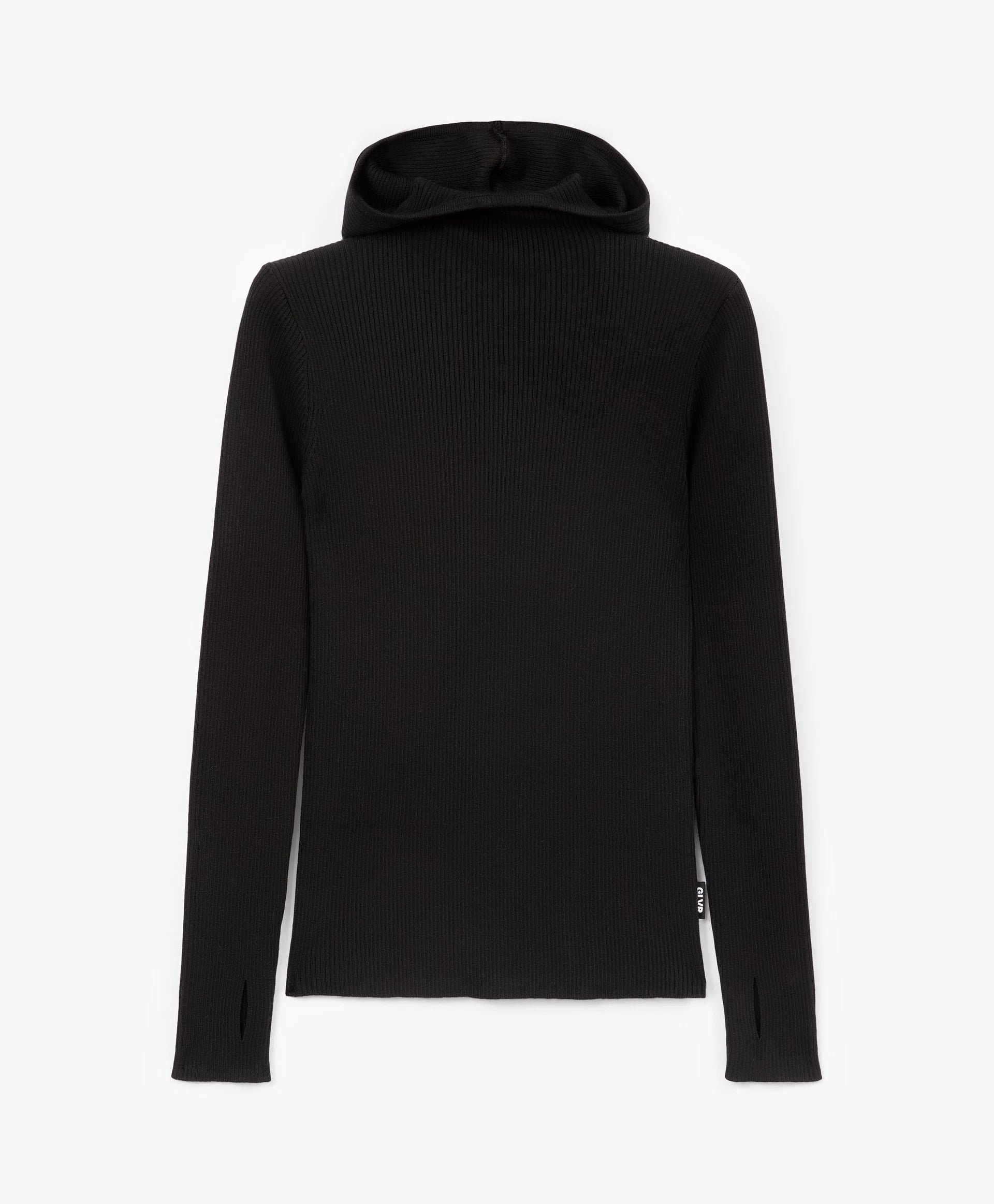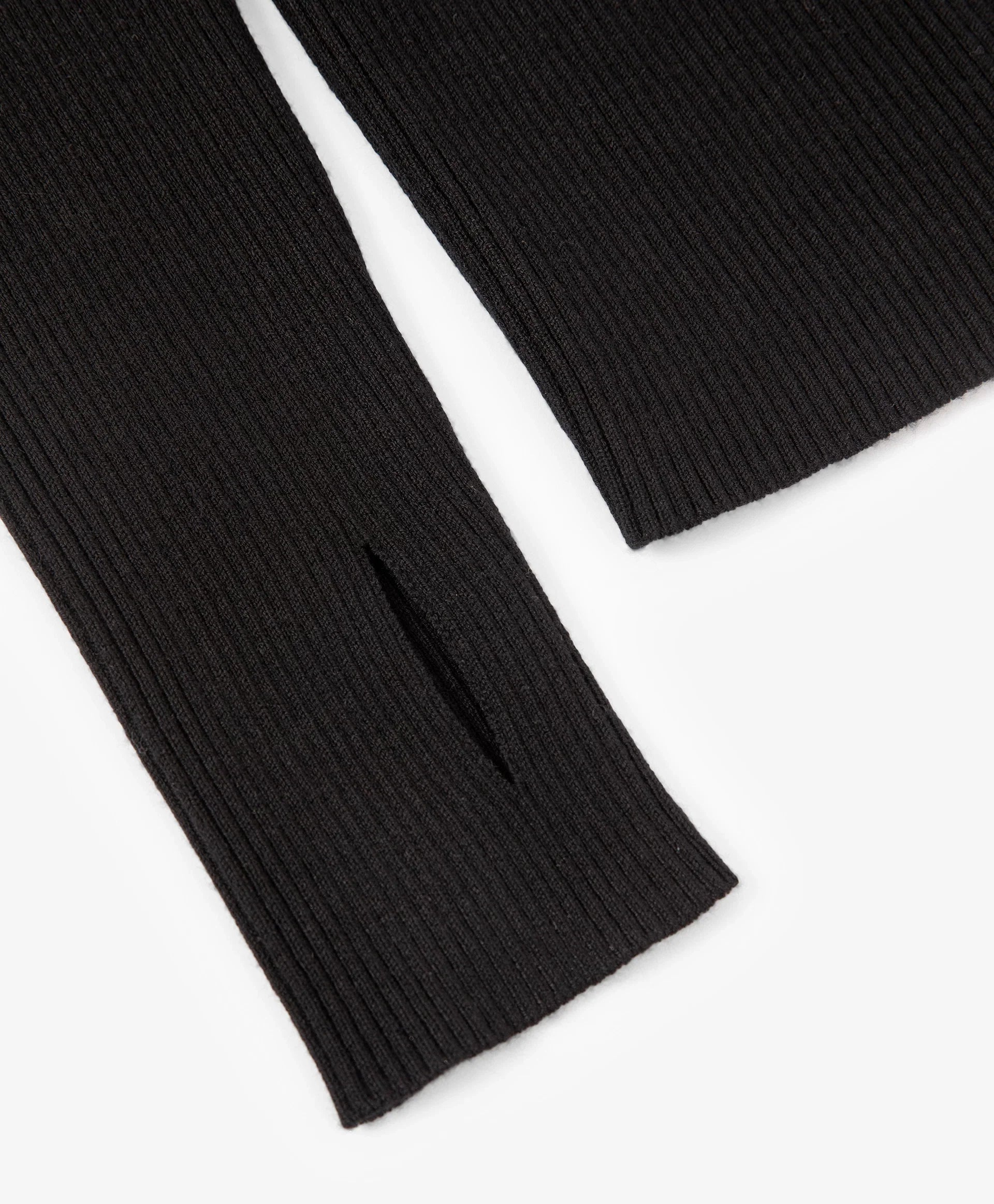 Плетена поло блуза – стилна, нетривиална и оригинална дреха, която ще направи визията на момичето интересна! Поло блузата с полуприлепнал силует е изработена от деликатна прежда на основата на вискоза с еластан, осигуряваща мекота, уют и приятен допир. Важни визуални и функционални акценти са яката, преминаваща в качулка, и удължените ръкави с отвори за палците – надеждна защита в студеното време. Минималистичният дизайн и черният цвят правят полото универсално и подходящо за различни стилове и цветови решения.