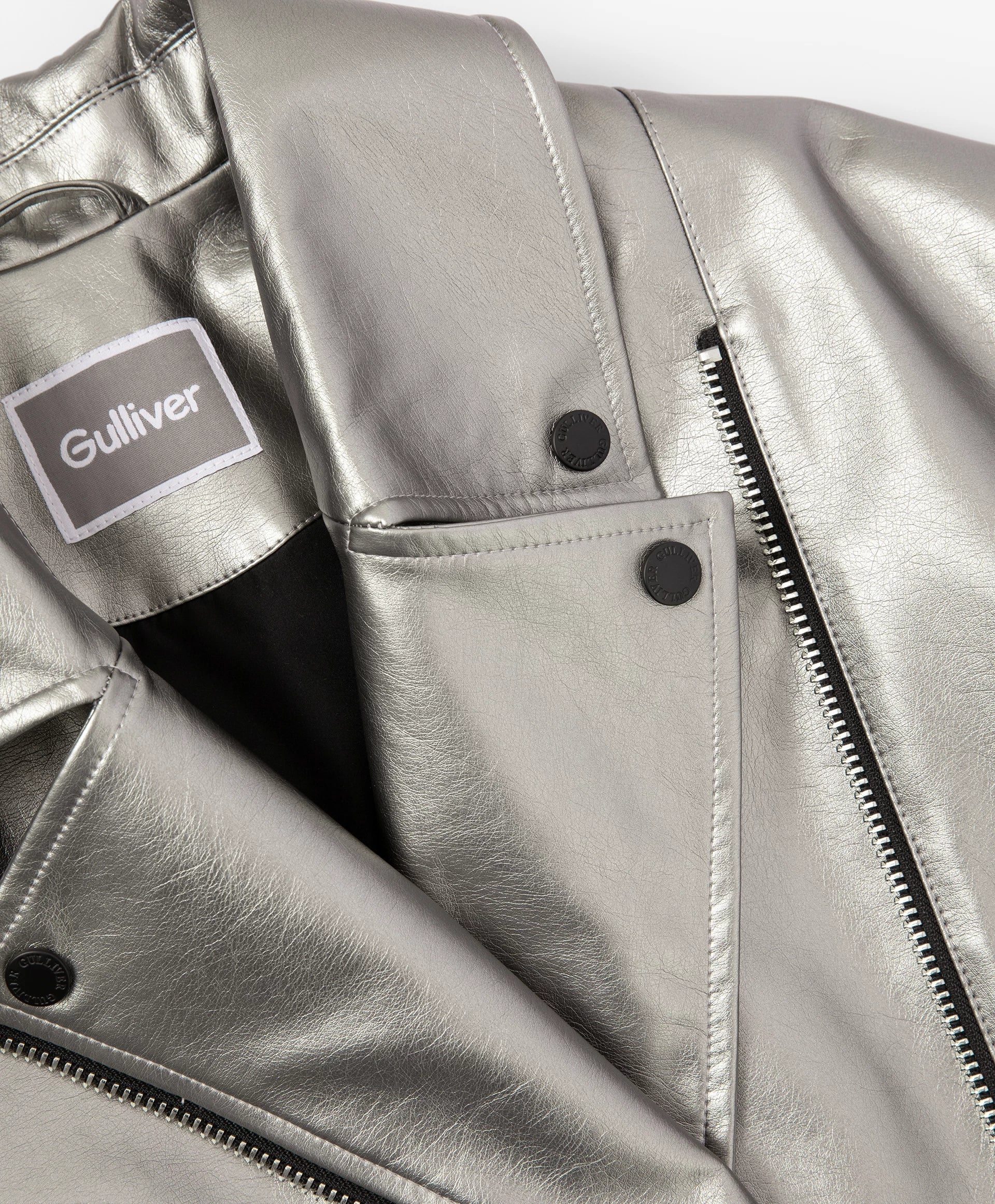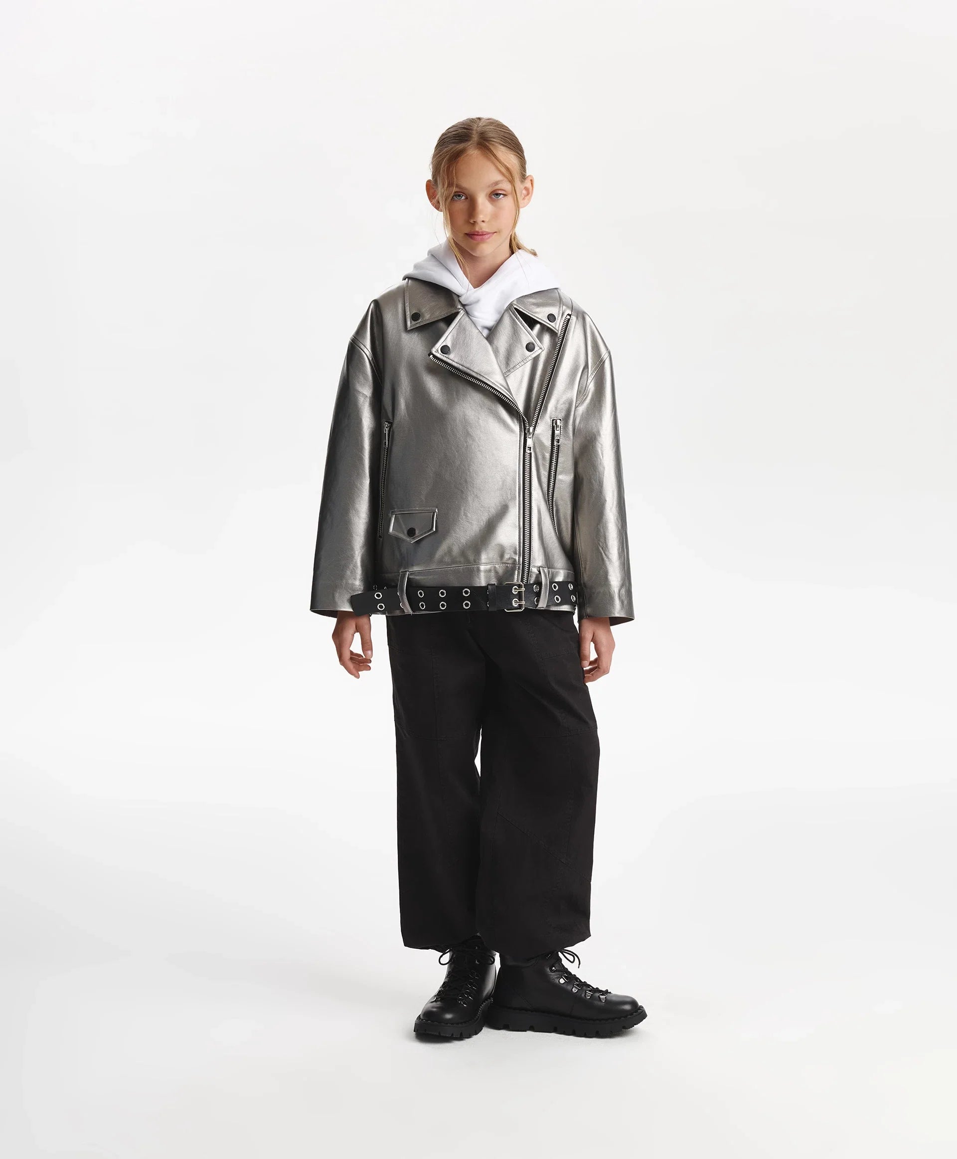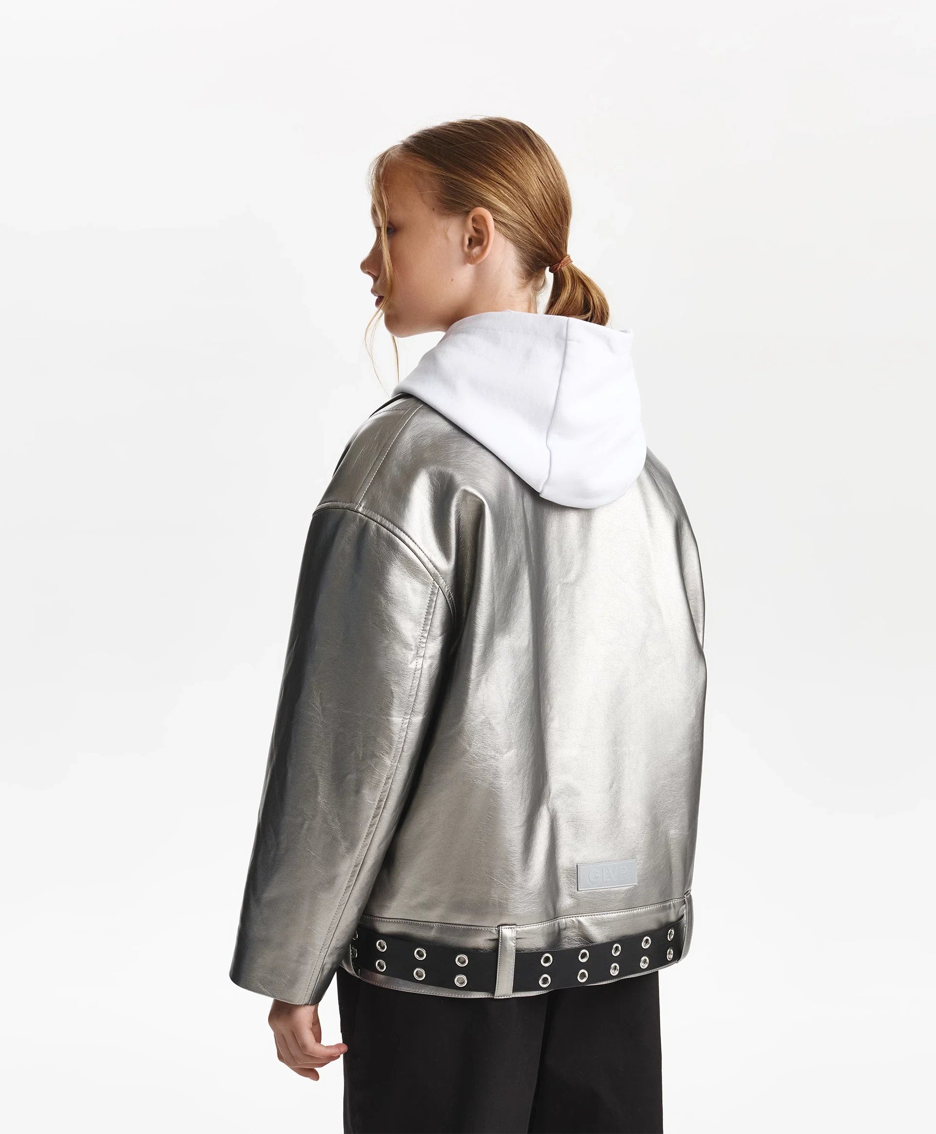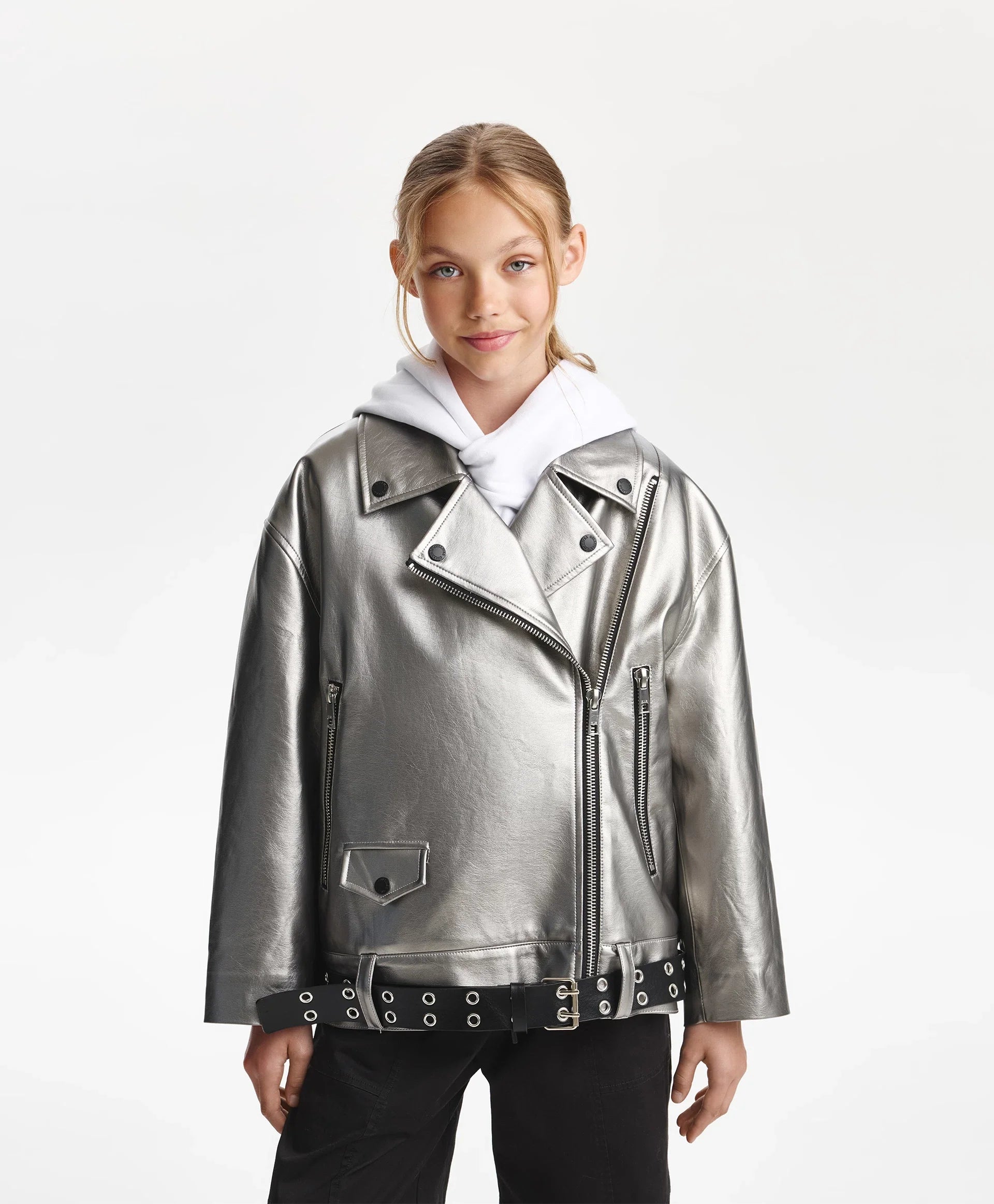 Яркият сребрист цвят и разпознаваемият бунтарски дух правят коженото яке чудесен избор за есенните визии на момичето. Якето на тънък синтепон и мека подплата е изработено от влагоустойчива изкуствена кожа, по вид, пластика и допир наподобяваща естествена. То се вписва идеално както в спортен, така и в кежуал гардероб, добавяйки острота във всеки тоалет. Моделът притежава всички стилистични и функционални атрибути на косуха: английска яка, асиметрично закопчаване, джобове с ципове, свалящ се колан – истинска находка за момичета, обичащи бунтарския байкърски стил. На гърба има светлоотразителна нашивка за безопасност в тъмното.