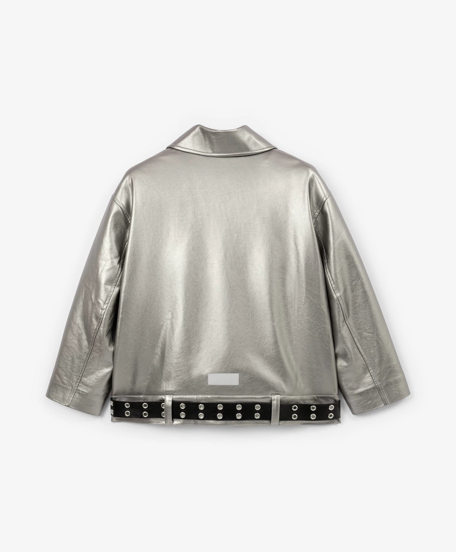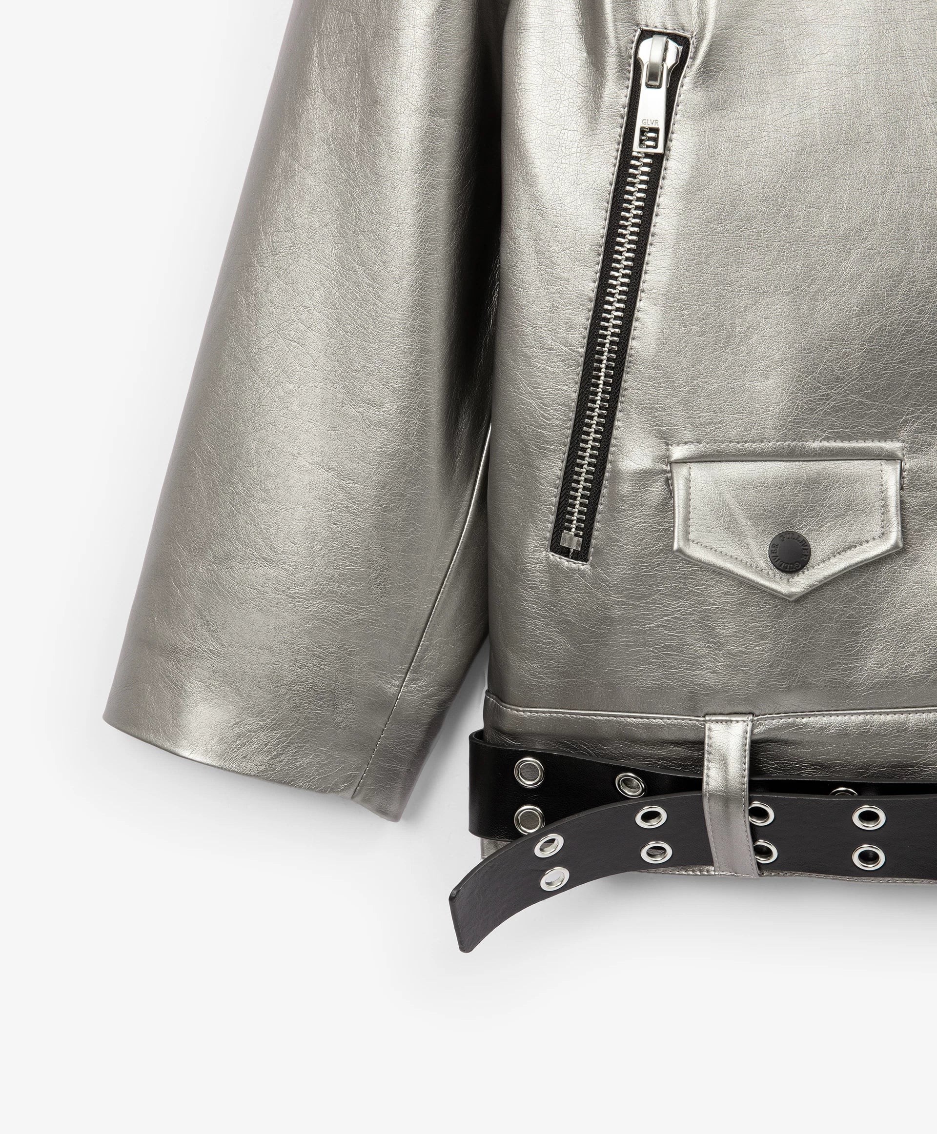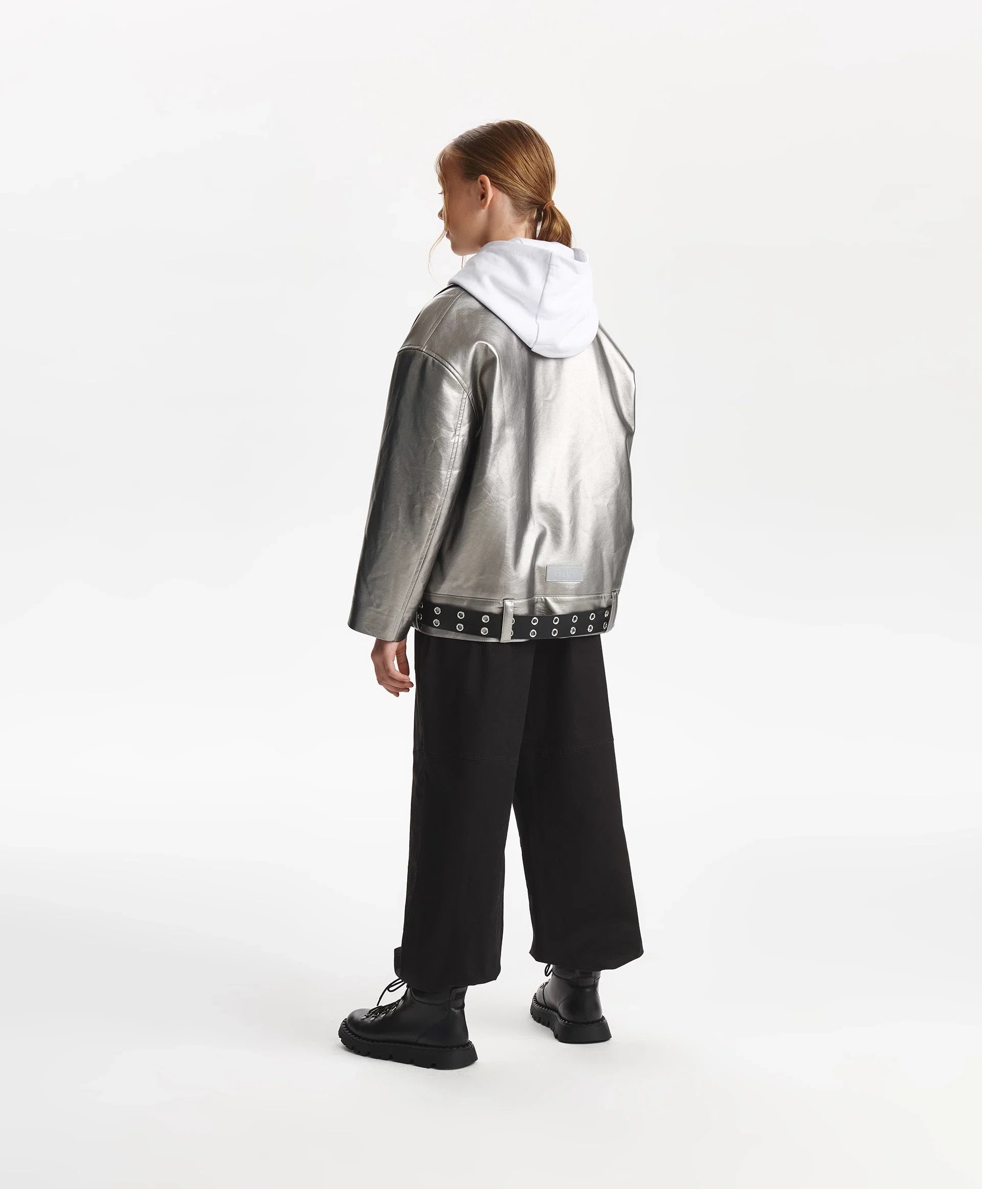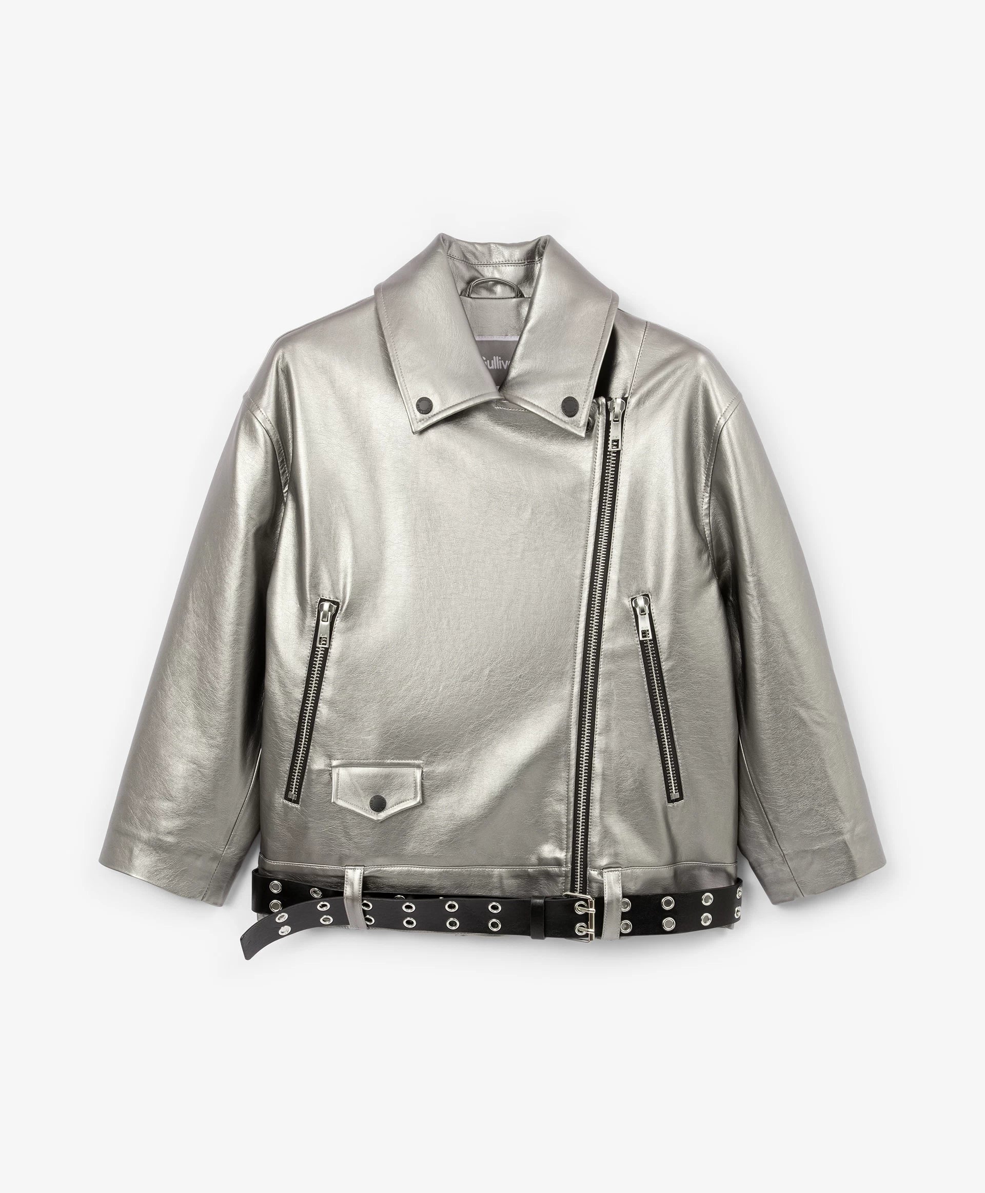 Яркият сребрист цвят и разпознаваемият бунтарски дух правят коженото яке чудесен избор за есенните визии на момичето. Якето на тънък синтепон и мека подплата е изработено от влагоустойчива изкуствена кожа, по вид, пластика и допир наподобяваща естествена. То се вписва идеално както в спортен, така и в кежуал гардероб, добавяйки острота във всеки тоалет. Моделът притежава всички стилистични и функционални атрибути на косуха: английска яка, асиметрично закопчаване, джобове с ципове, свалящ се колан – истинска находка за момичета, обичащи бунтарския байкърски стил. На гърба има светлоотразителна нашивка за безопасност в тъмното.