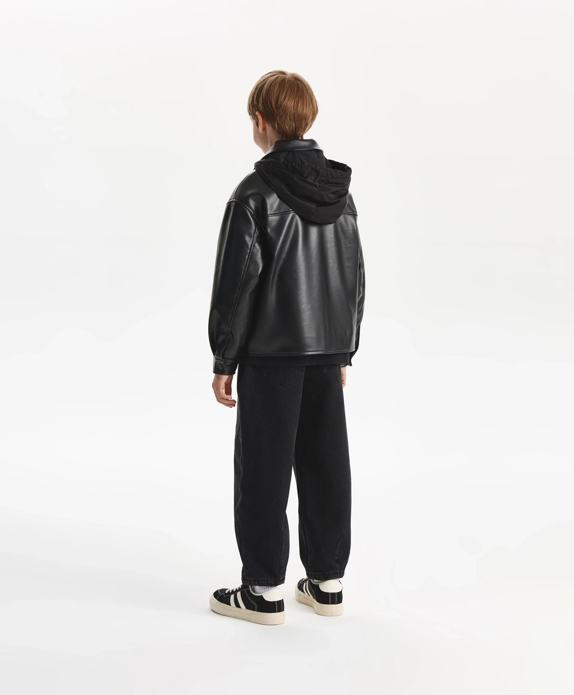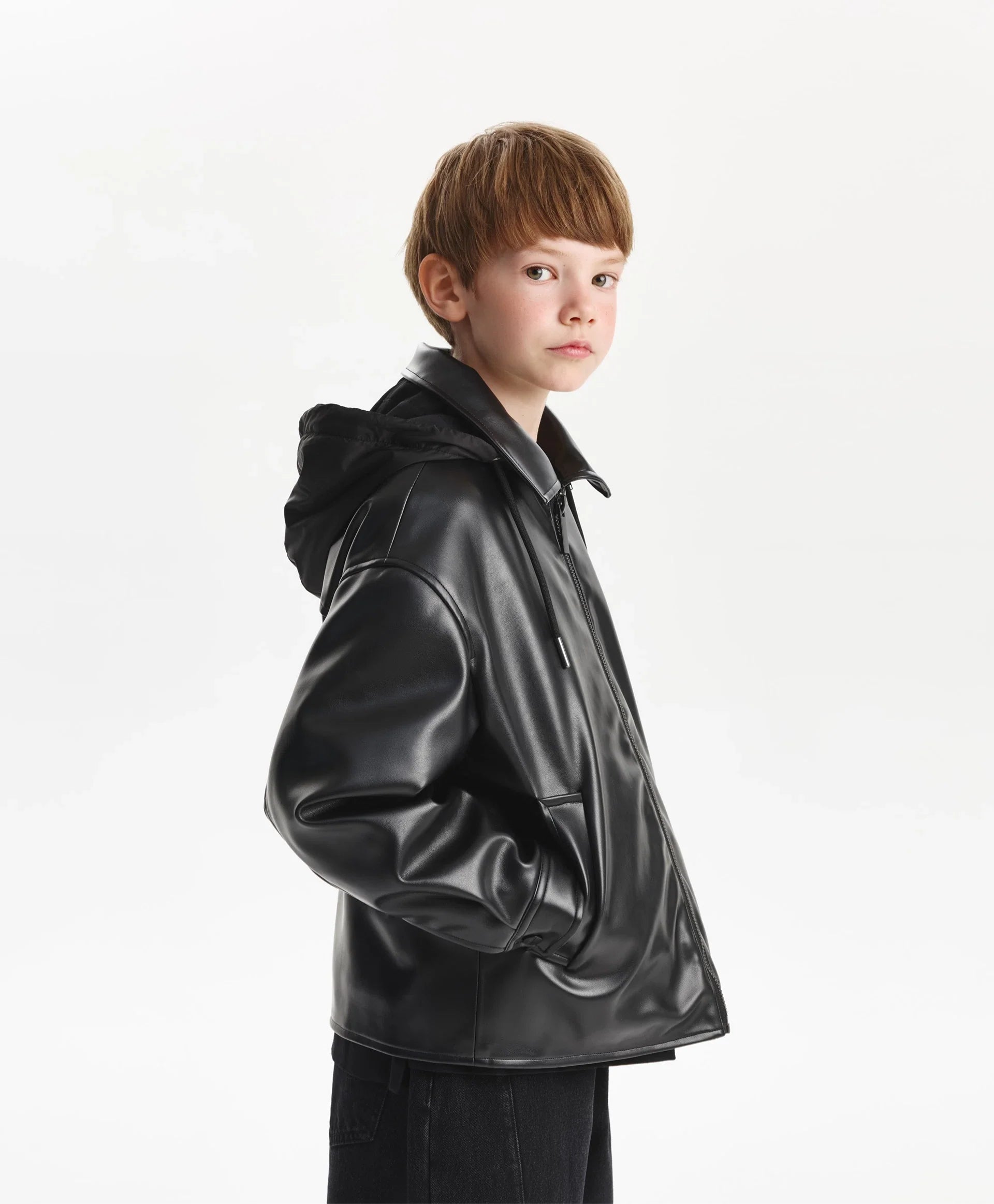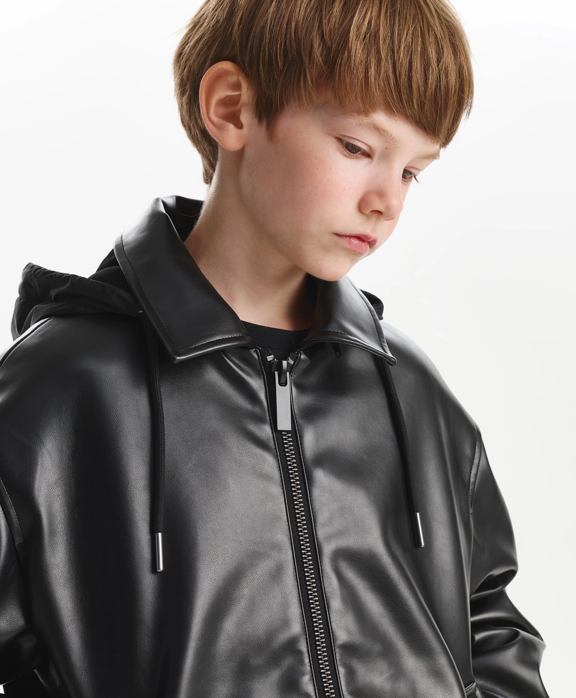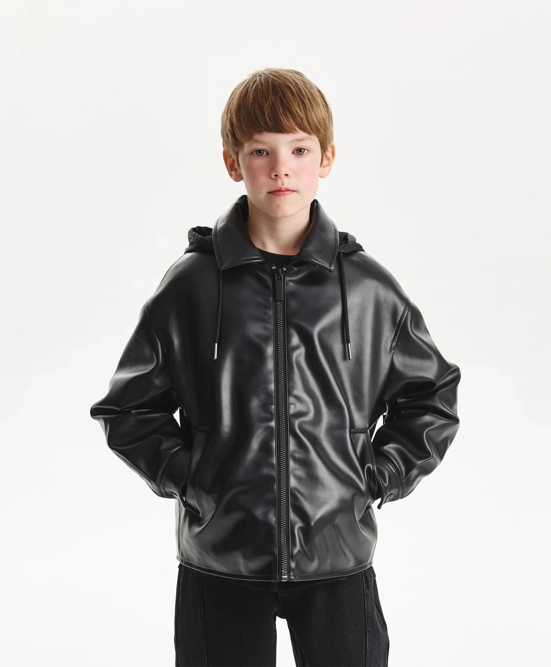Черното яке със свободна комфортна кройка от еко кожа на тънък синтепон ще добави динамика и енергия в есенната визия на момчето. Минималистичният дизайн го прави стилно, бунтарско и отразява вкуса на тийнейджъра. Свалящата се промазана качулка с връзки допълва яката и създава интересна игра на текстури, като повишава функционалността. Листовидните джобове и маншетите с копчета осигуряват удобство. Закопчава се с цип.