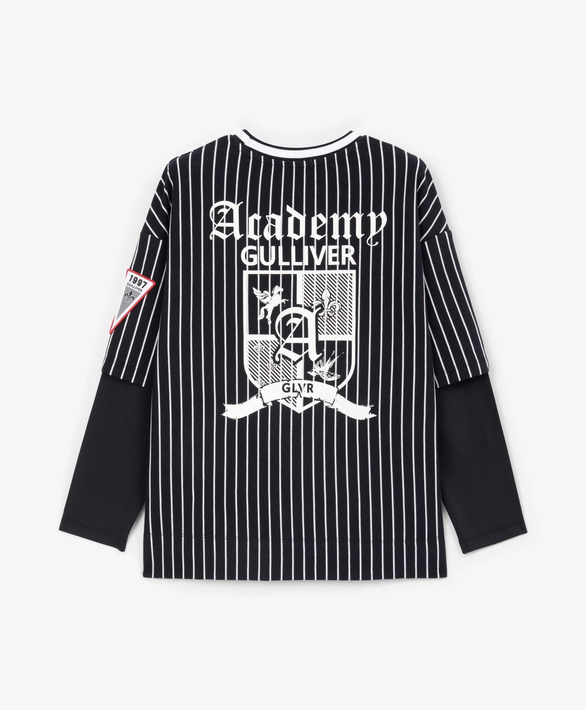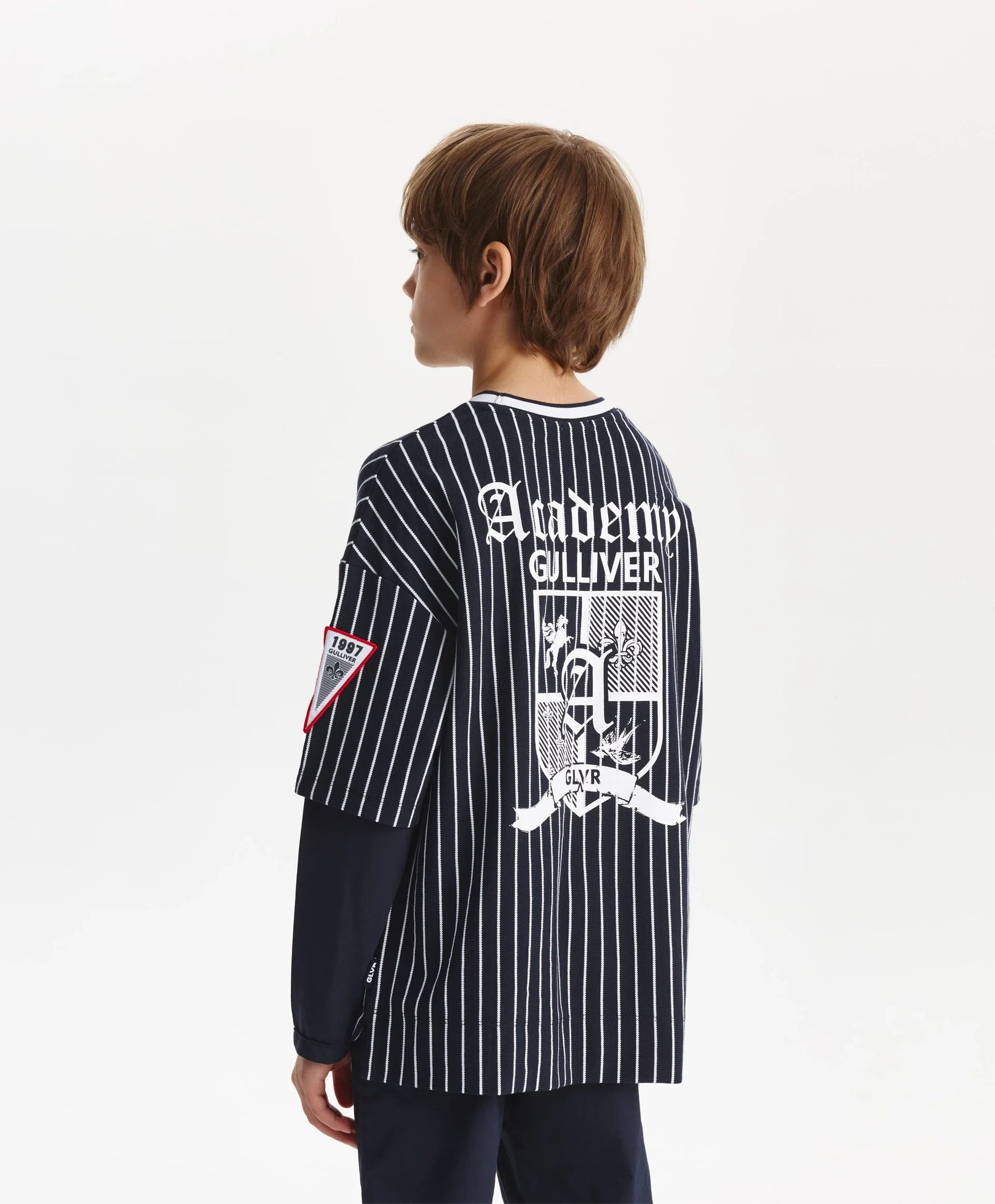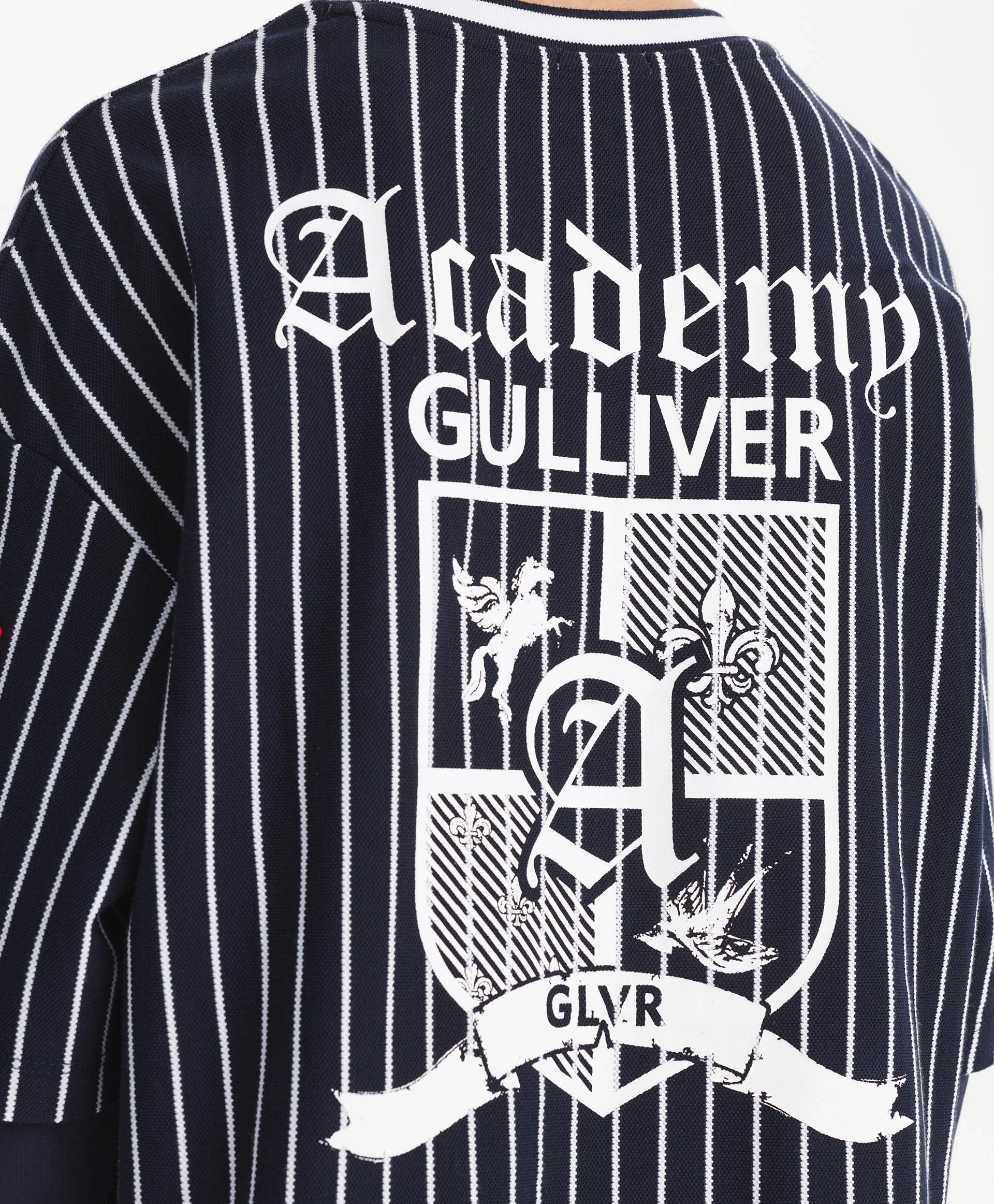 Синият лонгслив с оувърсайз силует и удължена задна част е модерен, остър и интересен елемент от гардероба за свободното време на момчето. Дизайнът е изграден върху многопластовост и ярки белези на спортния стил. Съчетава памучно пике на вертикални райета и едноцветен трикотаж, шрифтови графики, хералдически мотиви, нашивки, рипсена О-образна яка с контрастни кантове – всички те отразяват вайба на колекцията Gulliver „Колеж“, вдъхновена от атмосферата на частни училища и спортни отбори.