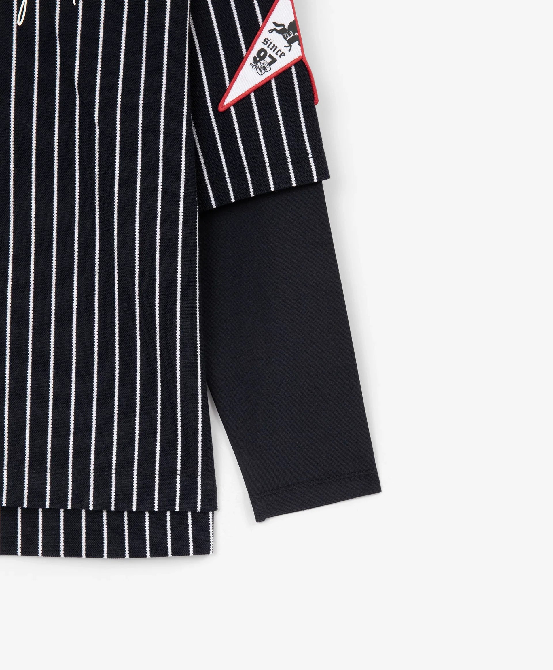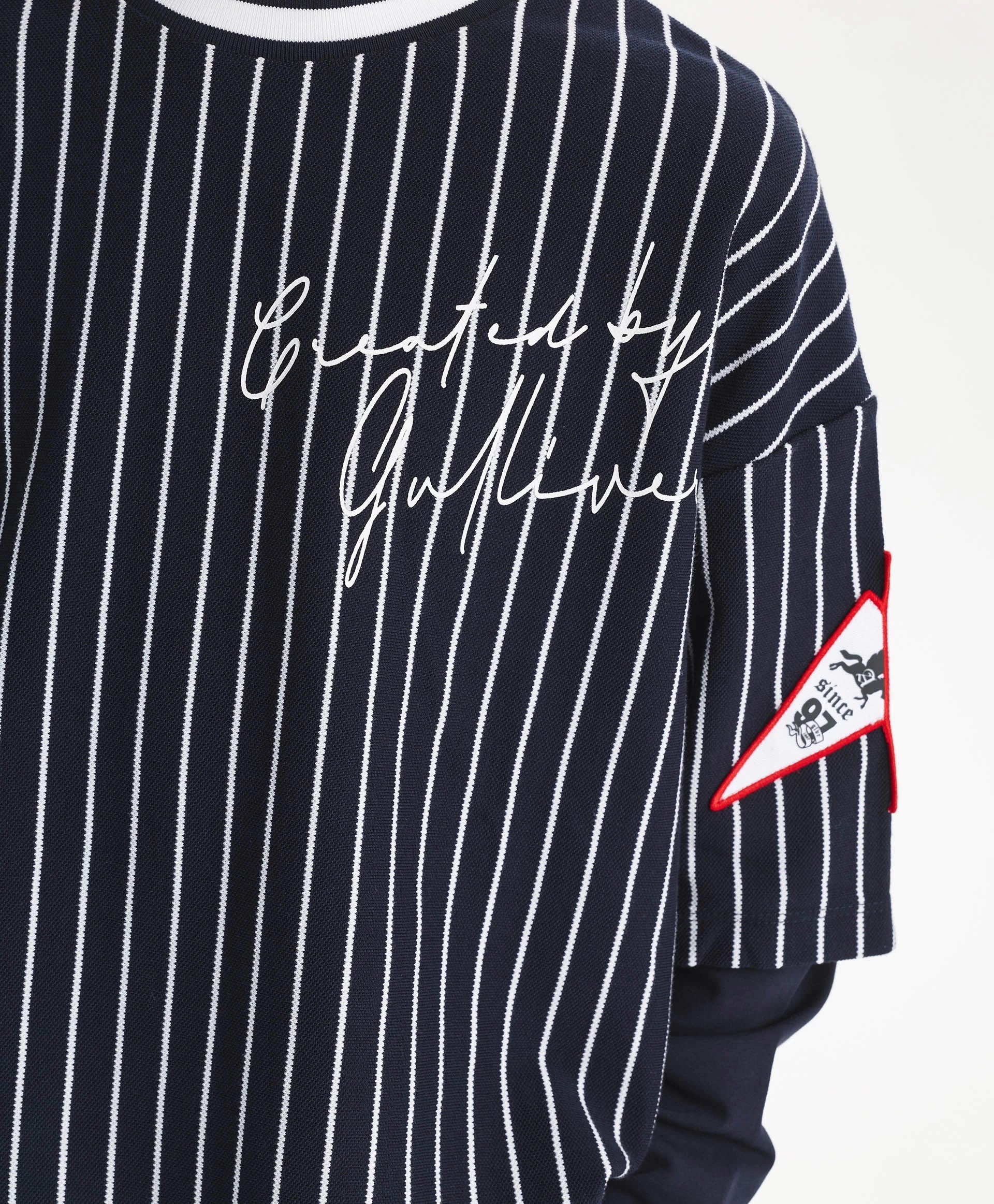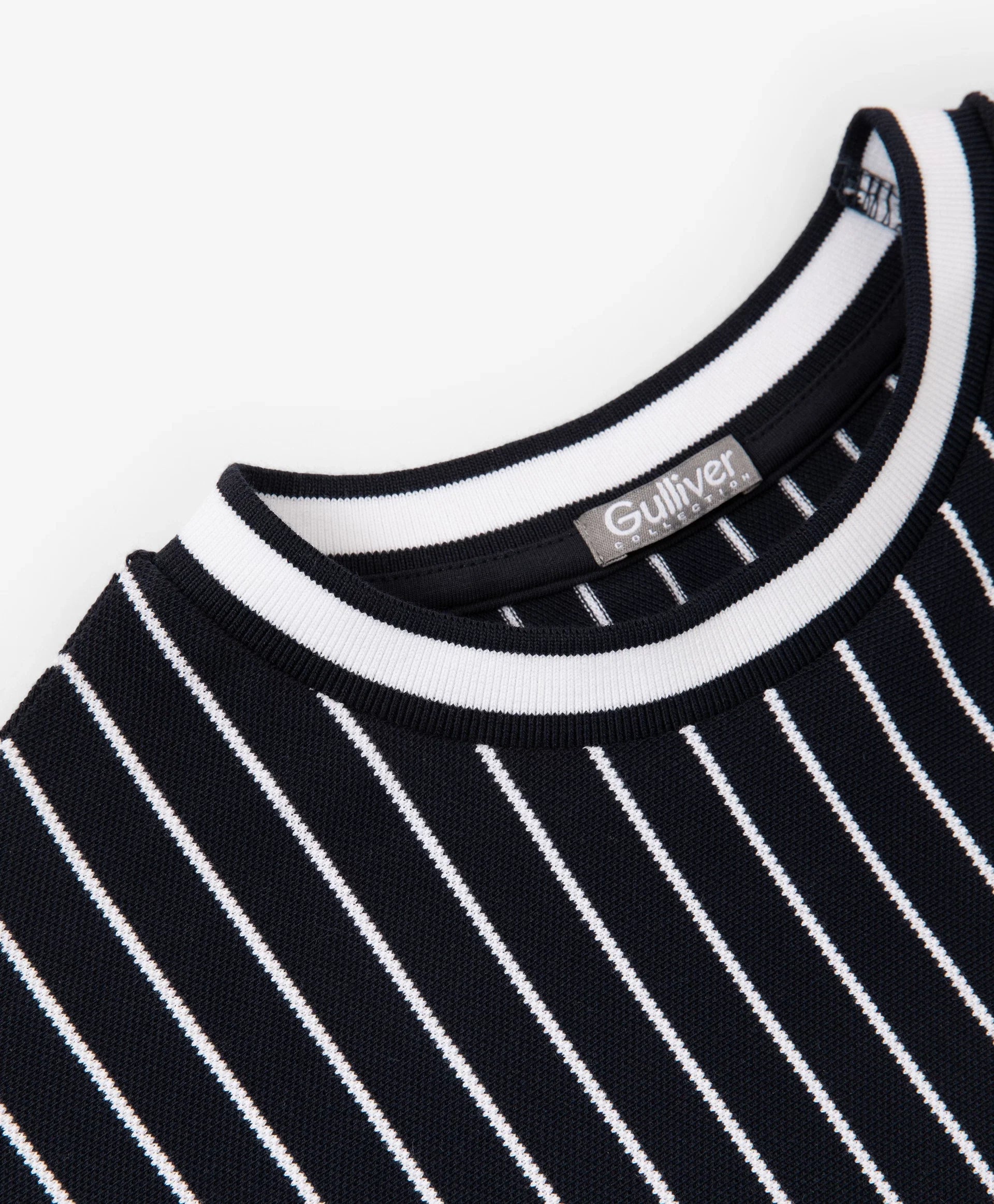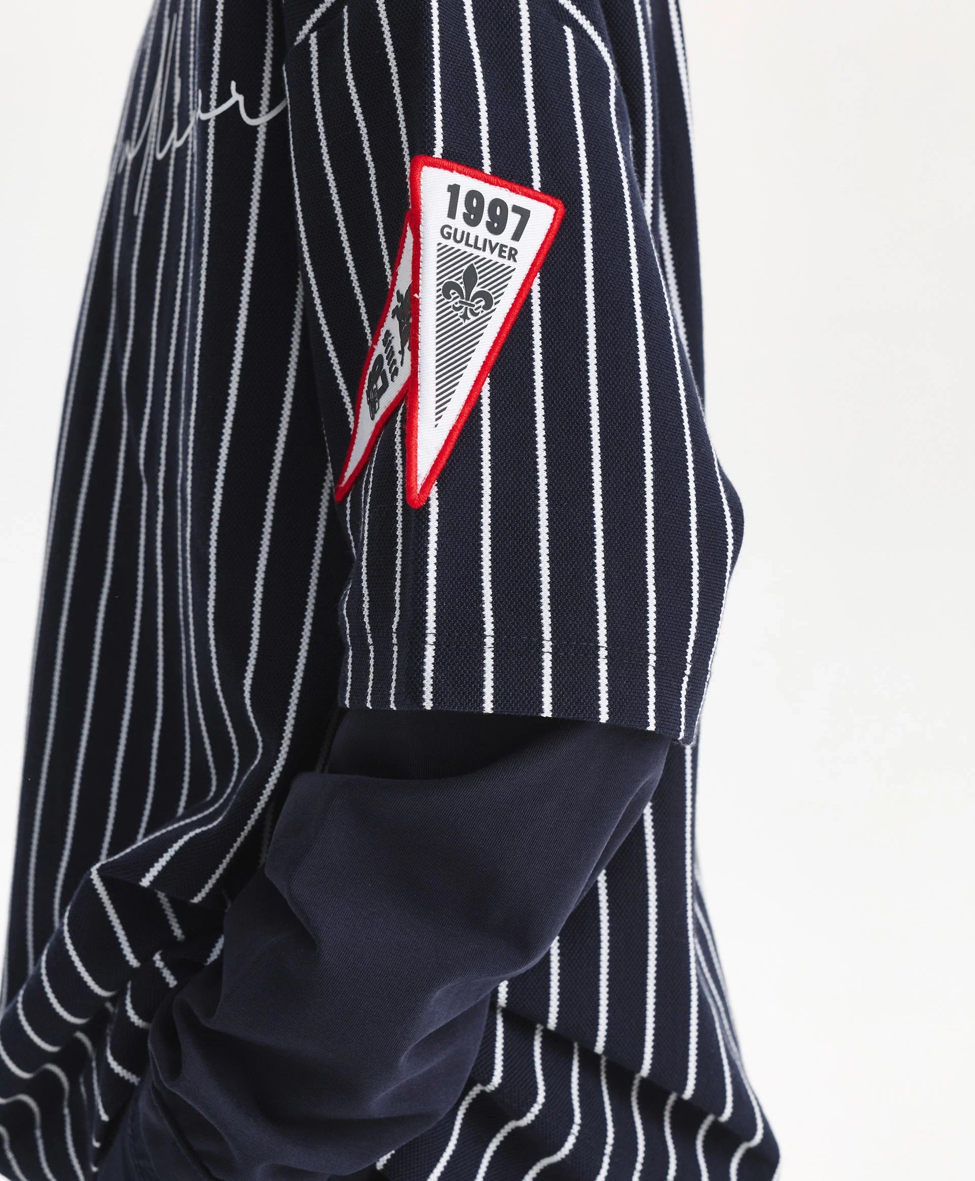Синият лонгслив с оувърсайз силует и удължена задна част е модерен, остър и интересен елемент от гардероба за свободното време на момчето. Дизайнът е изграден върху многопластовост и ярки белези на спортния стил. Съчетава памучно пике на вертикални райета и едноцветен трикотаж, шрифтови графики, хералдически мотиви, нашивки, рипсена О-образна яка с контрастни кантове – всички те отразяват вайба на колекцията Gulliver „Колеж“, вдъхновена от атмосферата на частни училища и спортни отбори.