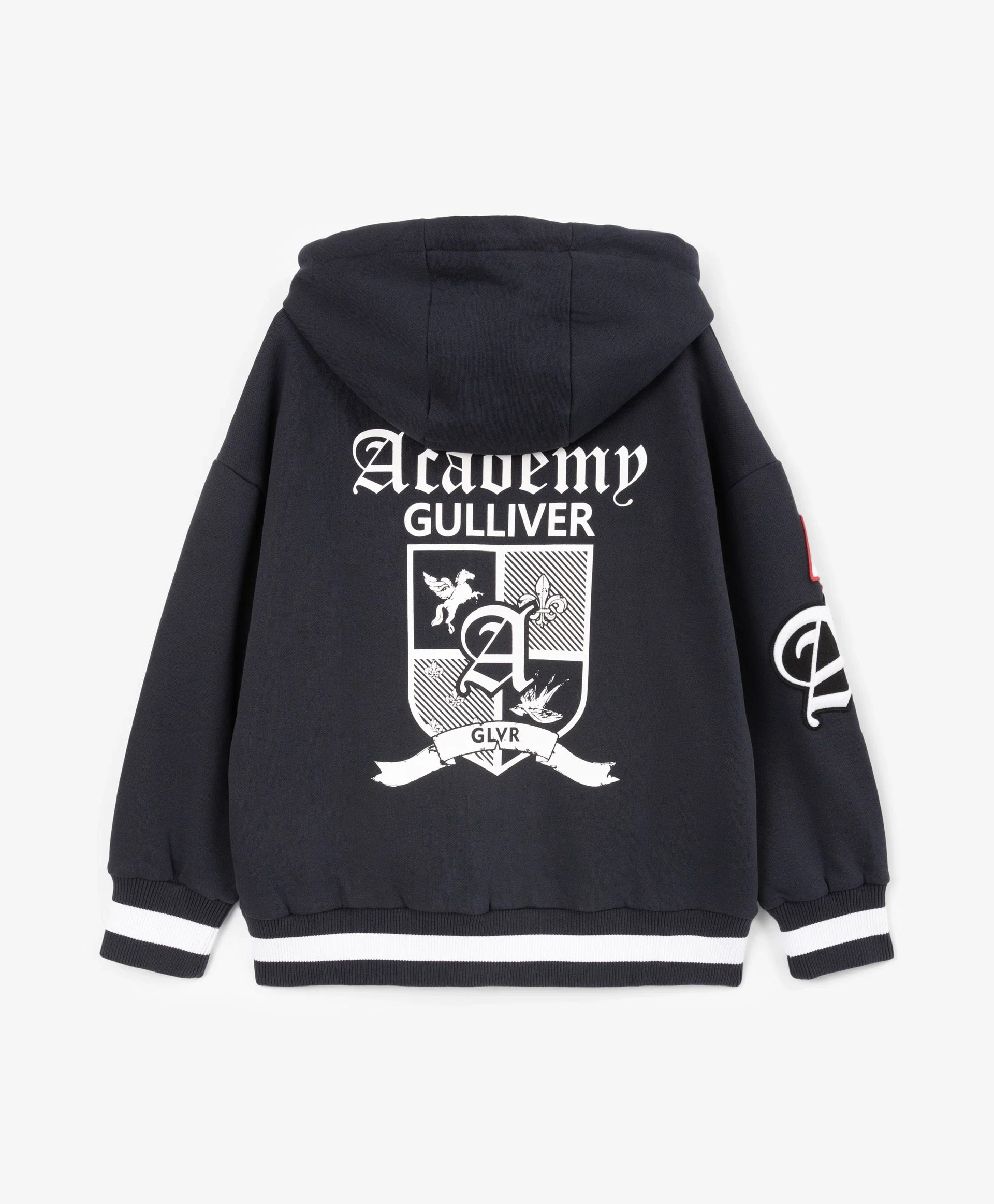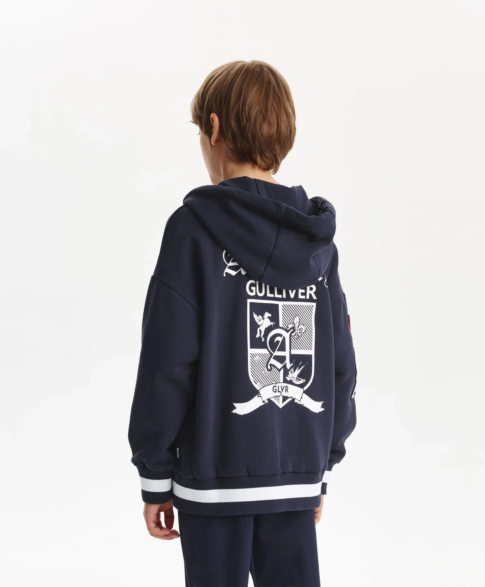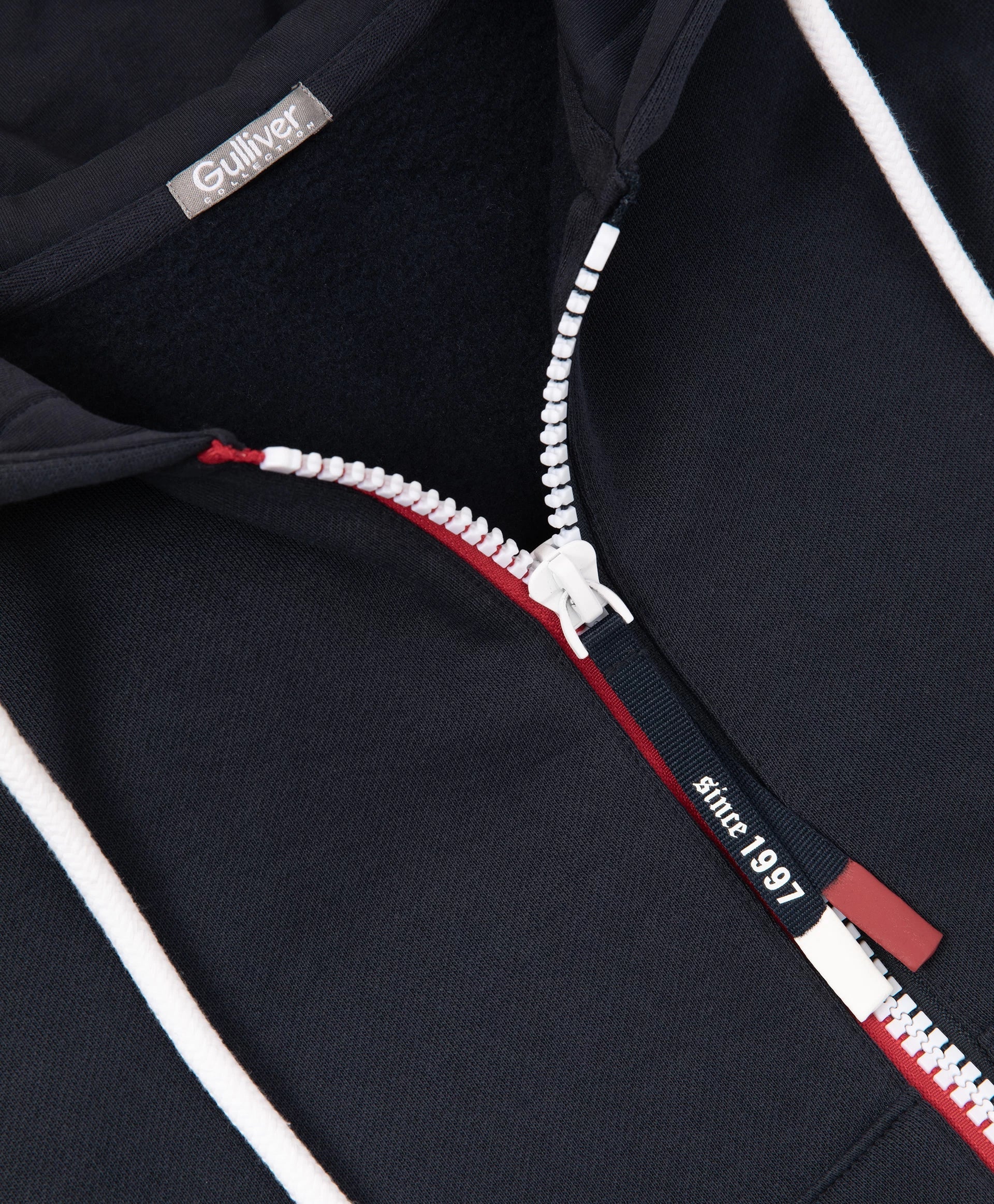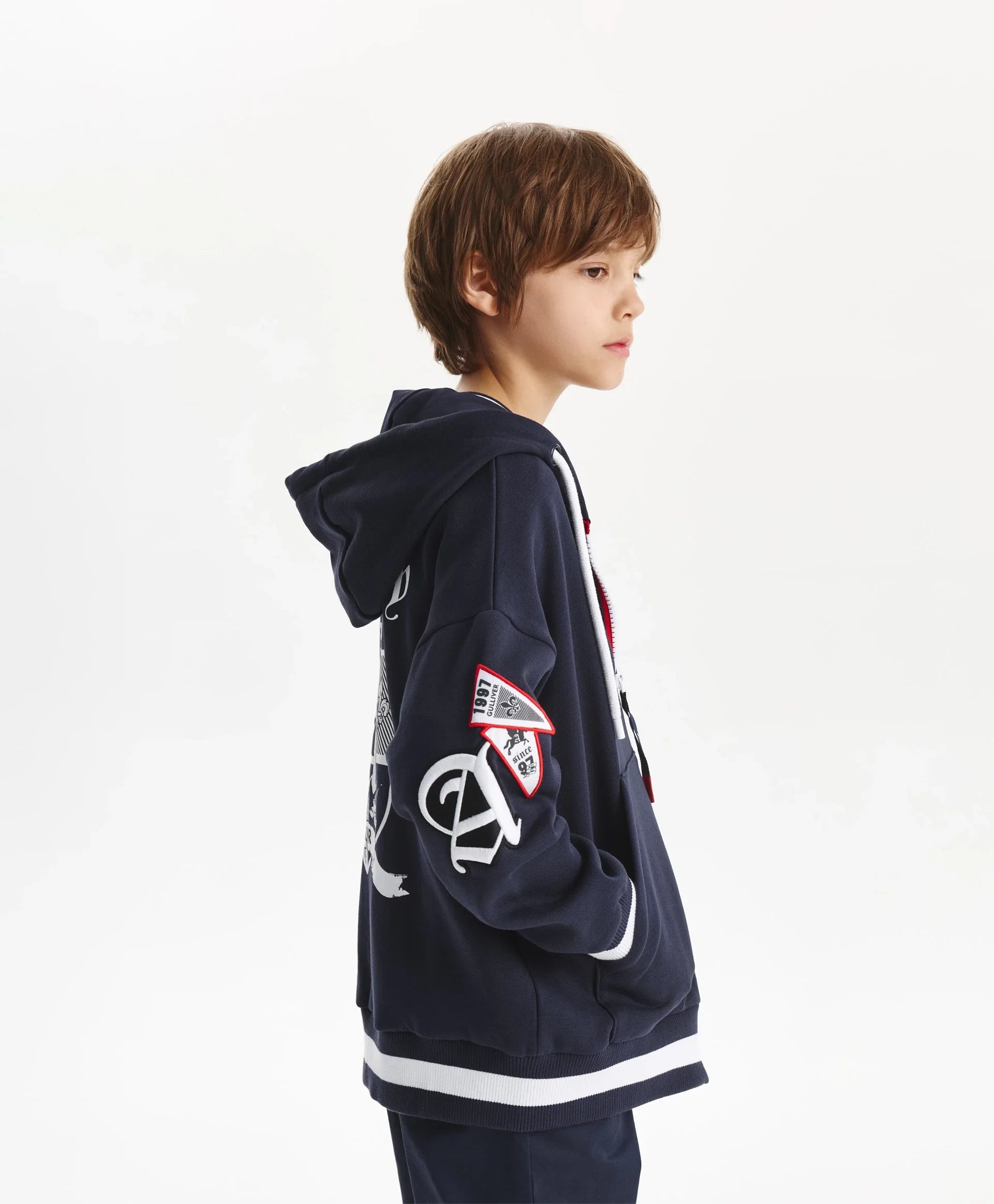 Разкопчаващото се суитшърт яке-бомбер с качулка от футер с мека вътрешна страна е модерен и удобен елемент на есенно-зимната визия, изграден върху белезите на спортния стил! Големи принтове с хералдически мотиви, шрифтови графики, кенгуру джоб, контрастни връзки с ляти накрайници, рипсени кантове по долния край и ръкавите отразяват вайба на колекцията Gulliver „Колеж“. Закопчава се с тракторен цип върху двуцветна лента с акцентен плъзгач.