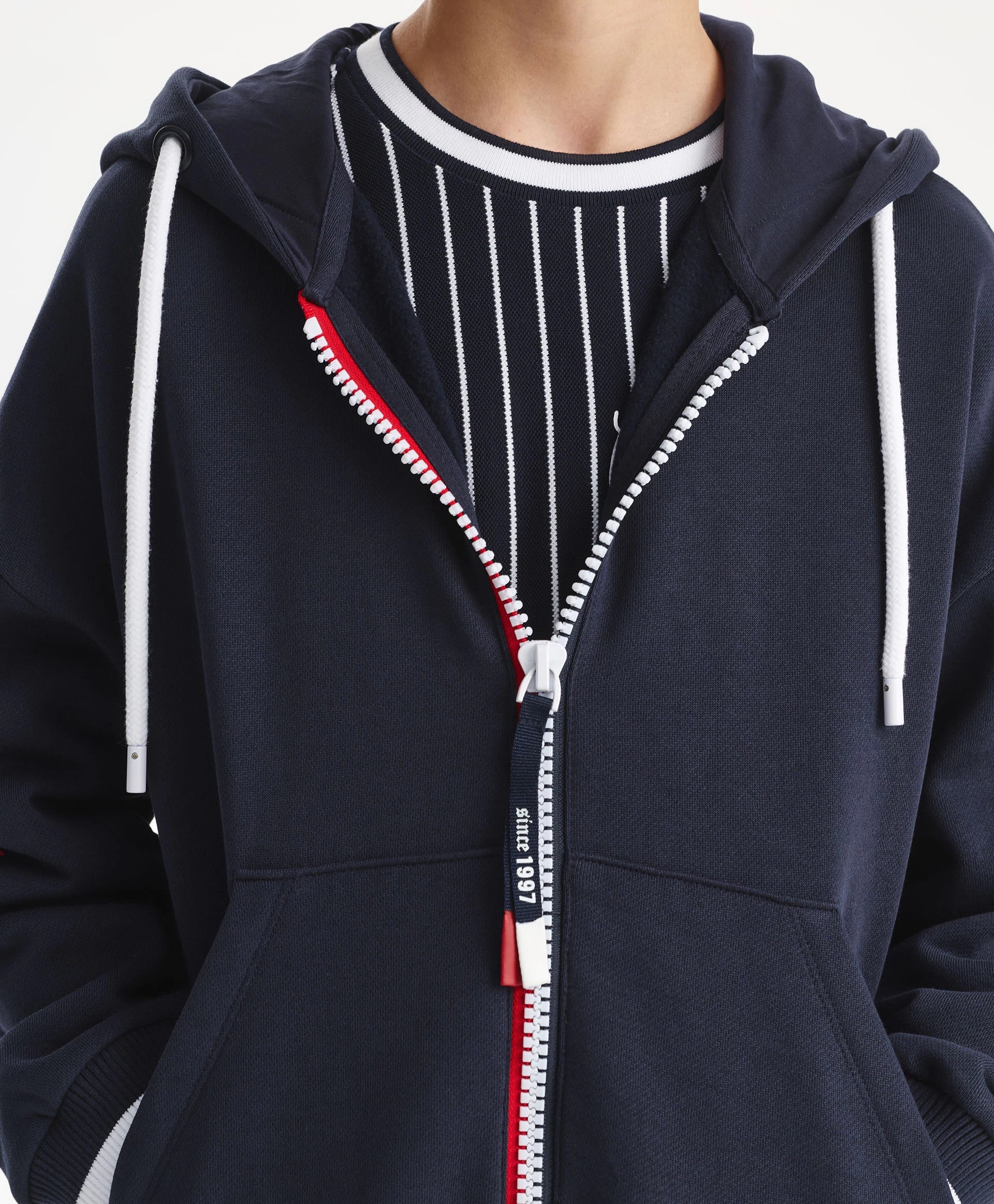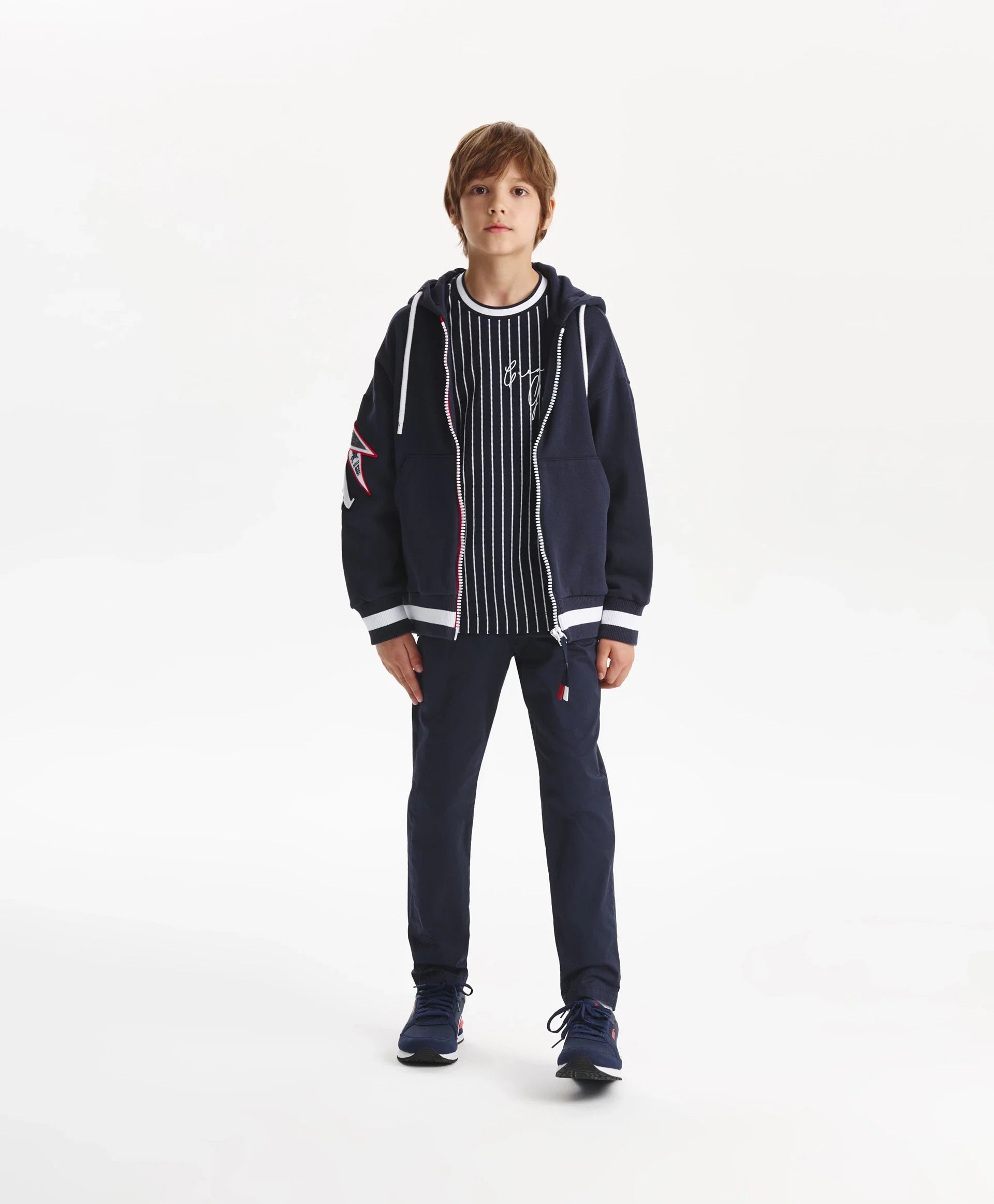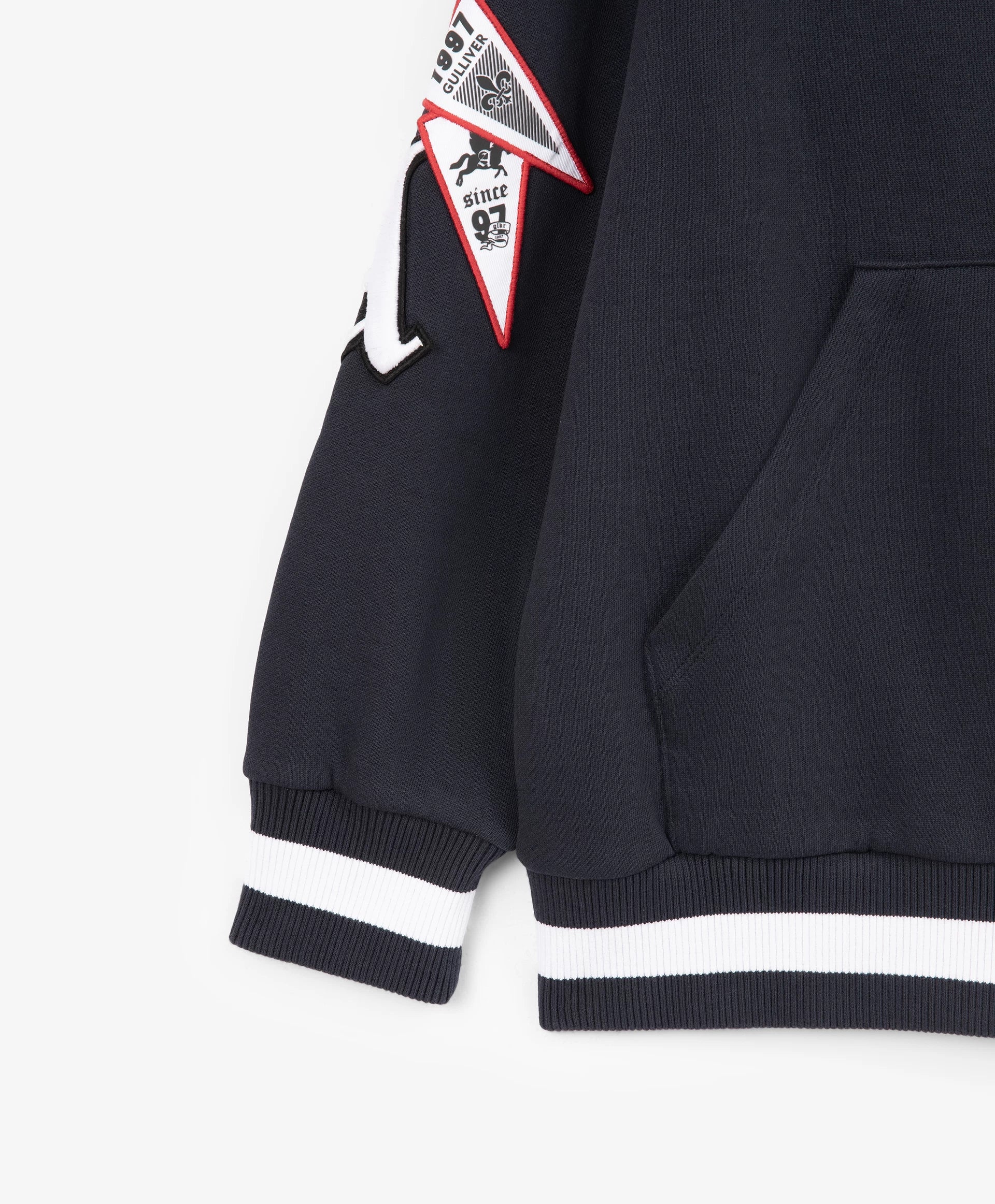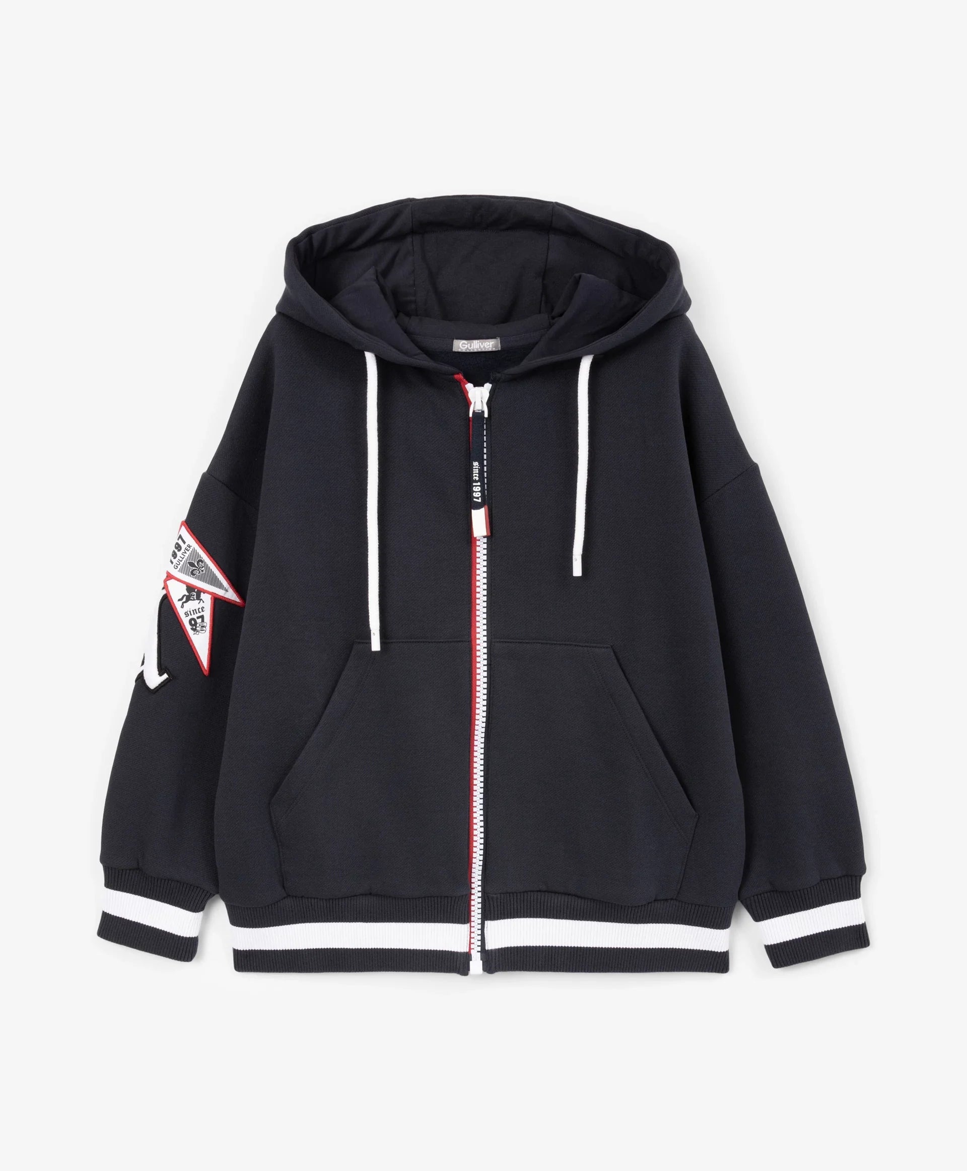 Разкопчаващото се суитшърт яке-бомбер с качулка от футер с мека вътрешна страна е модерен и удобен елемент на есенно-зимната визия, изграден върху белезите на спортния стил! Големи принтове с хералдически мотиви, шрифтови графики, кенгуру джоб, контрастни връзки с ляти накрайници, рипсени кантове по долния край и ръкавите отразяват вайба на колекцията Gulliver „Колеж“. Закопчава се с тракторен цип върху двуцветна лента с акцентен плъзгач.