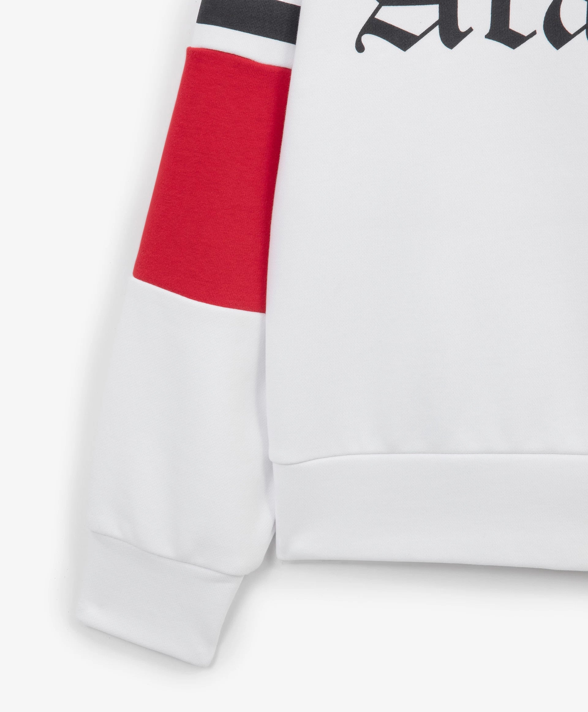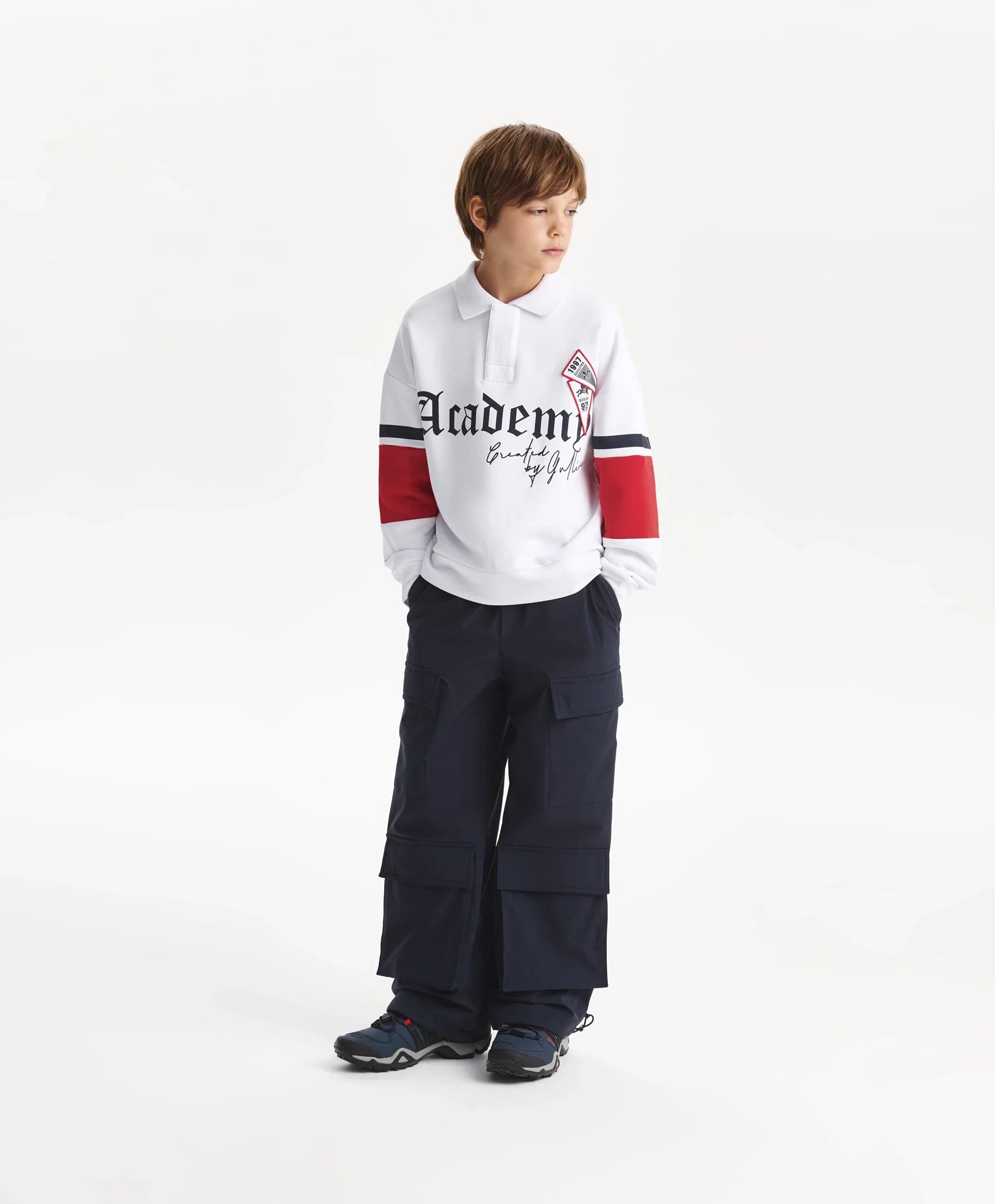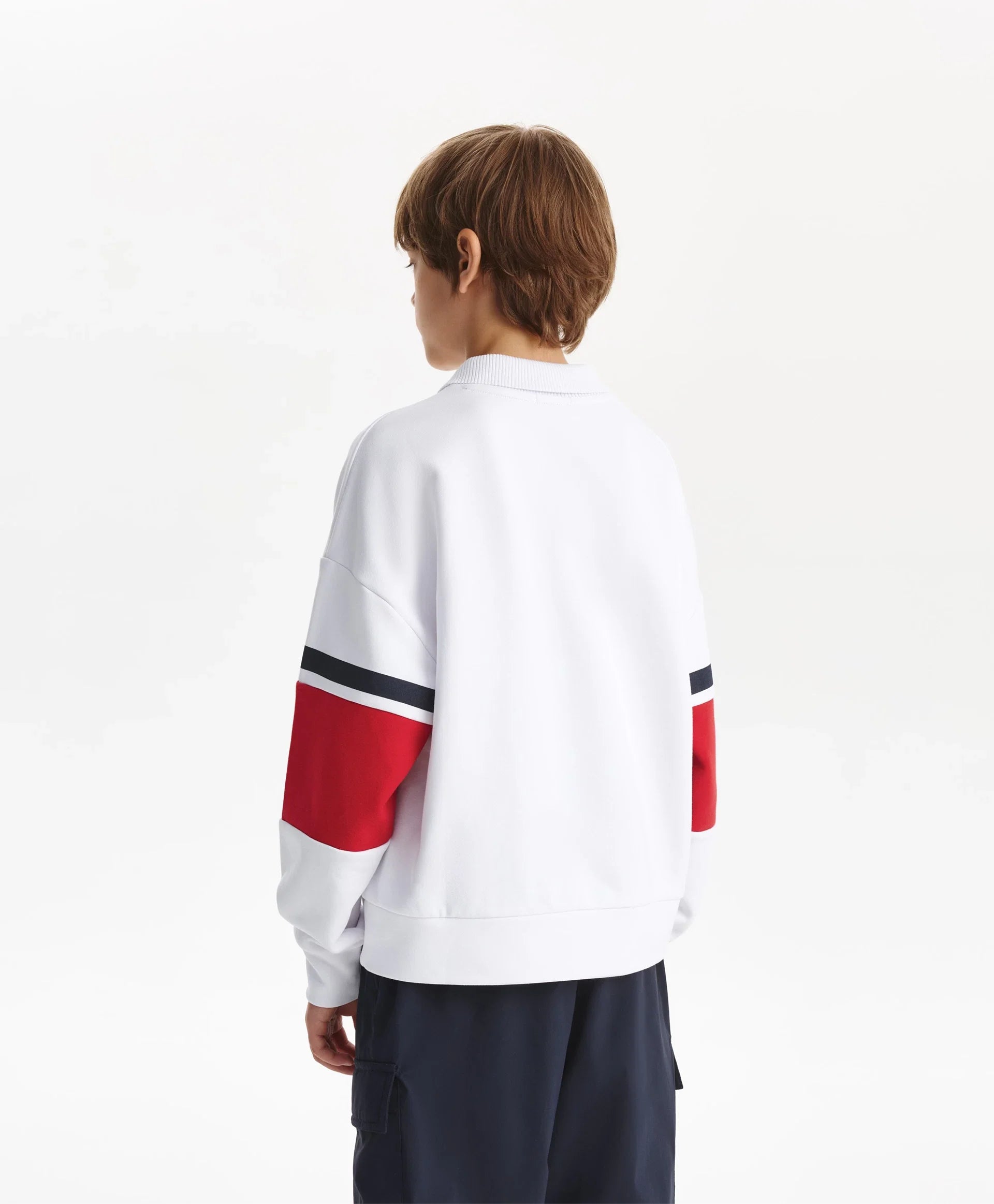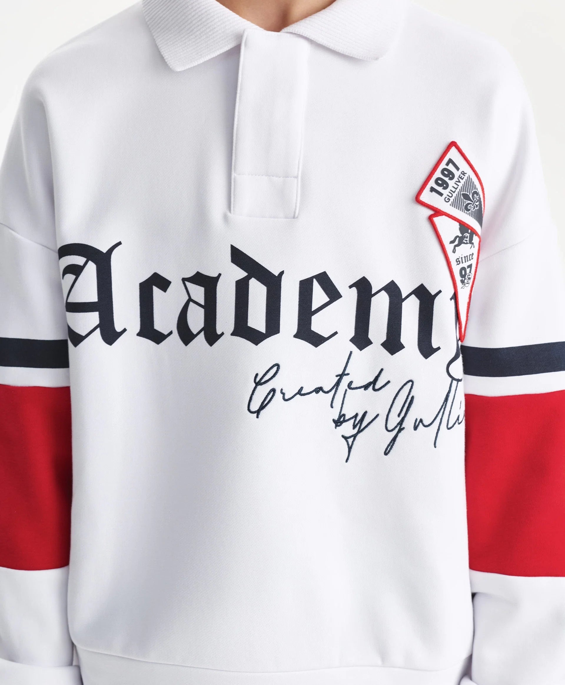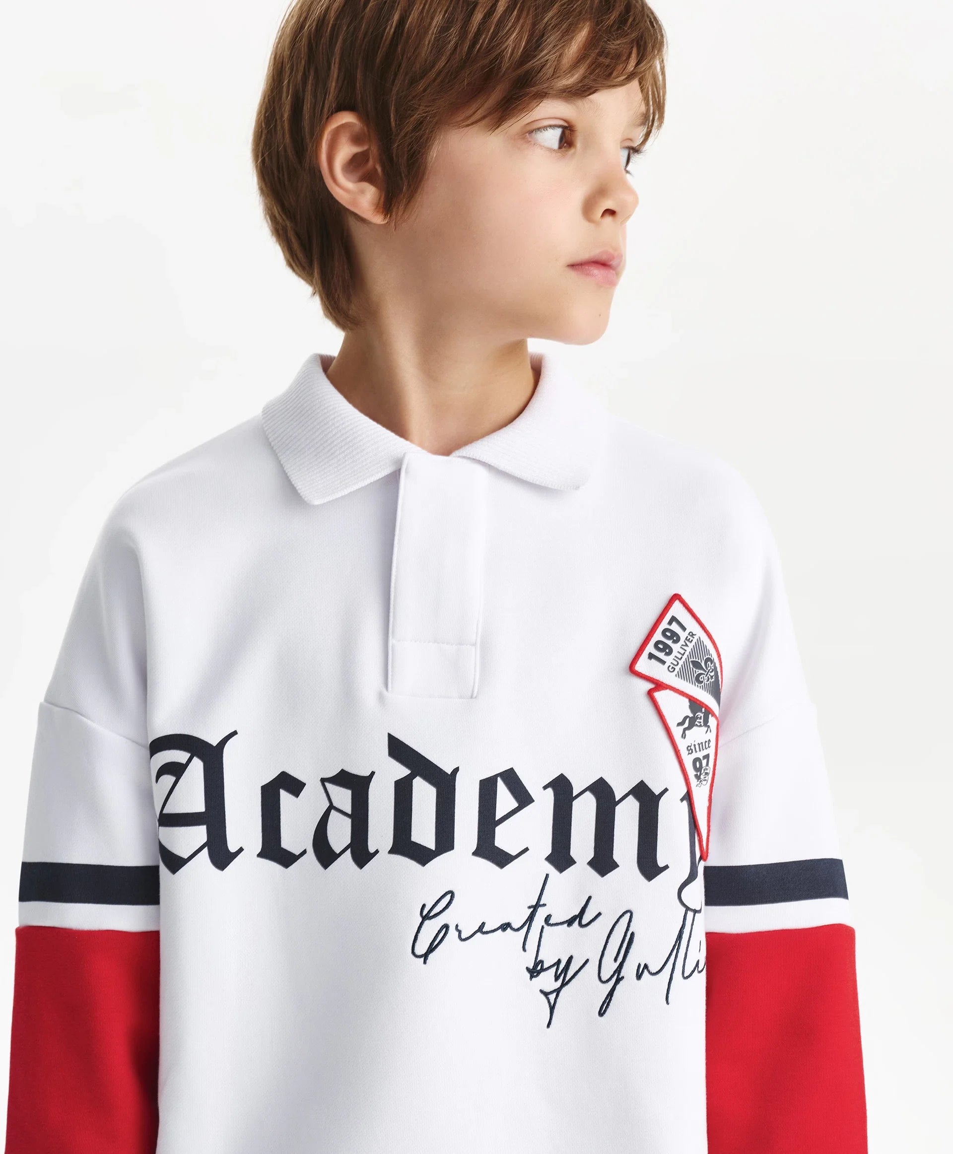 Бялото поло от футер с мека хавлиена вътрешност придава на визията на момчето аристократичност на препи стила и динамика на спорта. Дизайнът съчетава цветови блокове, шрифтови елементи и нашивки, отразяващи вайба на колекцията Gulliver „Колеж“. Поло блузата се закопчава с копчета тик-так.
