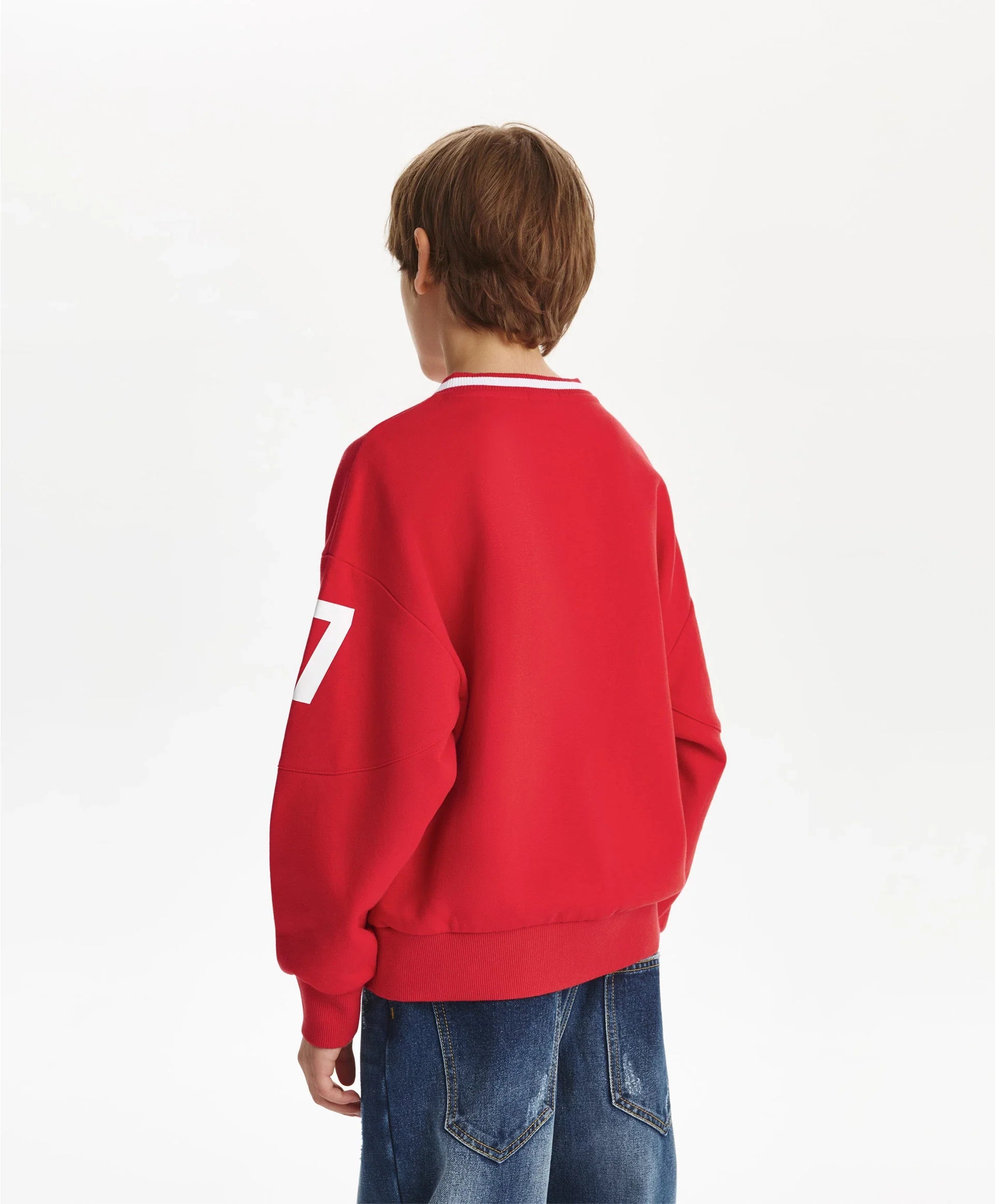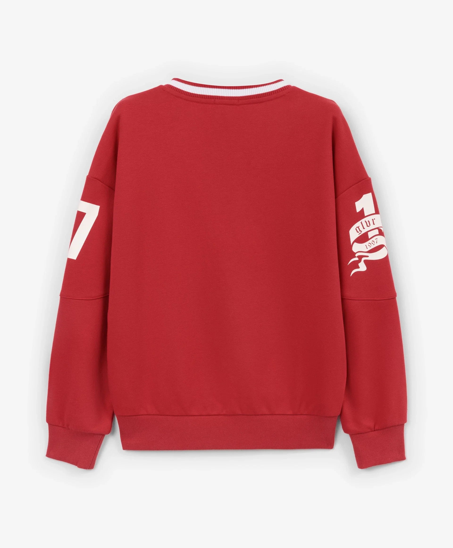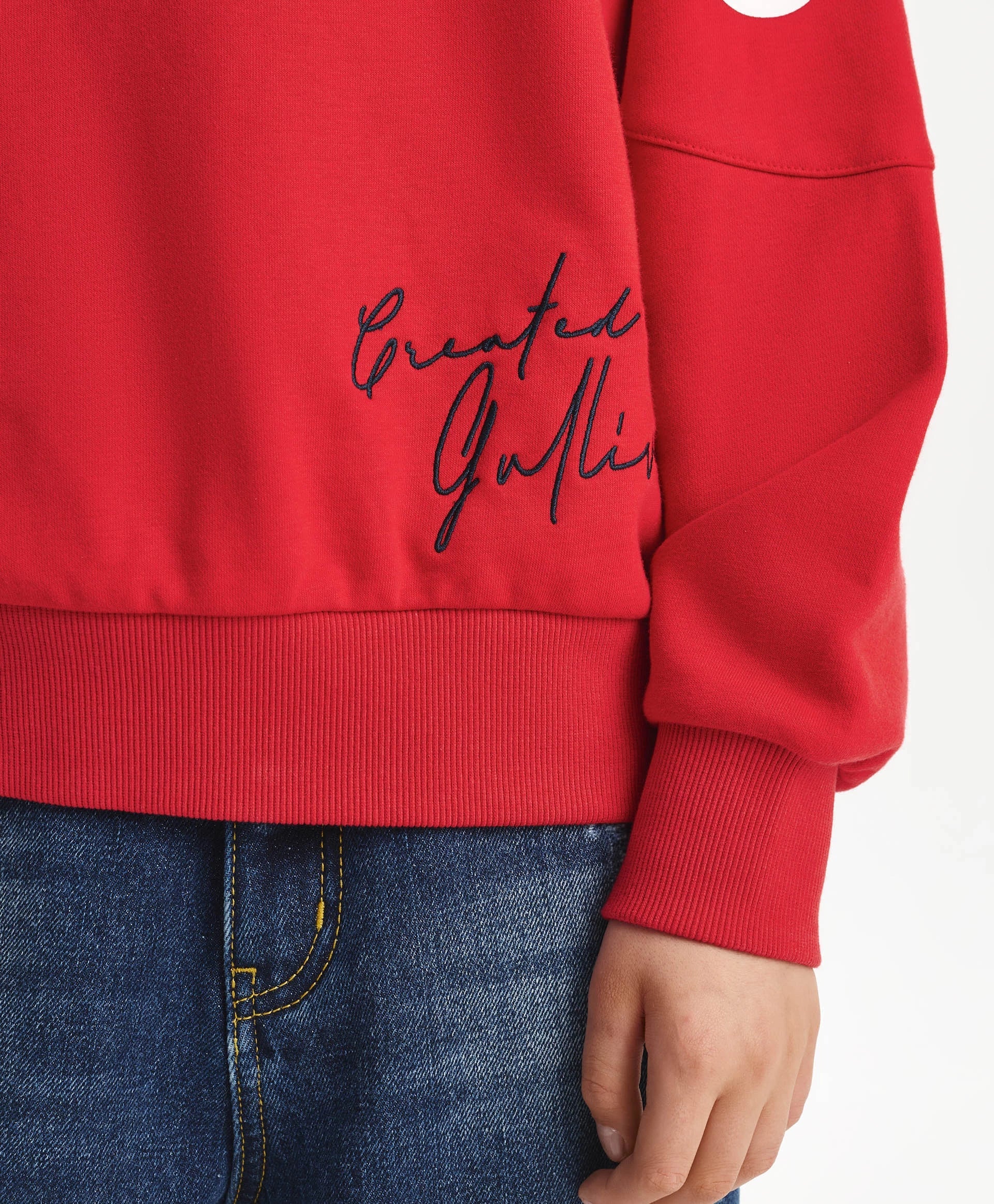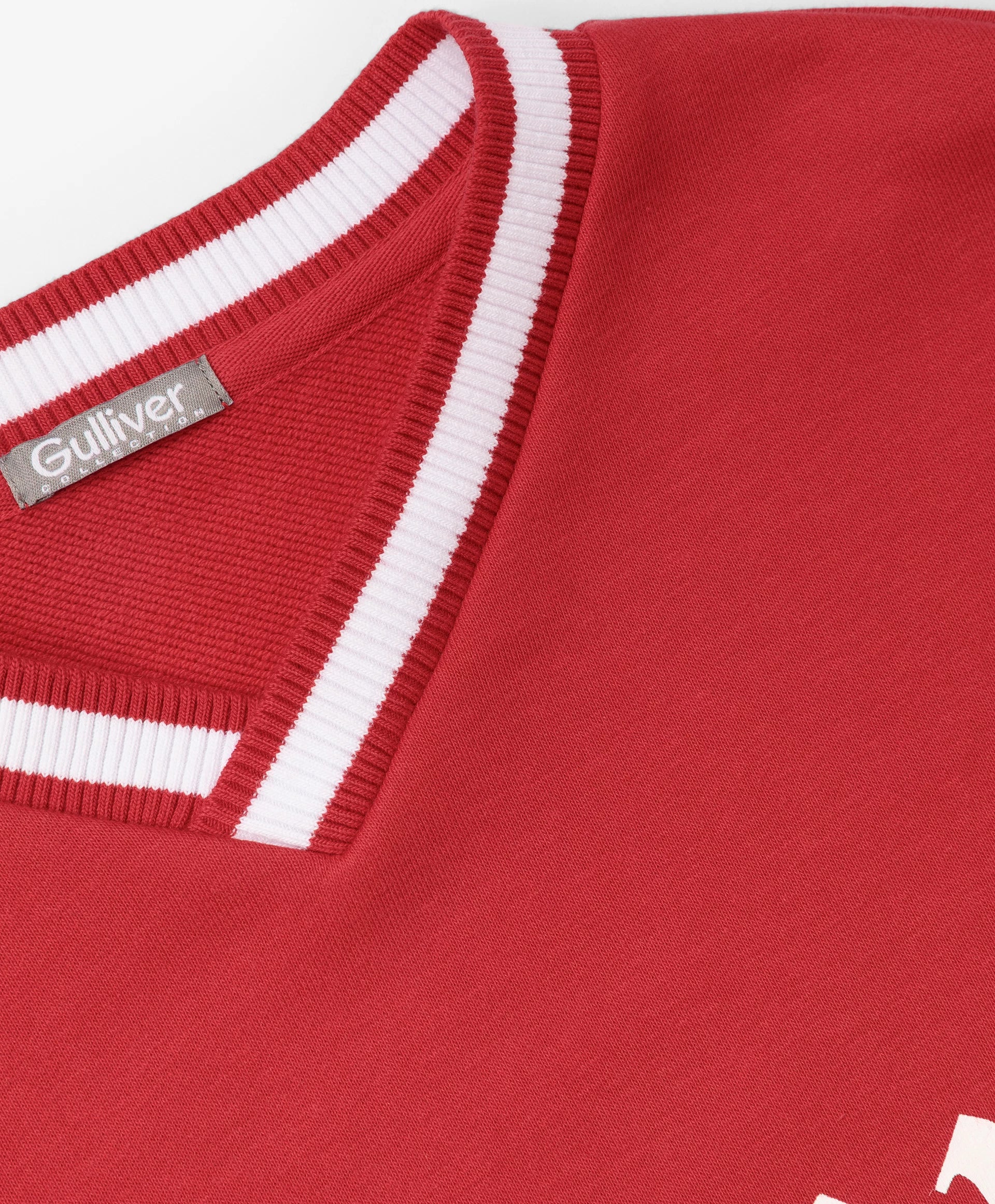 Яркият, динамичен, енергичен червен суитшърт от футер с мека хавлиена вътрешност ще внесе динамика и острота на спортния стил. Украсен е с големи шрифтови принтове и контрастна кантовка по V-образната яка, отразяващи вайба на колекцията Gulliver „Колеж“.