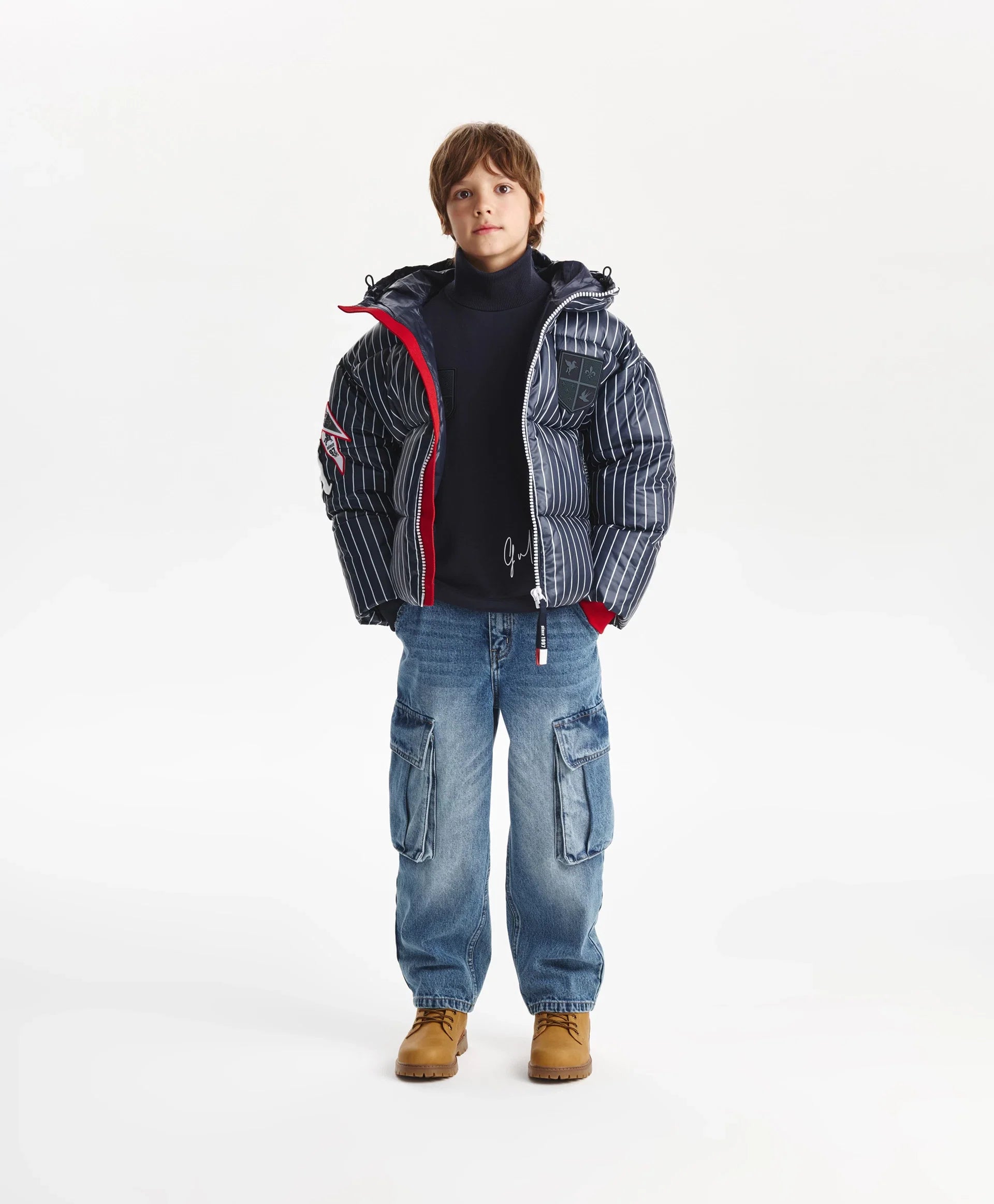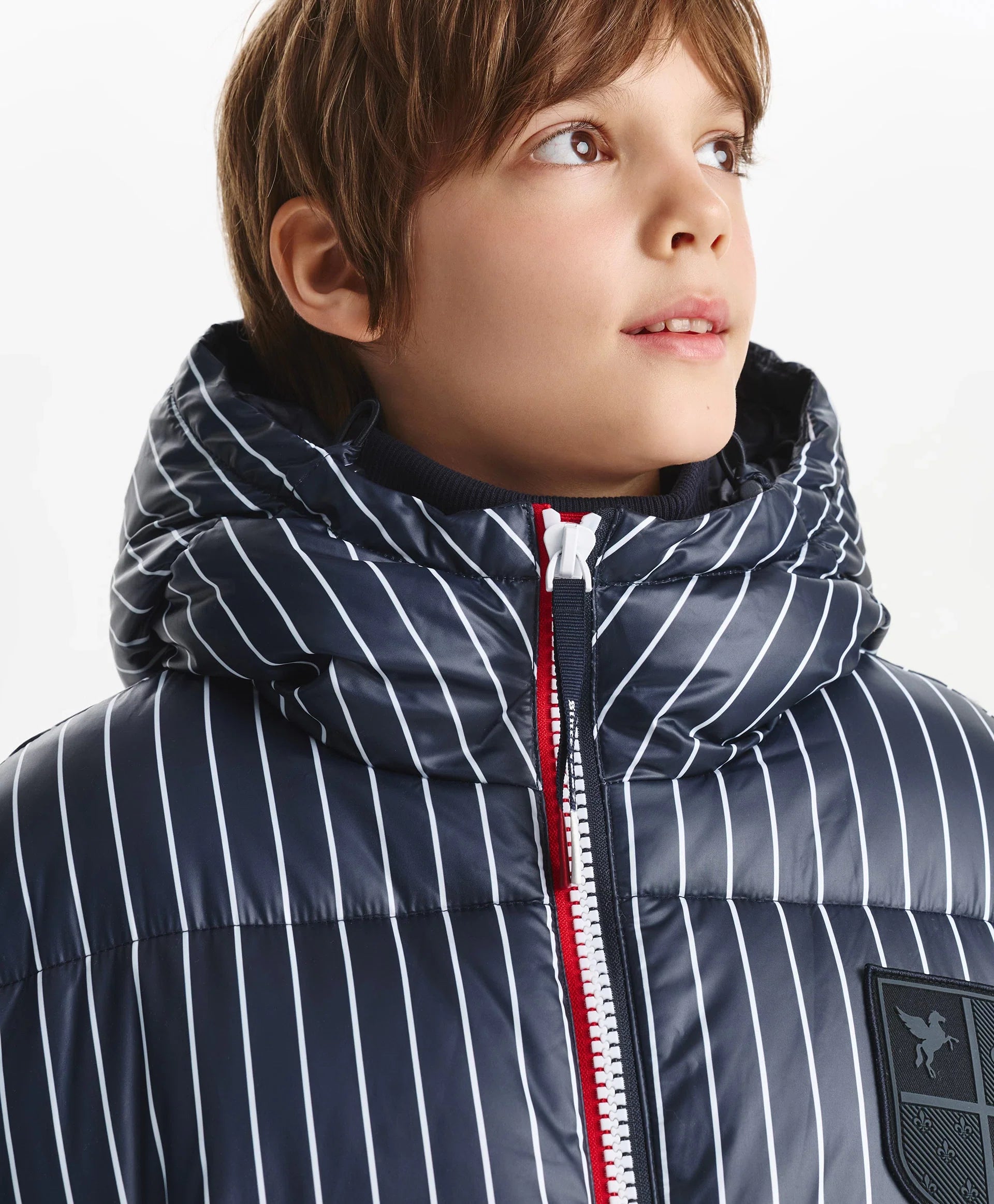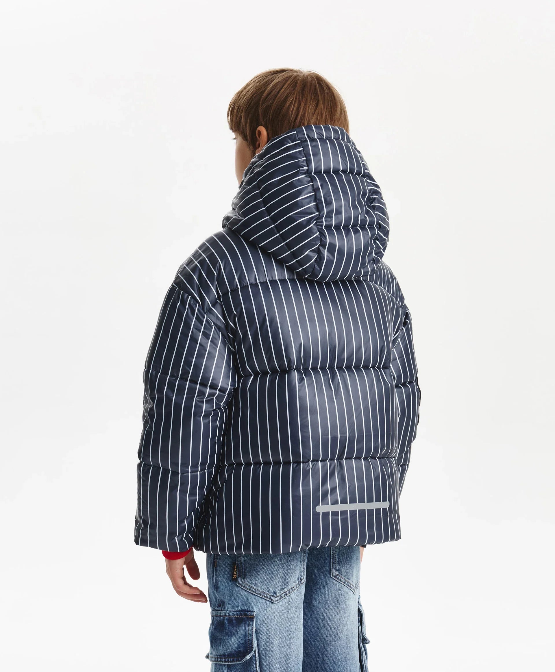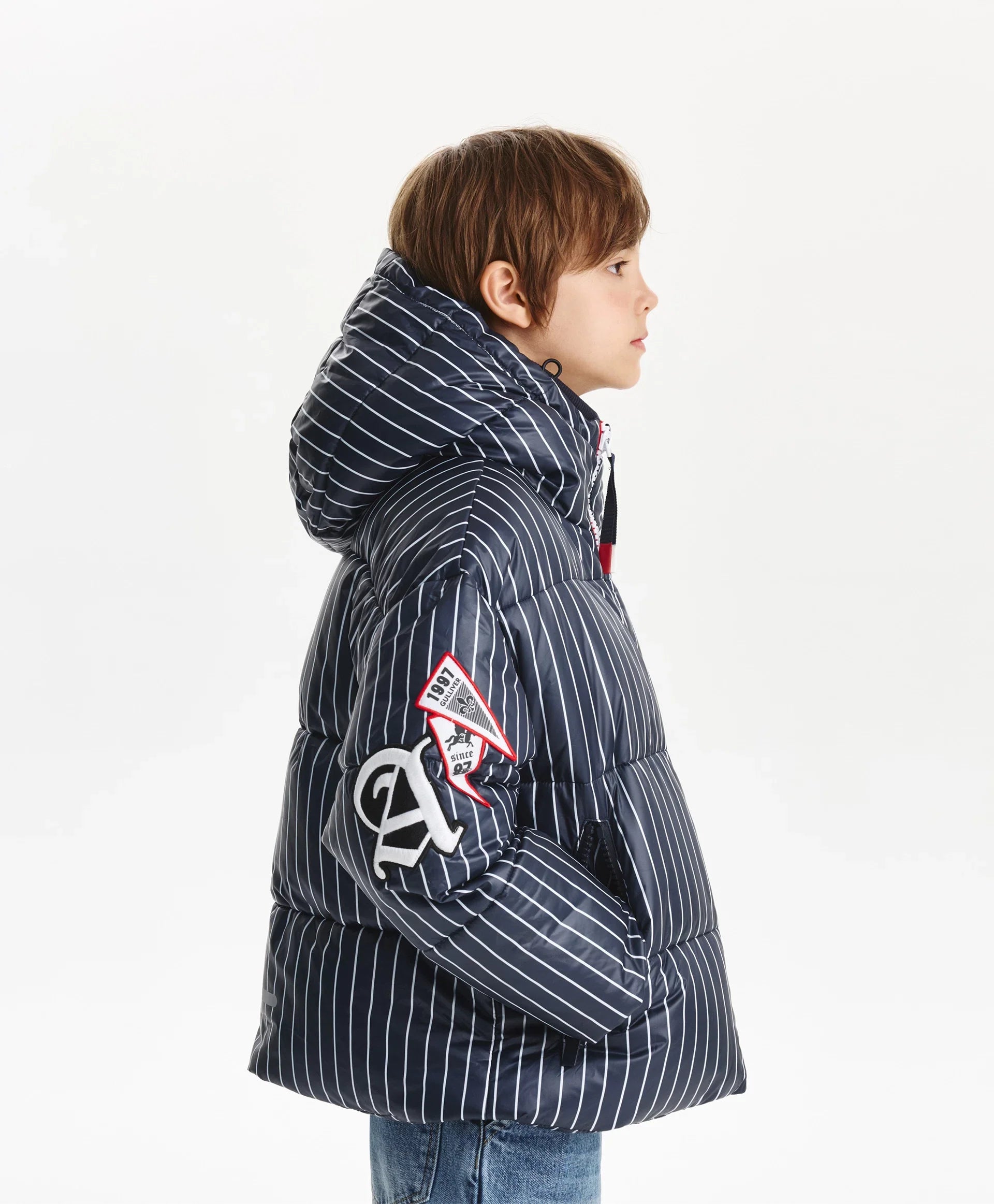 Синьото демисезонно яке на тънки вертикални райета е ярка и необичайна дреха, подчертаваща стила и индивидуалността на момчето. Капитонираното яке със синтетичен пух е изработено от влагоустойчива промазка с лек мокър блясък и тънка мека подплата. Дизайнът съчетава динамични райета и интересни декори: емблеми, нашивки, шрифтови композиции, допълнени от цветни детайли. Червена ветроустойчива платка, различни по цвят рипсени маншети с отвори за палци създават игрив елемент. Освен ефектния дизайн, якето има редица функционални детайли: вътрешни връзки по качулката и долния край, просторни странични джобове с тракторни ципове. Закопчава се с тракторен цип върху контрастна цветна лента с оригинален плъзгач. На гърба има светлоотразителен принт.