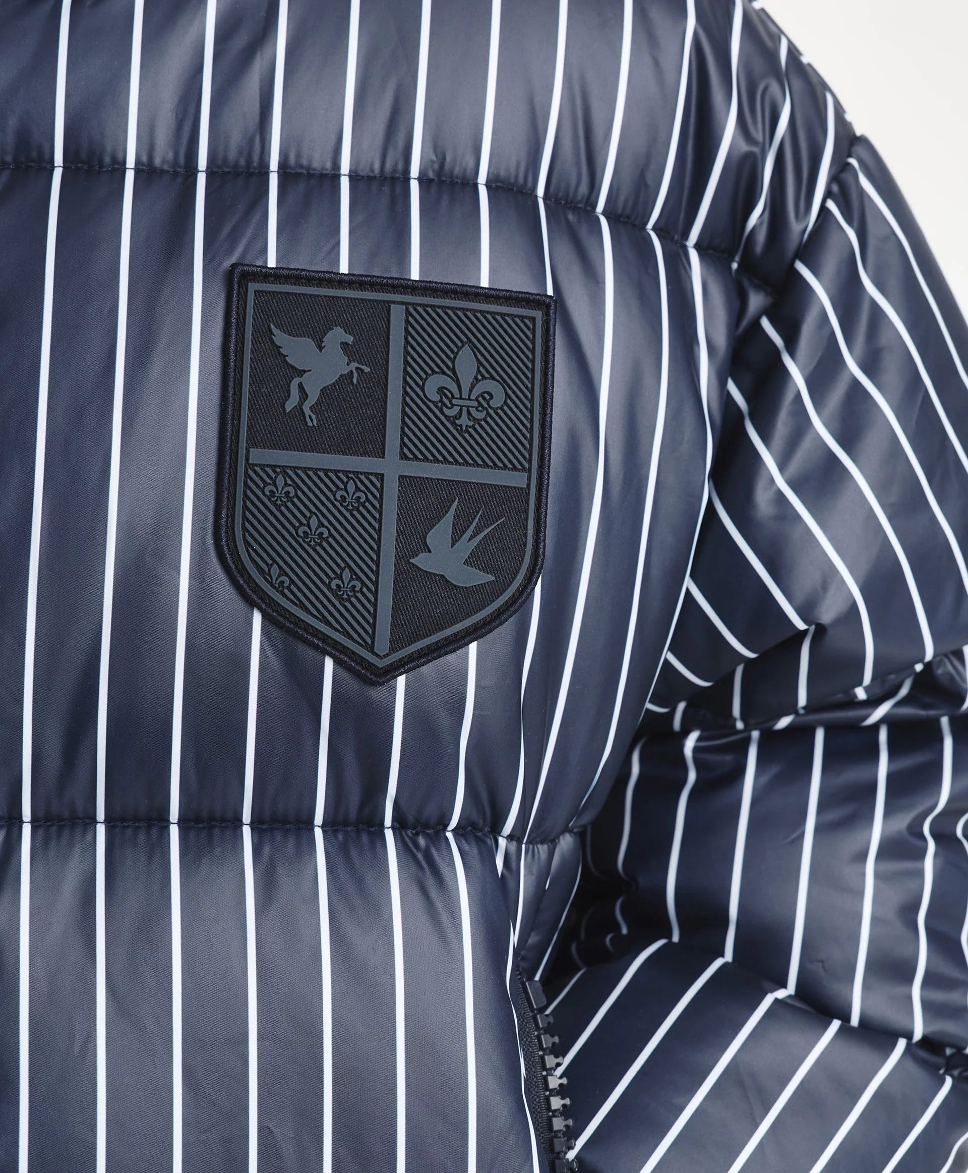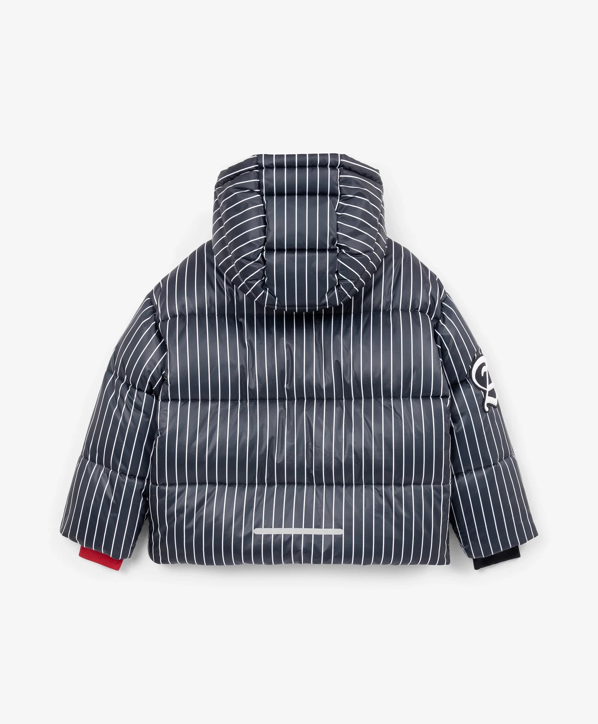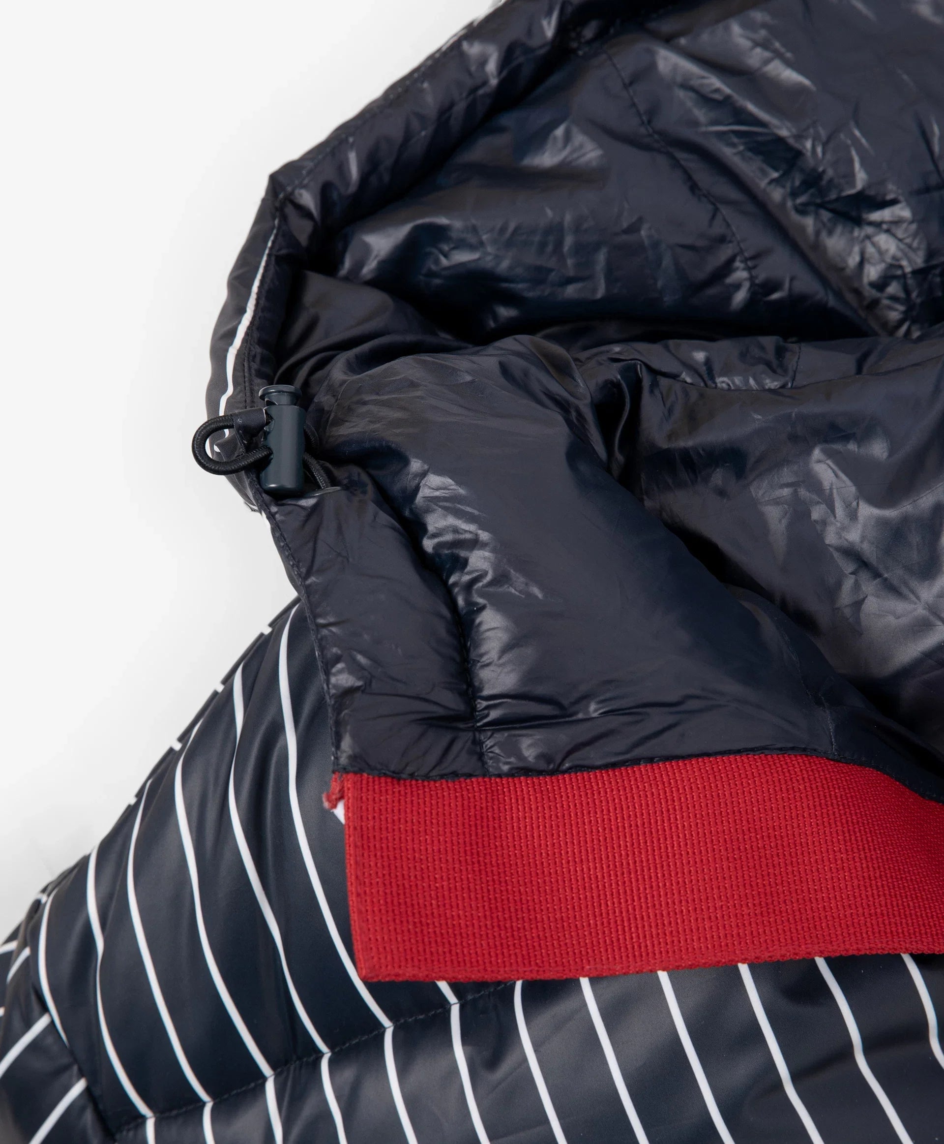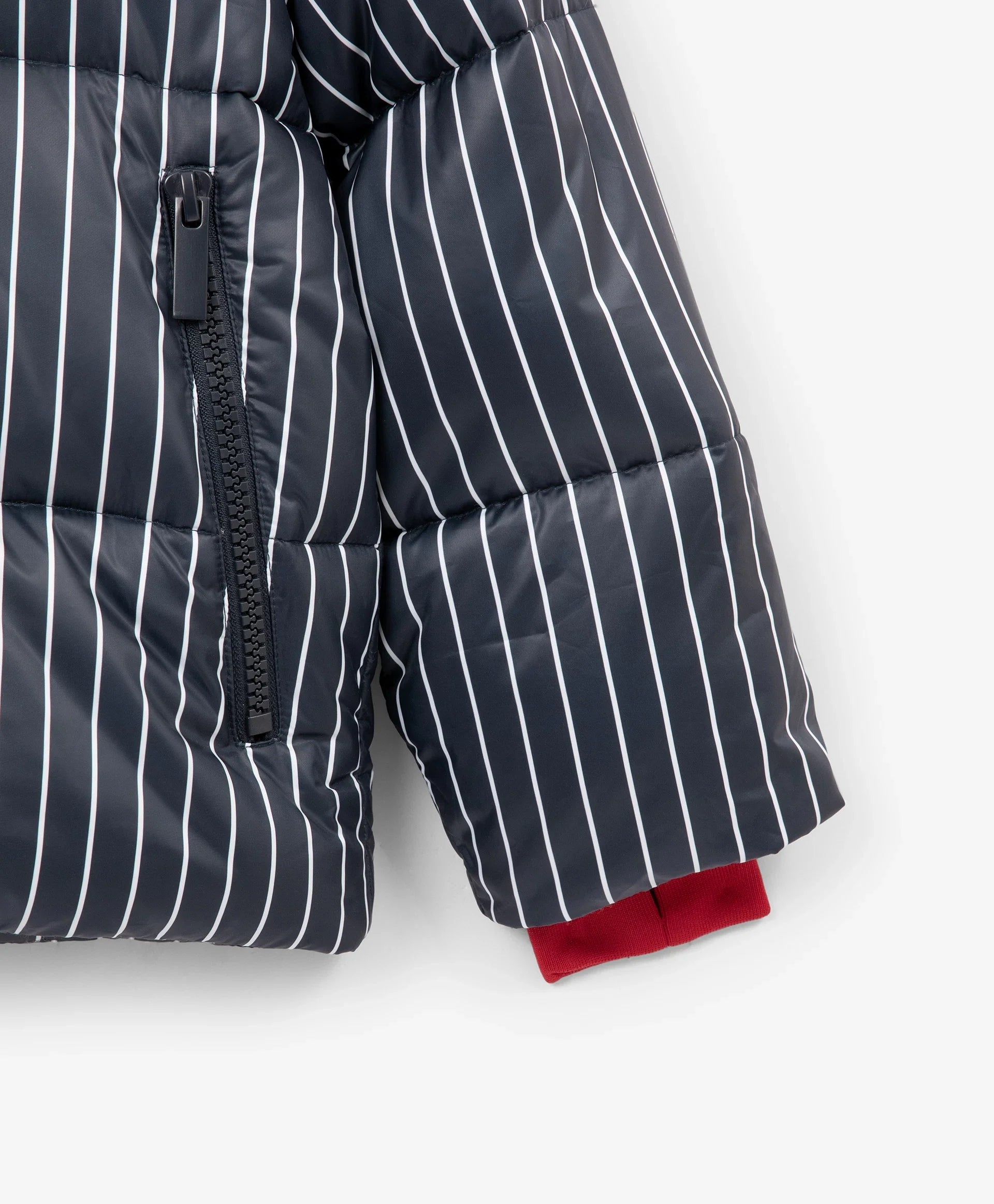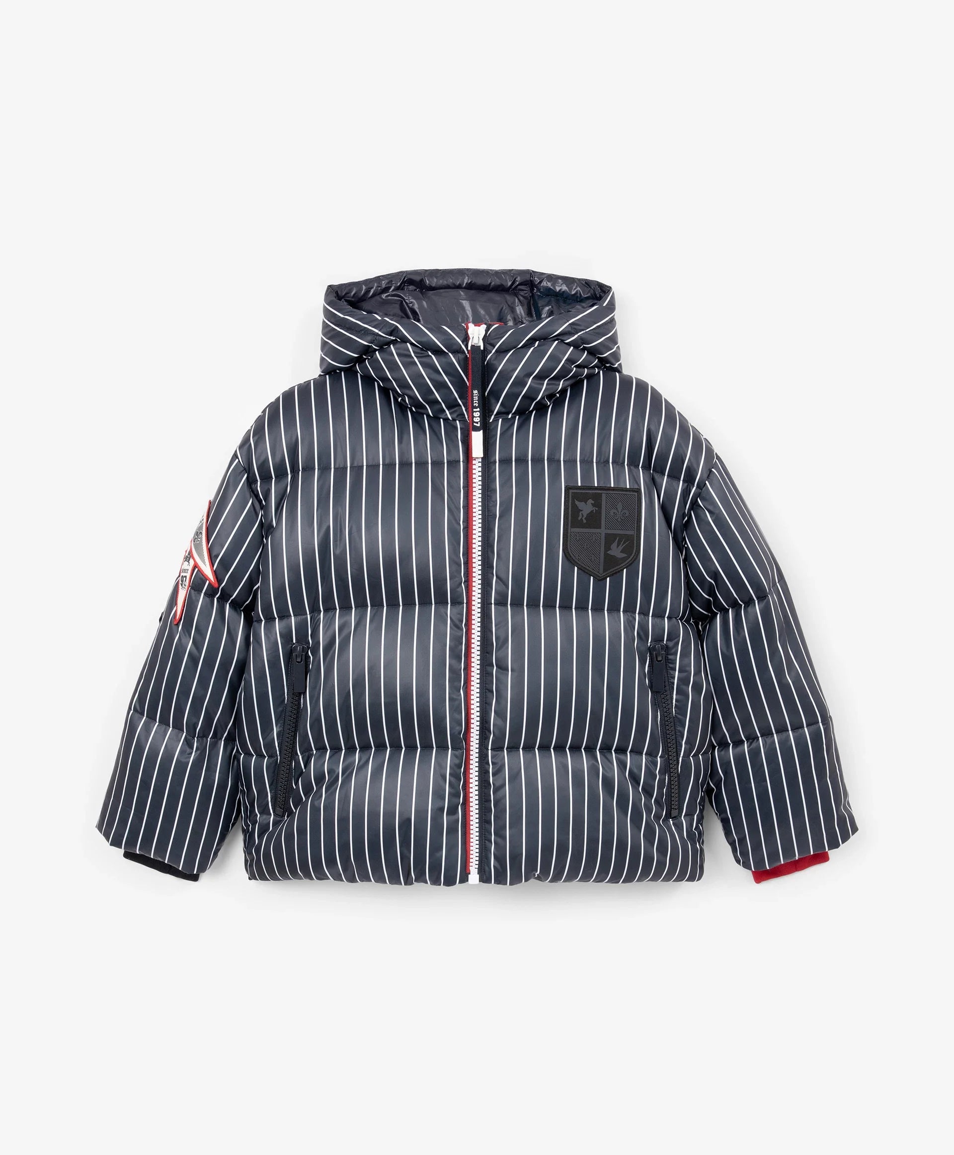 Синьото демисезонно яке на тънки вертикални райета е ярка и необичайна дреха, подчертаваща стила и индивидуалността на момчето. Капитонираното яке със синтетичен пух е изработено от влагоустойчива промазка с лек мокър блясък и тънка мека подплата. Дизайнът съчетава динамични райета и интересни декори: емблеми, нашивки, шрифтови композиции, допълнени от цветни детайли. Червена ветроустойчива платка, различни по цвят рипсени маншети с отвори за палци създават игрив елемент. Освен ефектния дизайн, якето има редица функционални детайли: вътрешни връзки по качулката и долния край, просторни странични джобове с тракторни ципове. Закопчава се с тракторен цип върху контрастна цветна лента с оригинален плъзгач. На гърба има светлоотразителен принт.