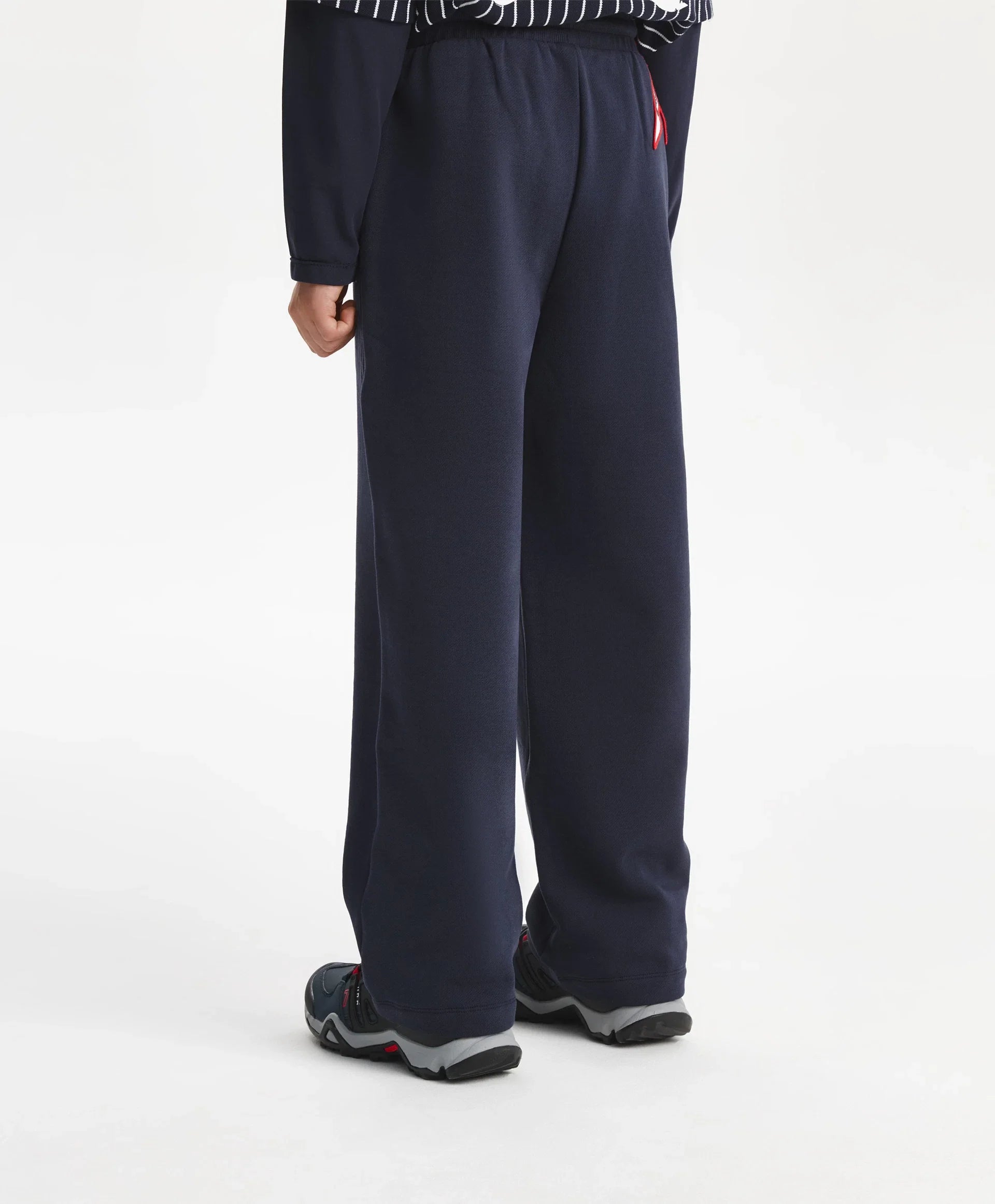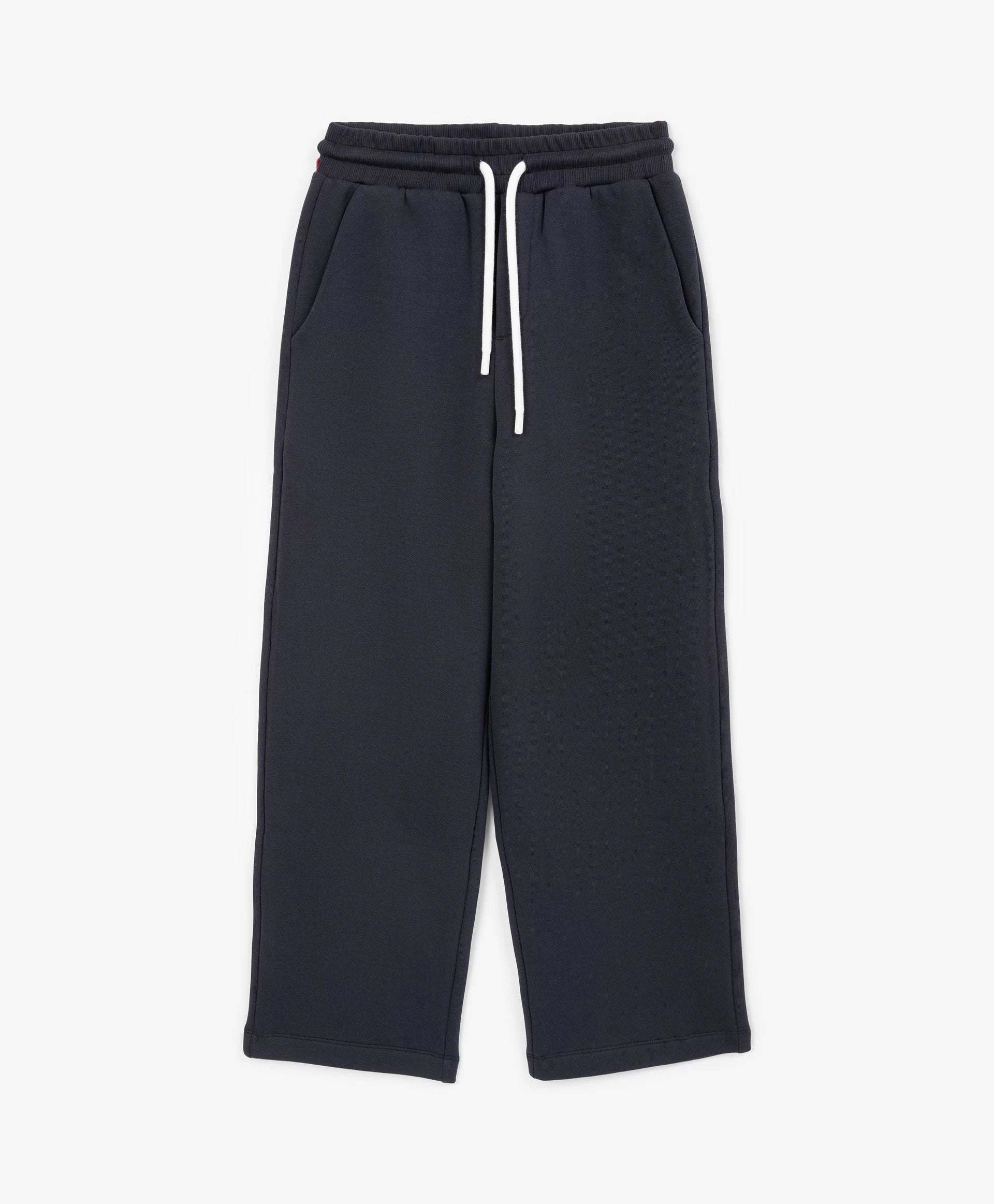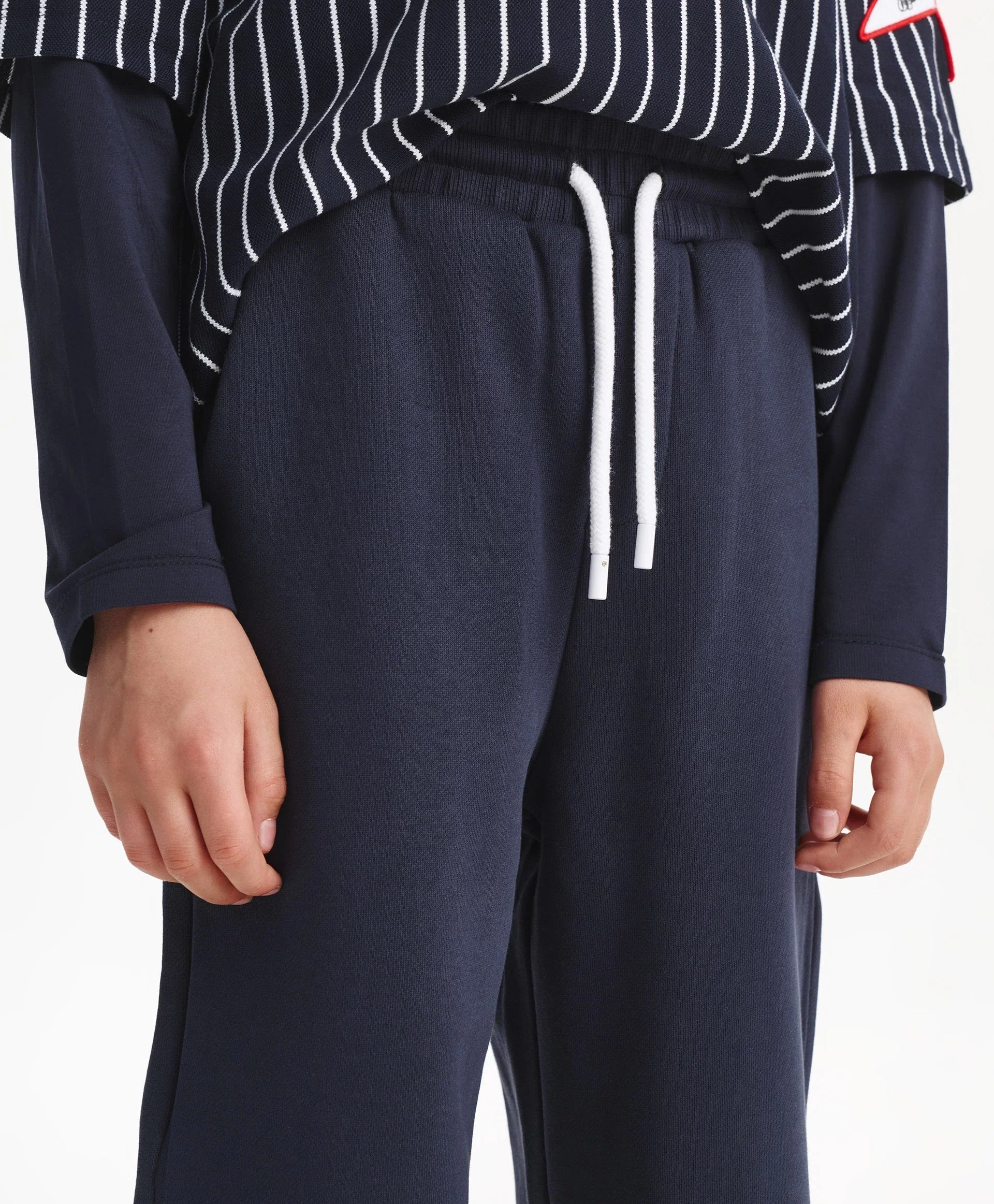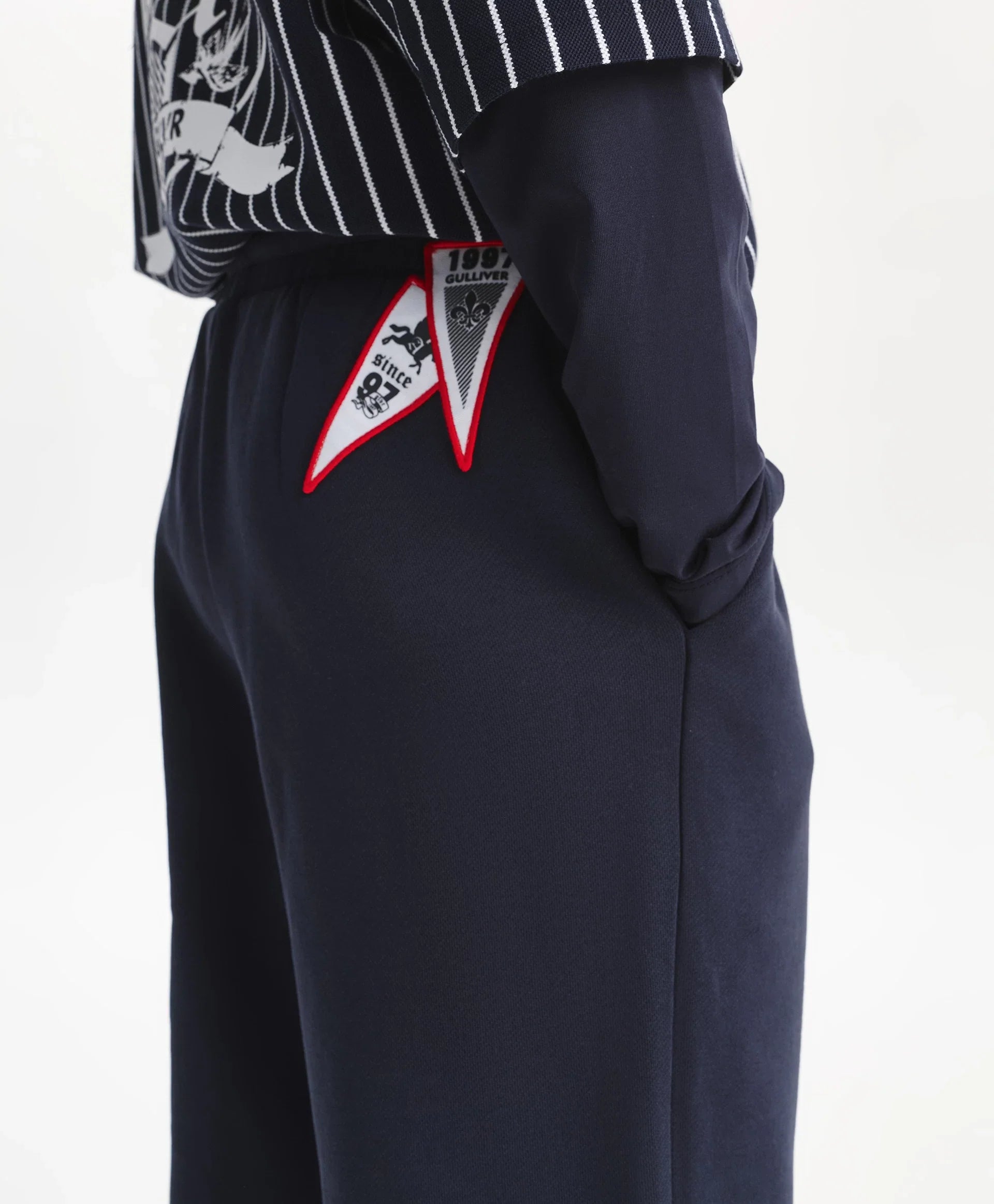 Сините панталони с права свободна кройка от памучен футер с вътрешен мъх са must-have в практичния есенно-зимен гардероб. Ластичен колан с връзки за комфортна посадка, странични коси джобове. Отзад има малка нашивка в стил колекцията Gulliver „Колеж“.