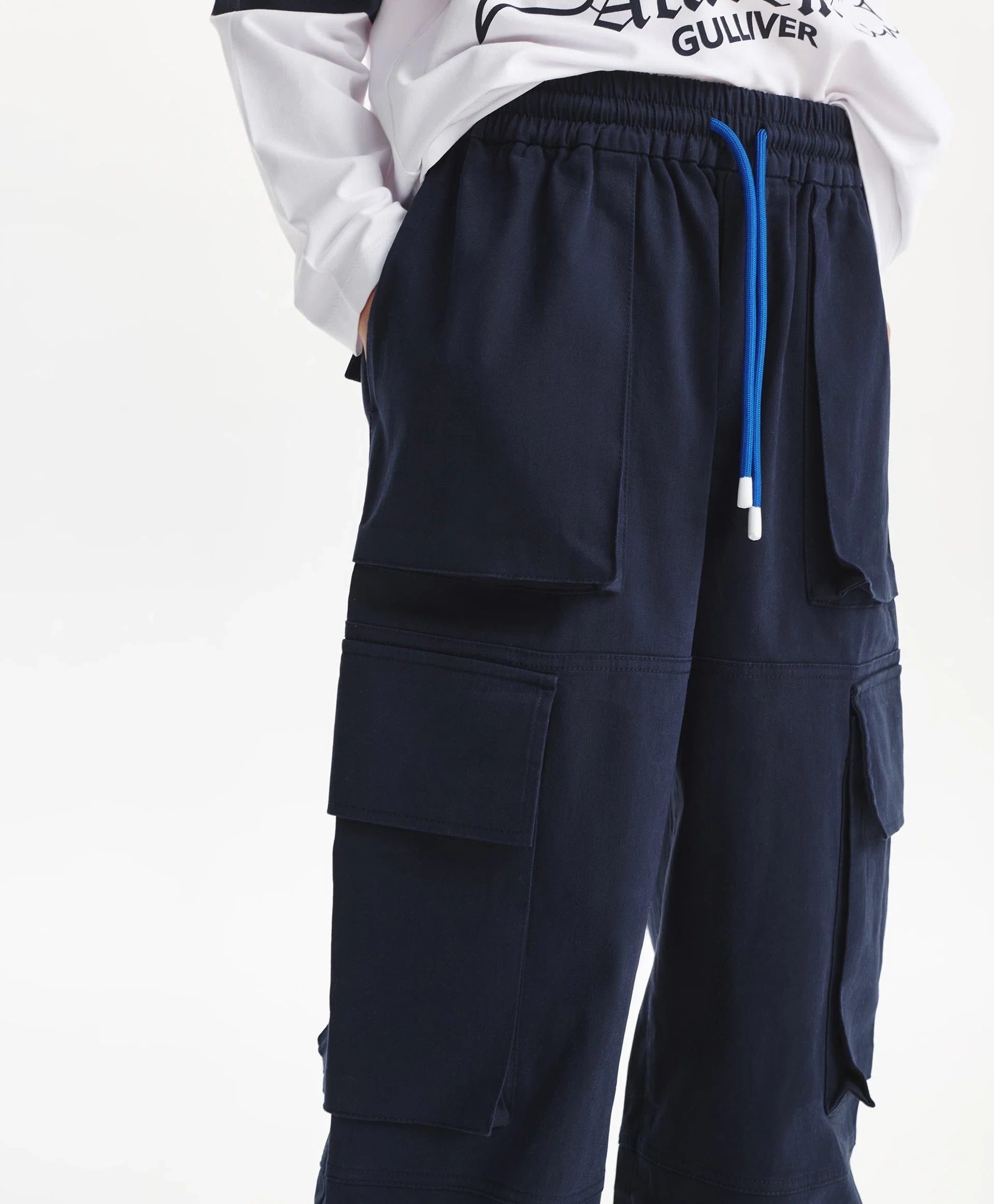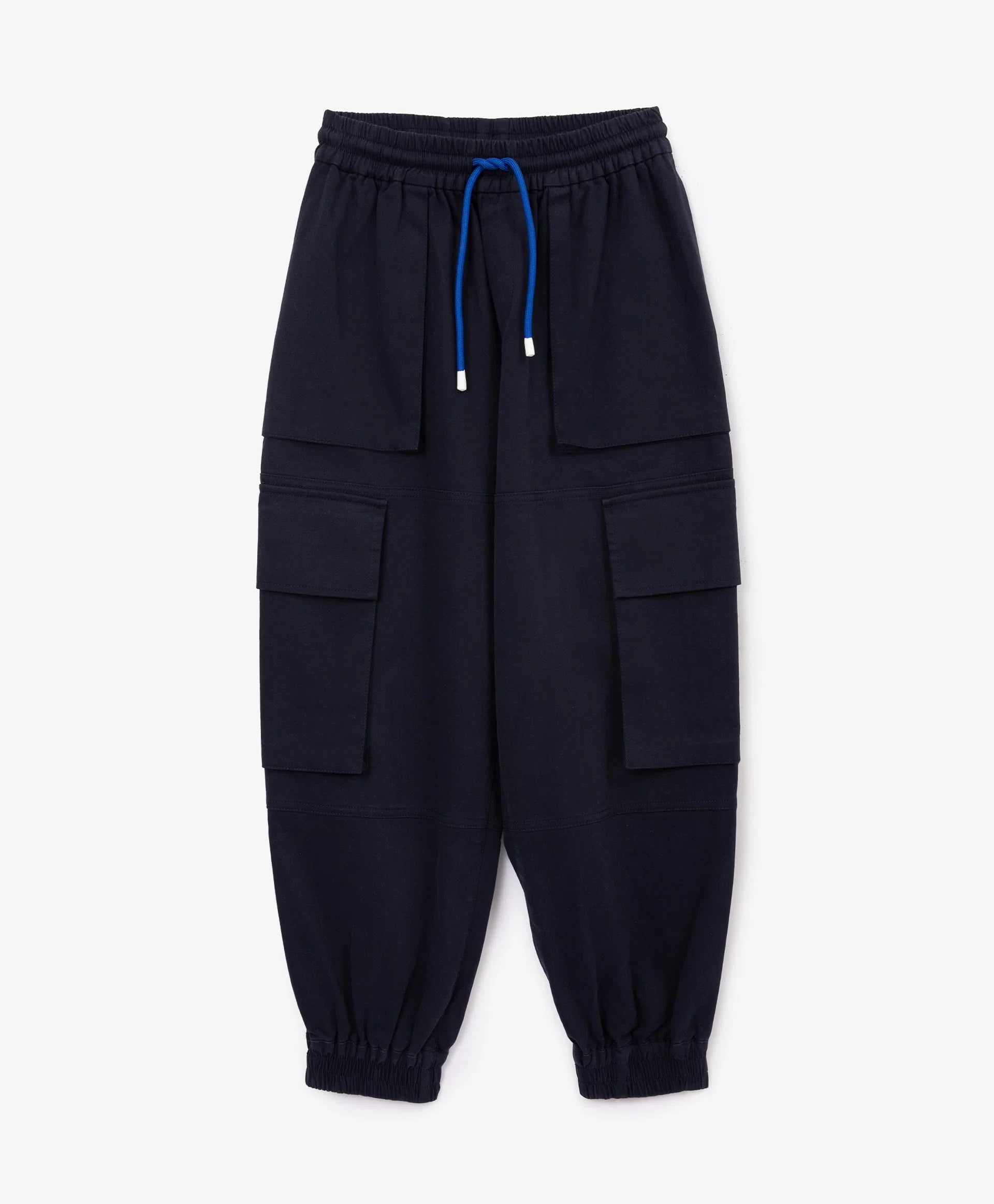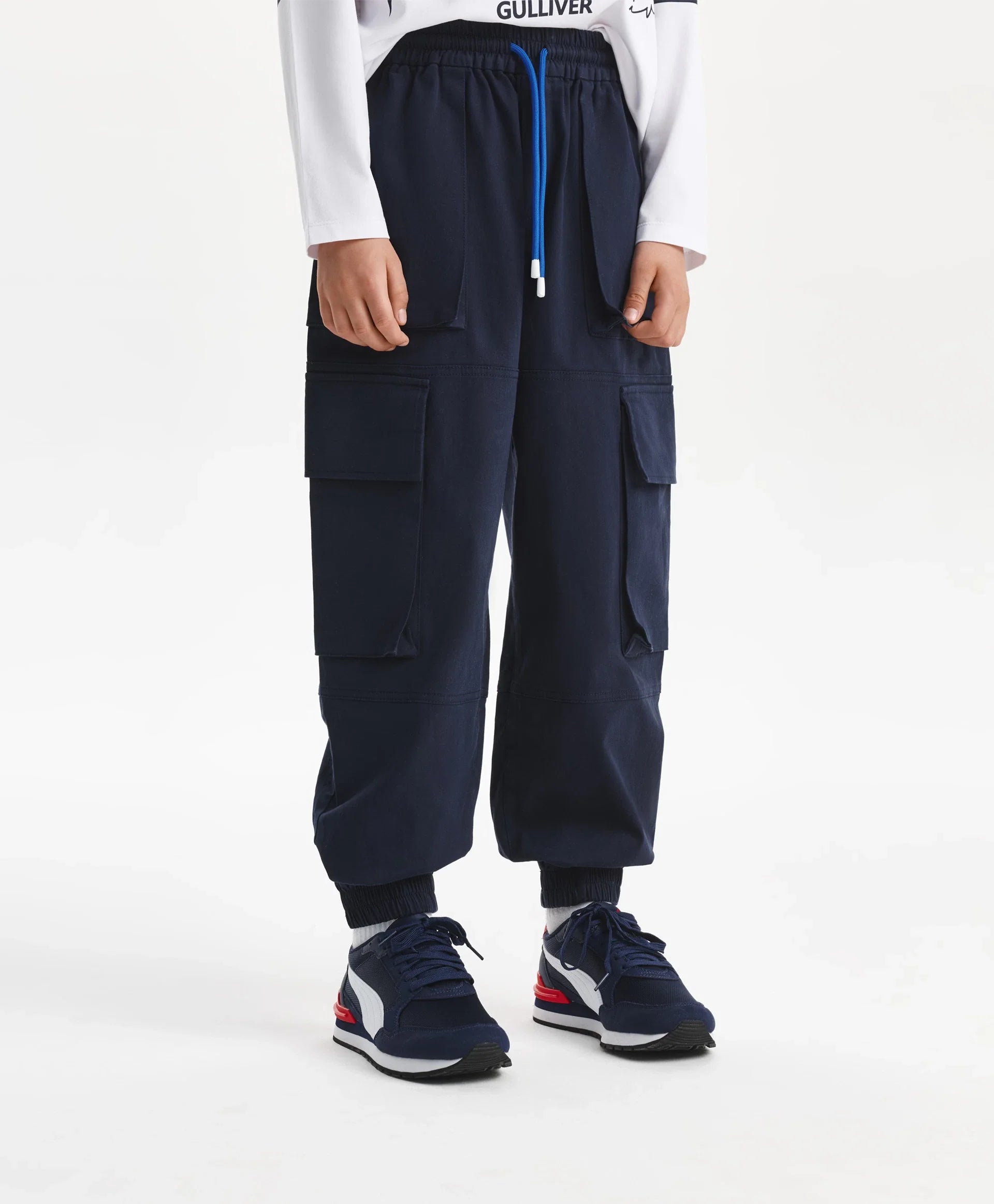 Сините панталони-джогъри са основа на практичния есенен гардероб на момчето. Изработени от плътен памучен текстил, устойчив на форма. Акцент са големите функционални карго джобове, придаващи модерен небрежен вид и енергична визия. Странични нашити джобове и ластичен колан с връзки осигуряват удобство. Фалшиви капаци отзад балансират детайлите.