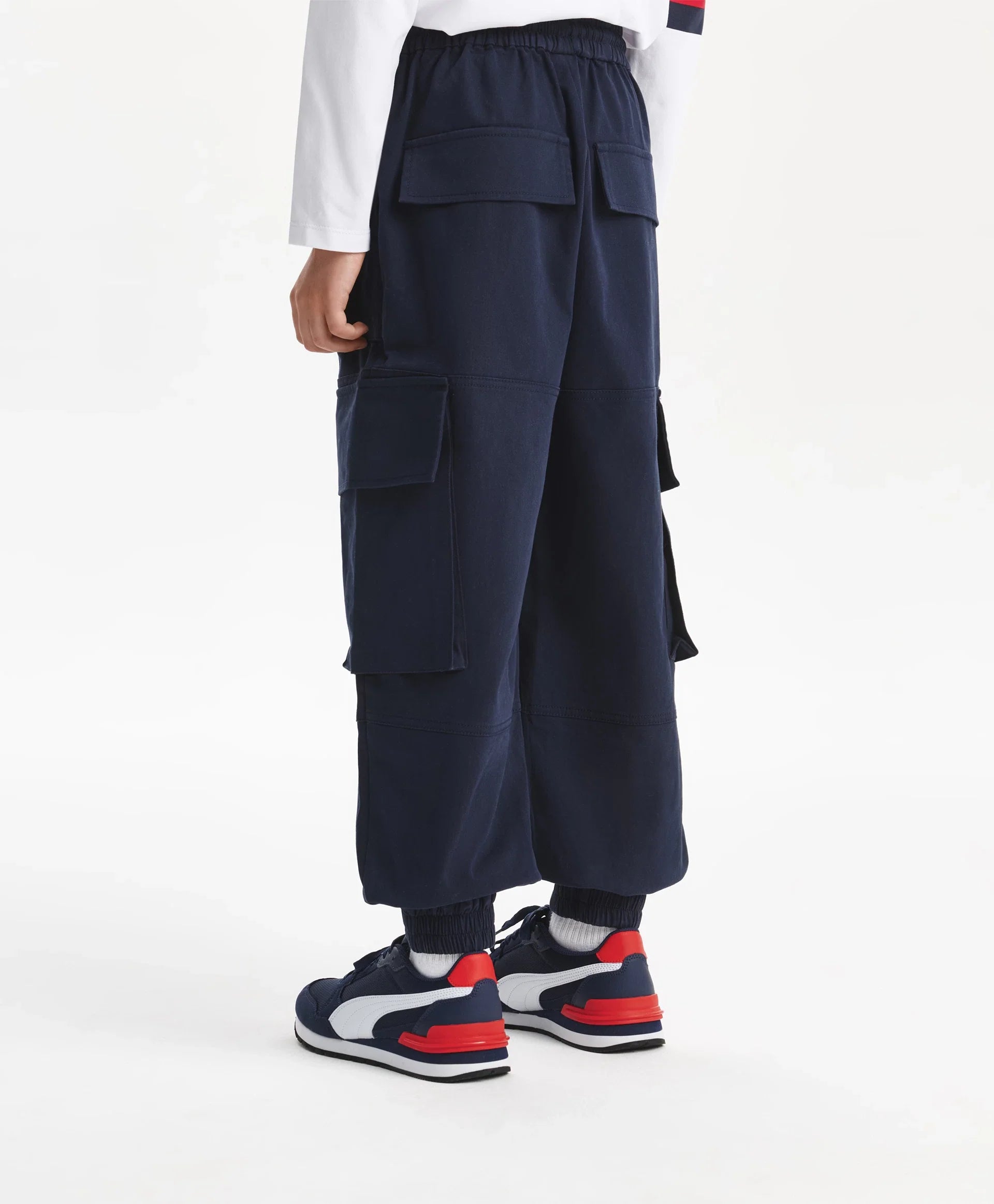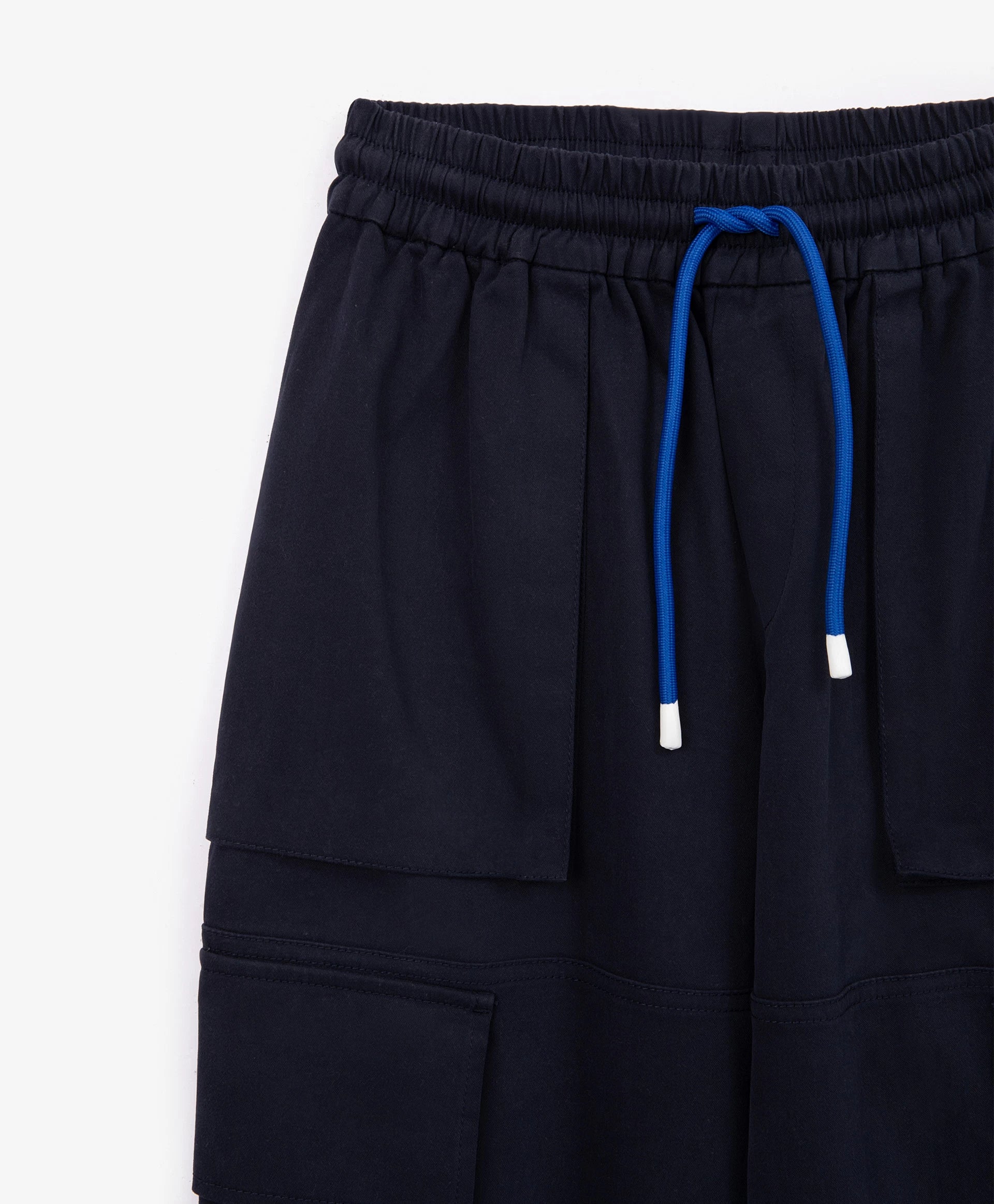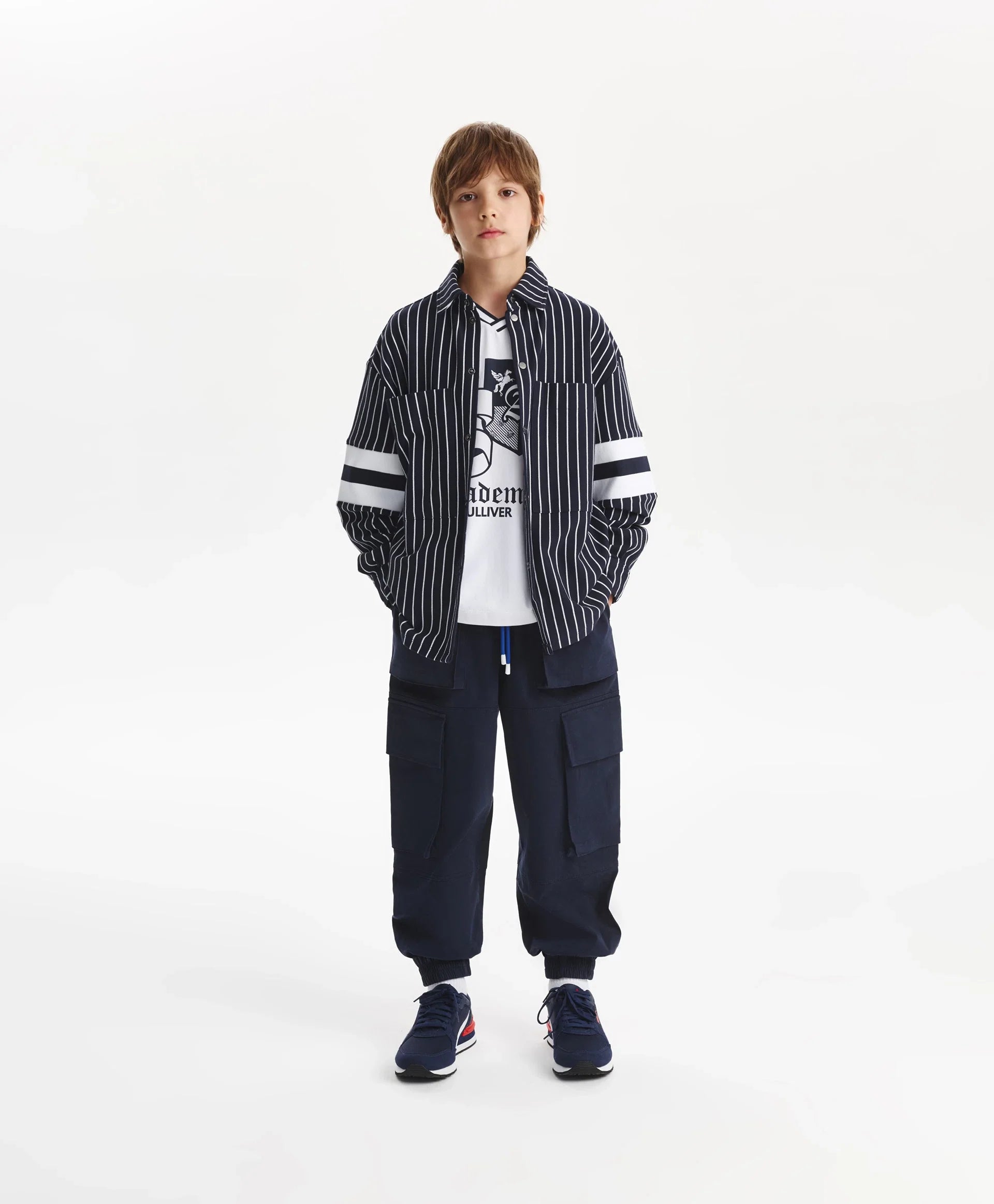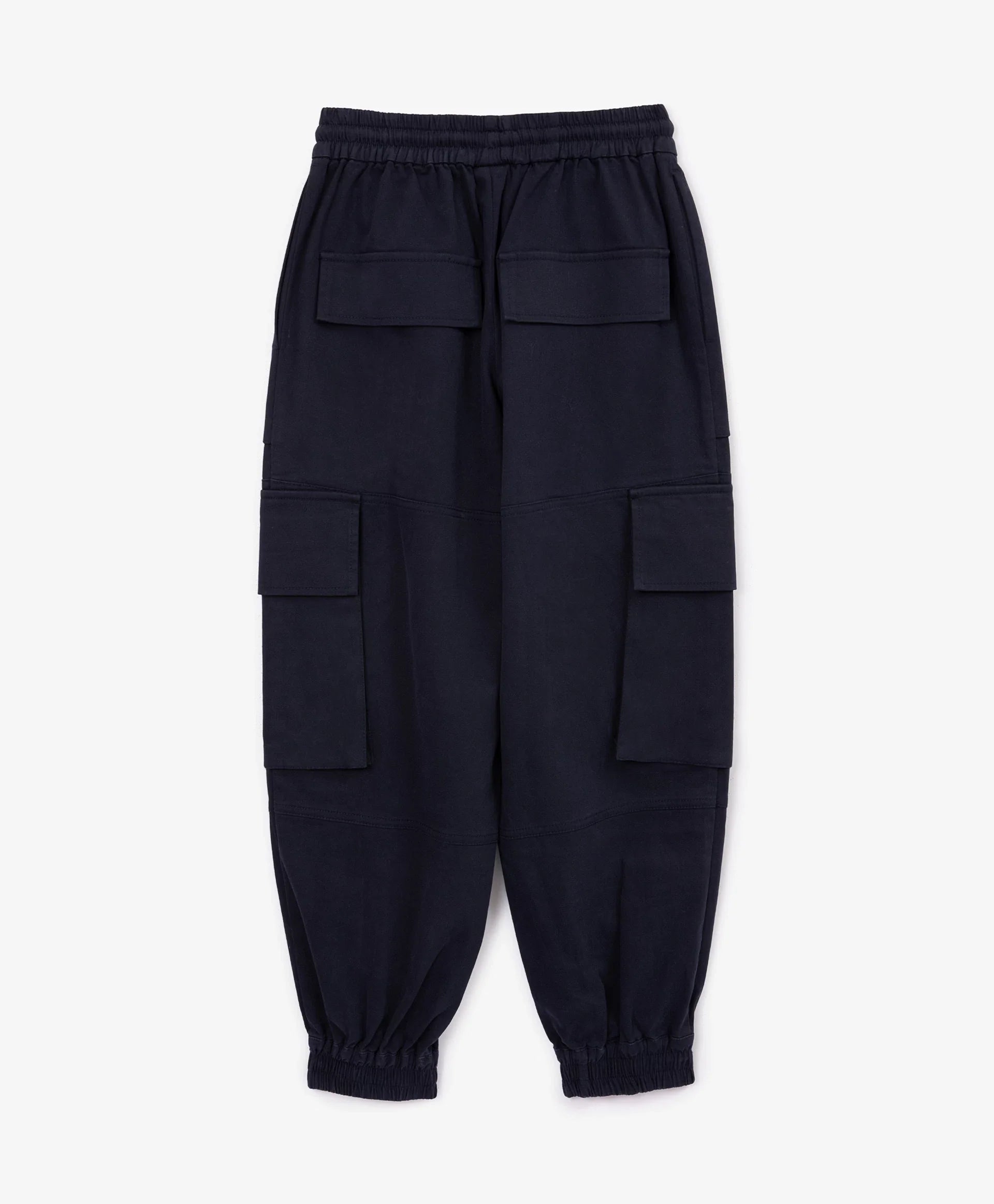 Сините панталони-джогъри са основа на практичния есенен гардероб на момчето. Изработени от плътен памучен текстил, устойчив на форма. Акцент са големите функционални карго джобове, придаващи модерен небрежен вид и енергична визия. Странични нашити джобове и ластичен колан с връзки осигуряват удобство. Фалшиви капаци отзад балансират детайлите.